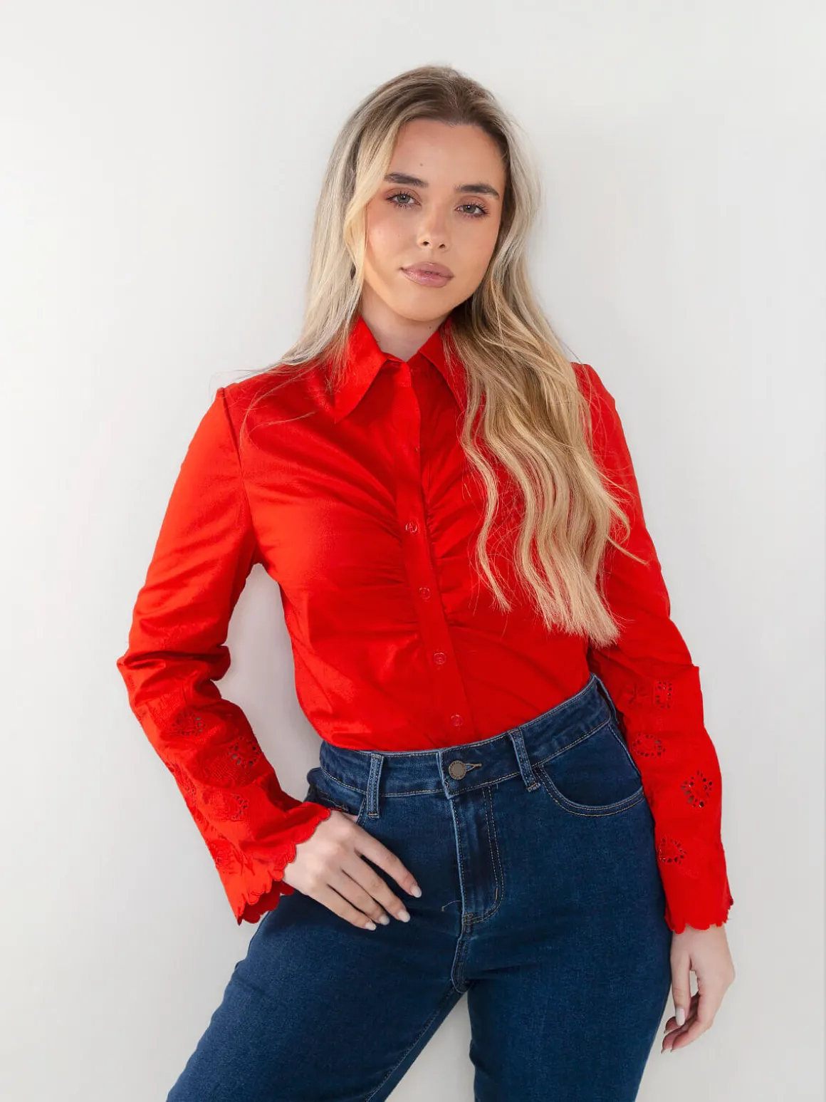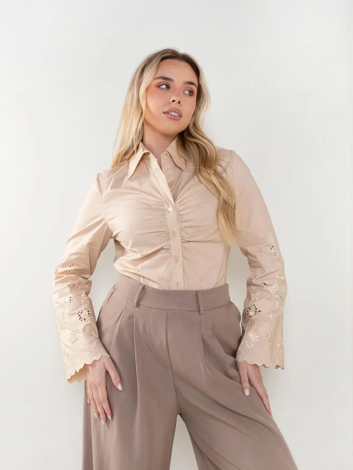 Camisa de manga comprida com detalhe franzido frontal e mangas bordadas com acabamento delicado. Modelo com colarinho clássico e fecho de botões, ideal para looks elegantes e femininos, do trabalho ao dia a dia. Combina facilmente com calças de alfaiataria ou ganga.Altura da Modelo: 166 cm | Tamanho: S