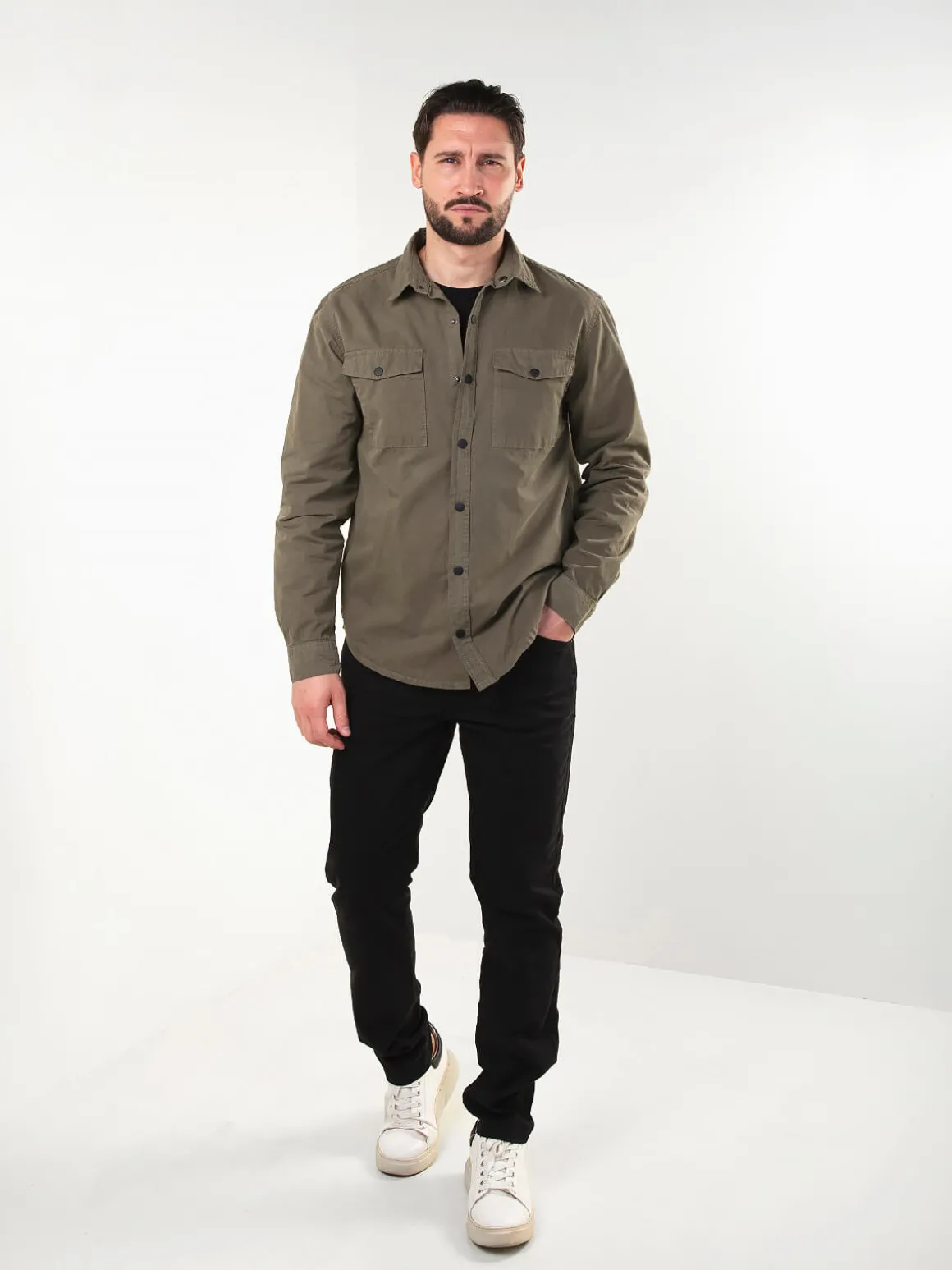 Camisa em sarja verde tropa com botões de pressão e 2 bolsos frontais. Modelo prático e confortável que resulta bem fechada para um look arrumado sem esforço.Altura do Modelo: 180 cm | Tamanho: M