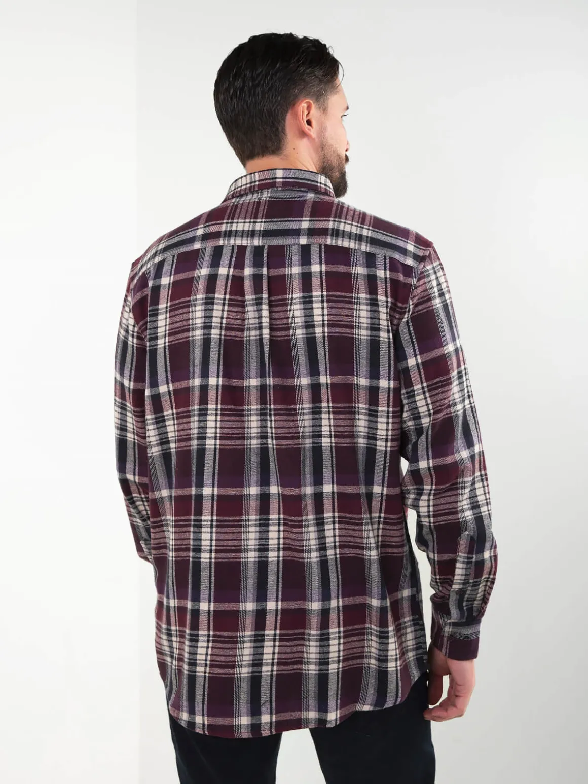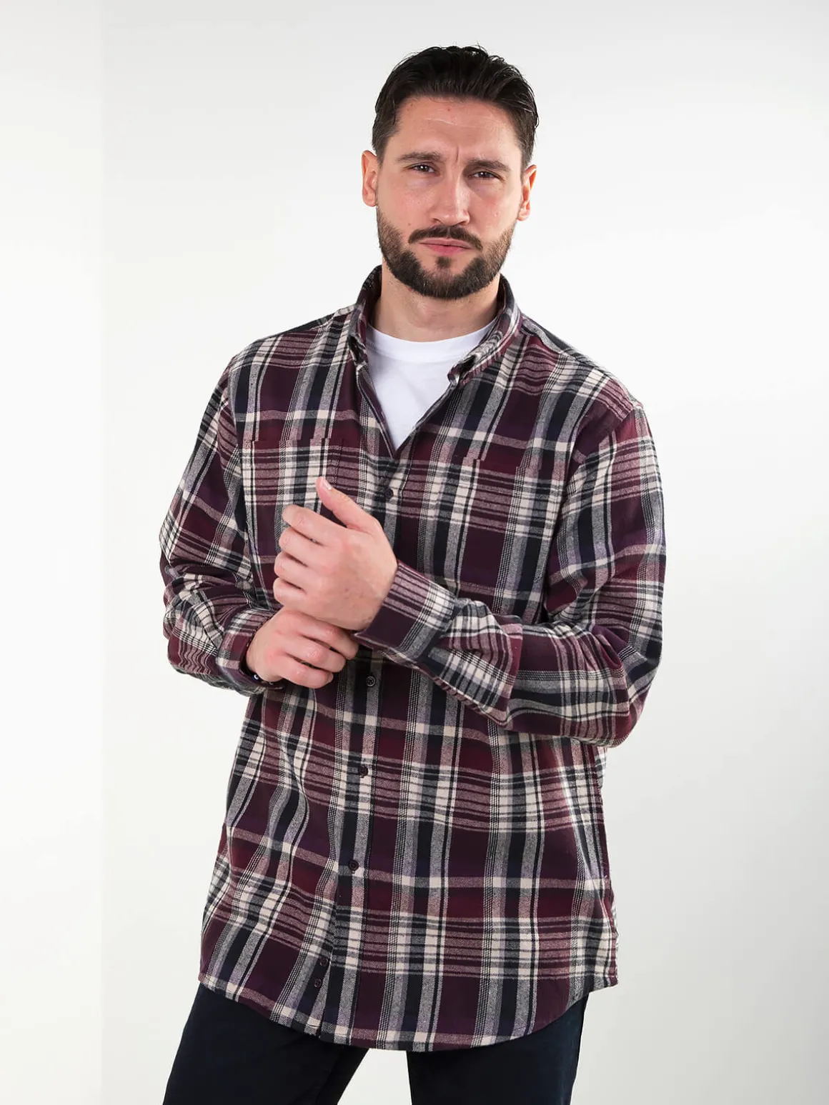 Camisa de flanela bordeaux em 100% algodão, manga comprida, colarinho americano e punhos abotoados. Modelo com bolso no peito e aperto frontal de botões. Combina com ganga escura ou calças chino castanhas para um look casual de inverno.Altura do Modelo: 180 cm | Tamanho: L