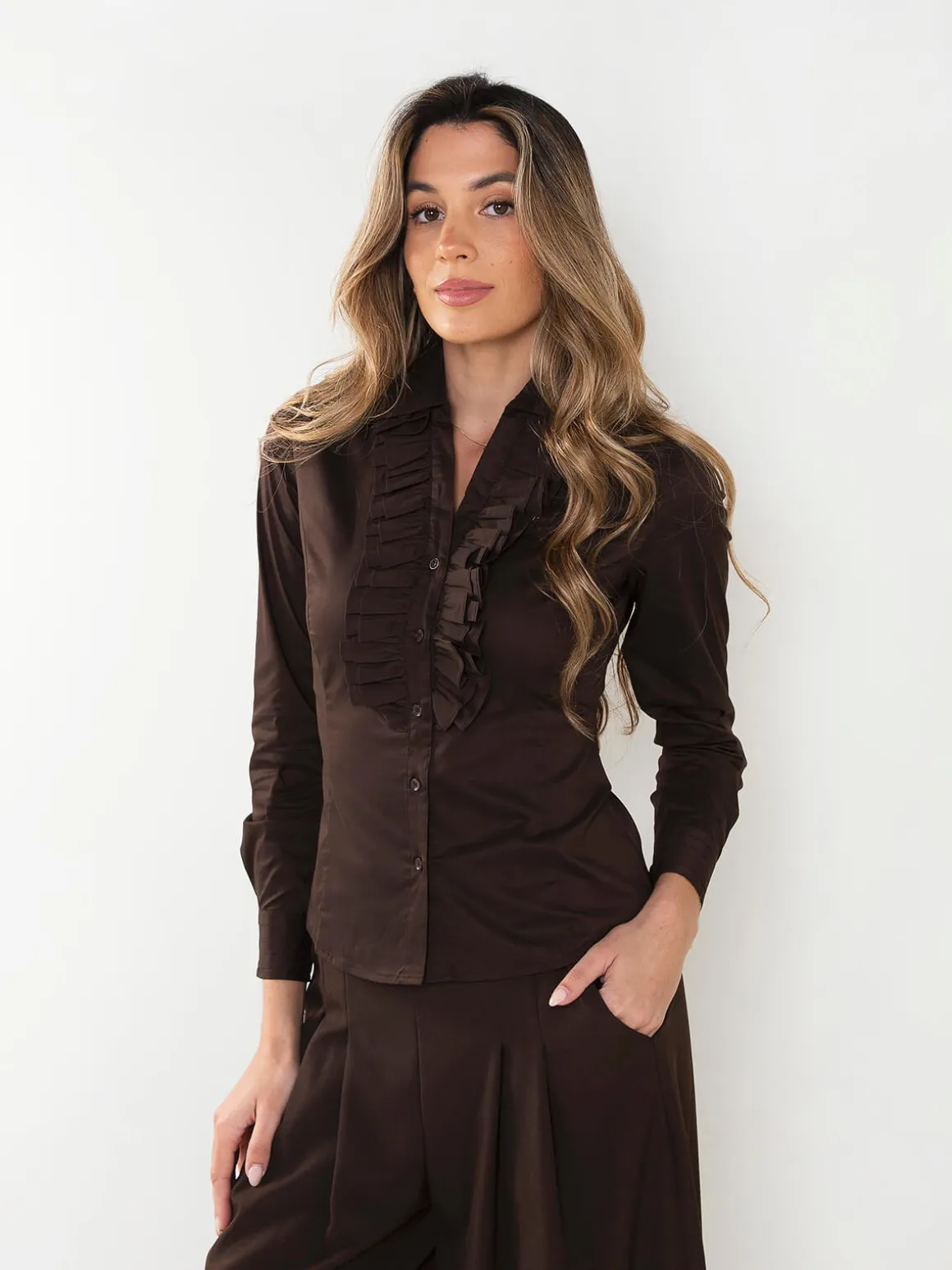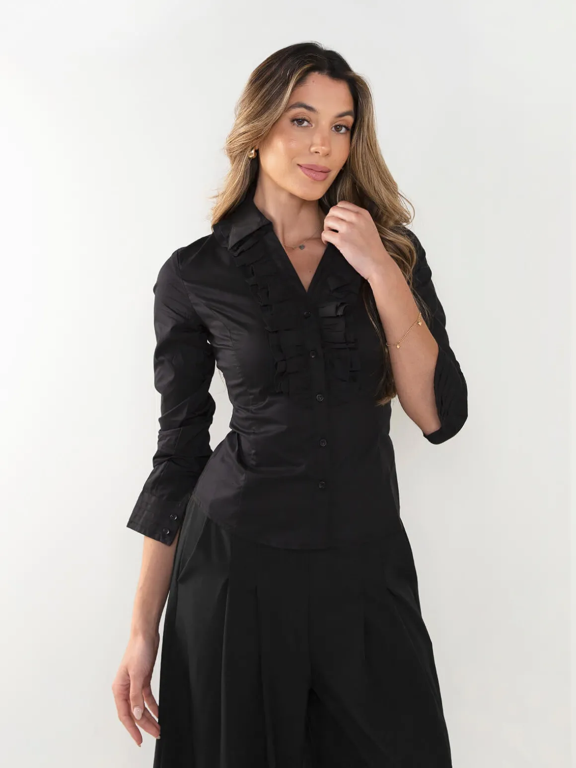 Camisa de manga comprida com folhos aplicados frente. Camisa cintada com punhos abotoados. Gola abas e abertura. Aperto frontal de botões. Altura da Modelo: 163 cm | Tamanho: M