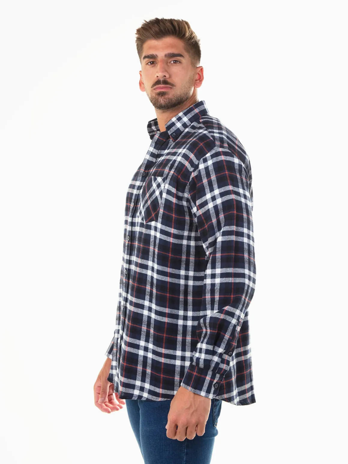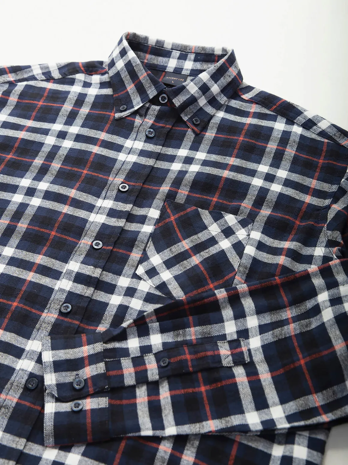 Camisa de flanela para homem em 100% algodão, com padrão xadrez clássico. Modelo de manga comprida com bolso no peito, punhos abotoados e aperto de botões à frente. O colarinho americano dá um toque descontraído e versátil, perfeito para conjugar tanto em looks casuais como em outfits mais arrumados.Altura do Modelo: 182 cm | Tamanho: L