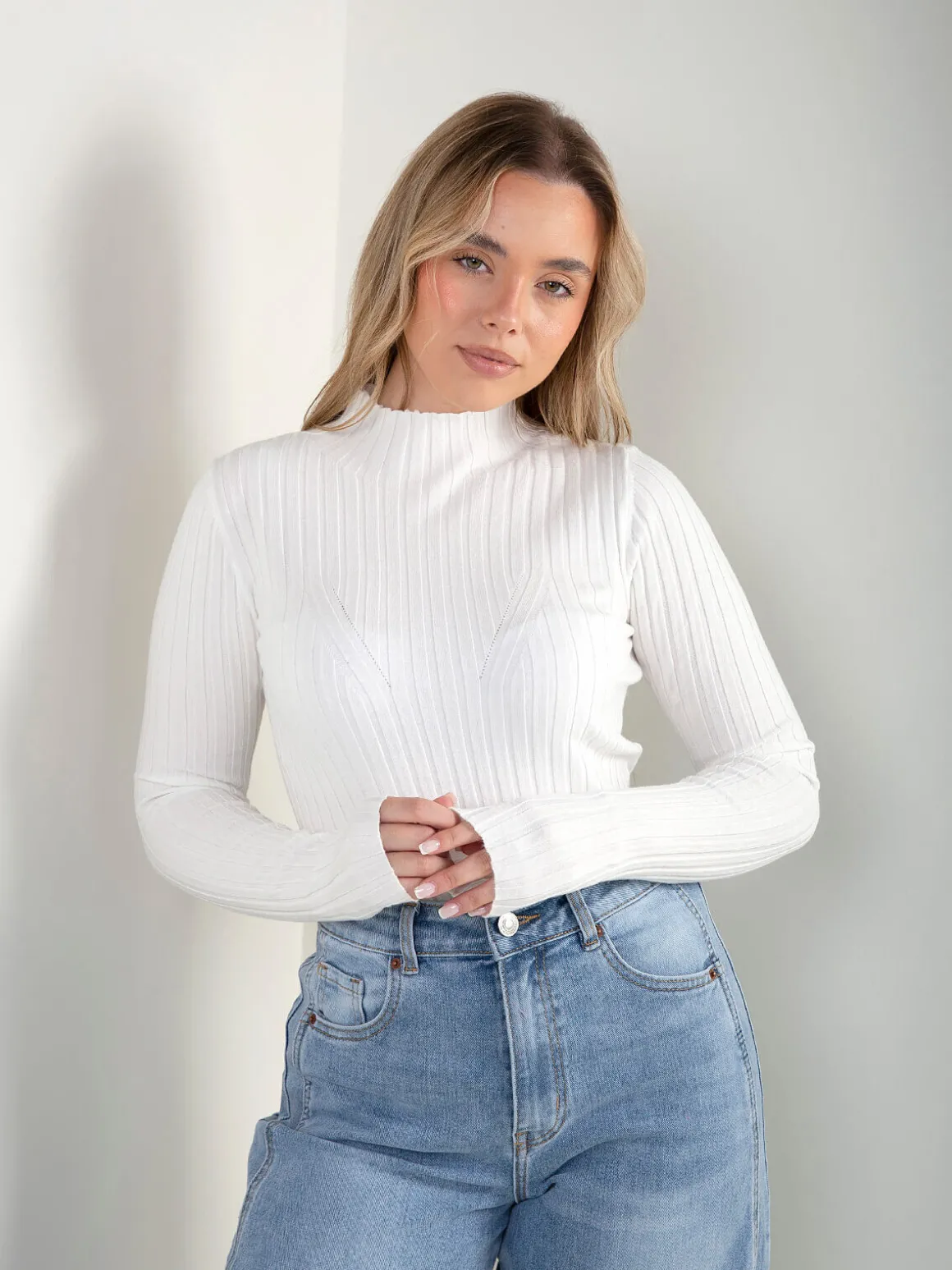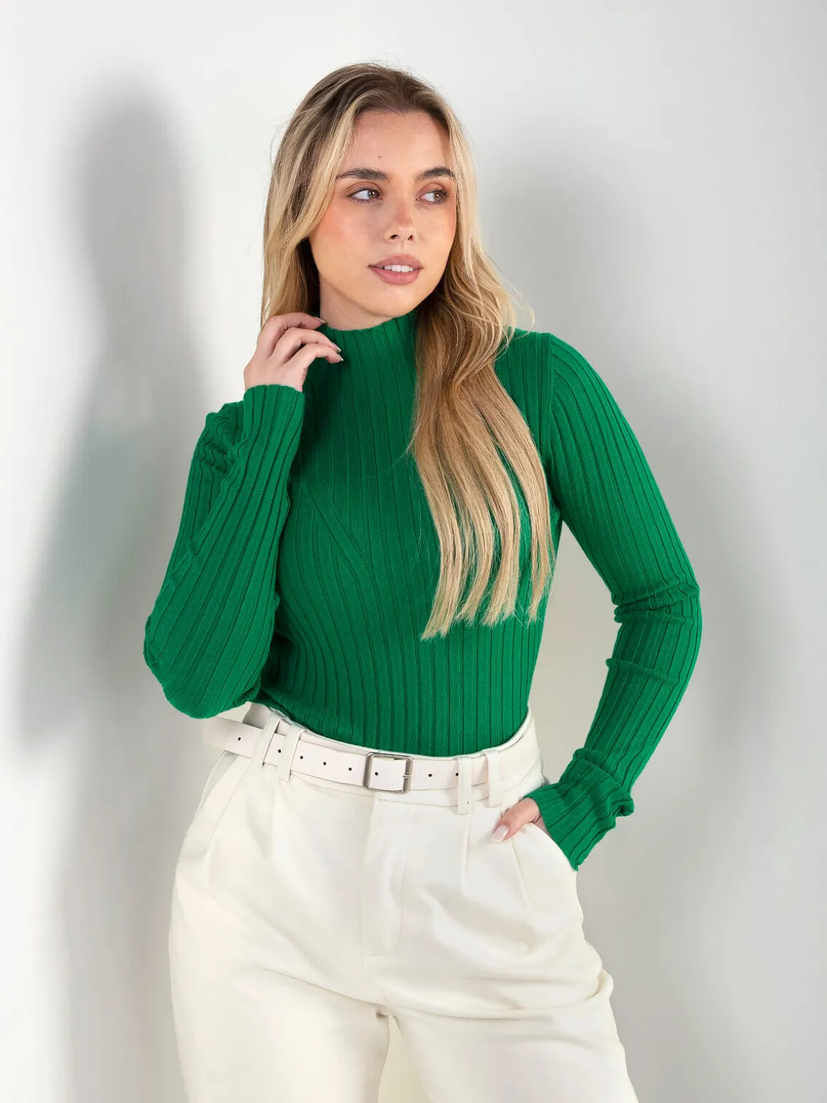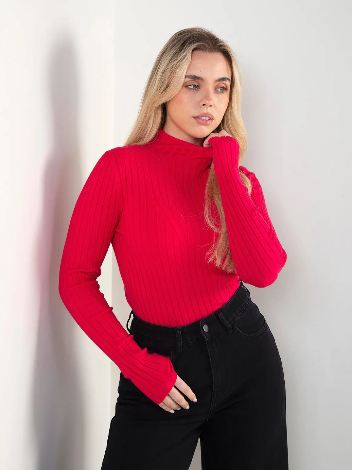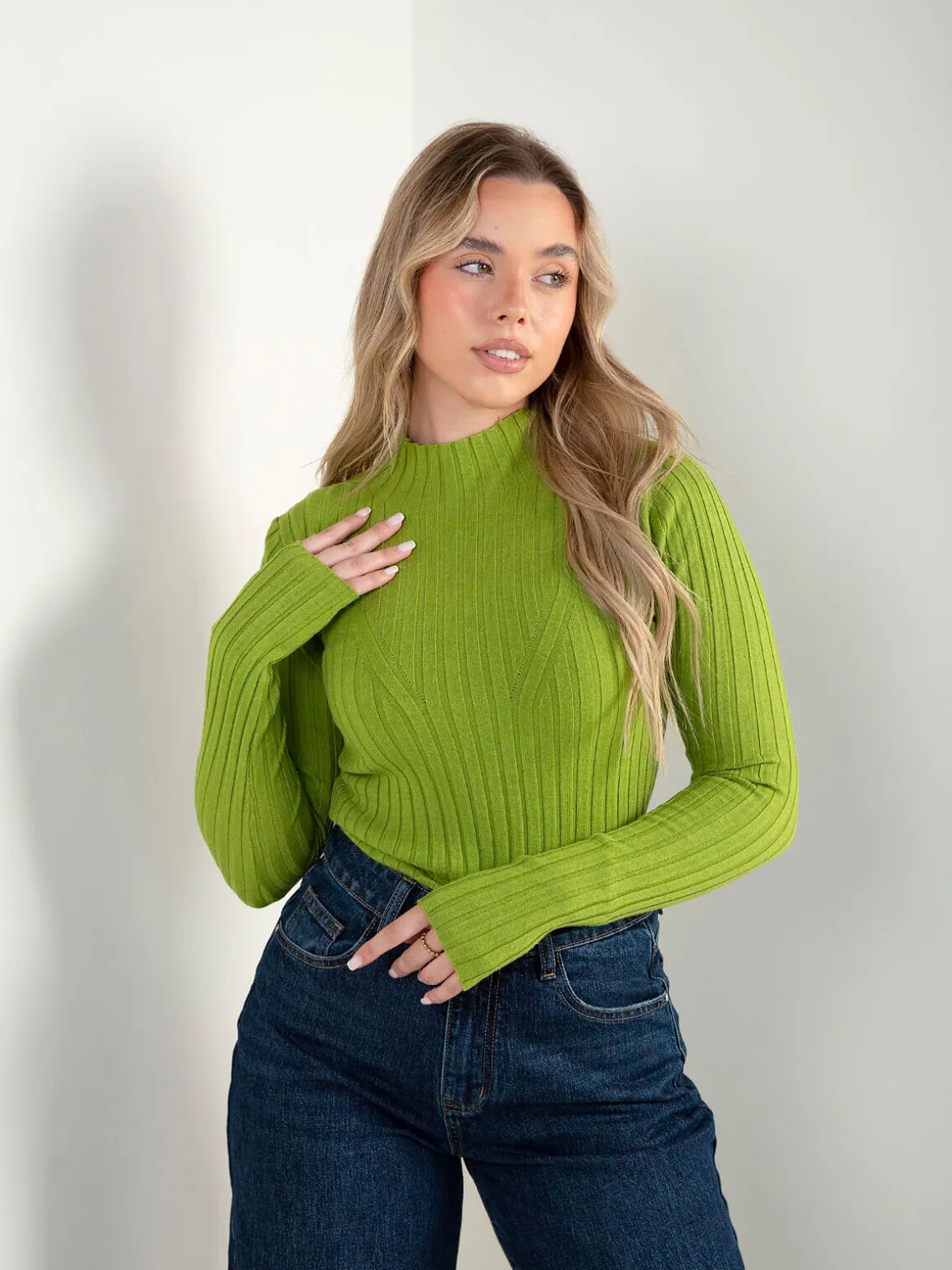 Camisola de malha fina canelada, com gola perkins e detalhe de corte na frente. Macia, confortável é perfeita para combinar com jeans de cintura alta ou calças de alfaiataria. Altura da Modelo: 166 cm | Tamanho: S/M
