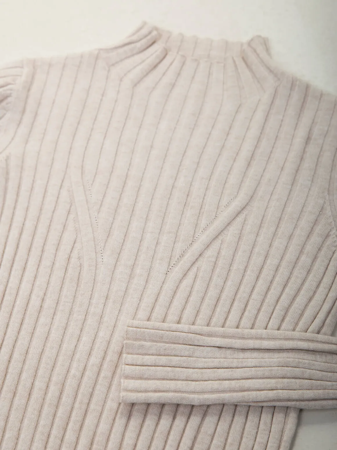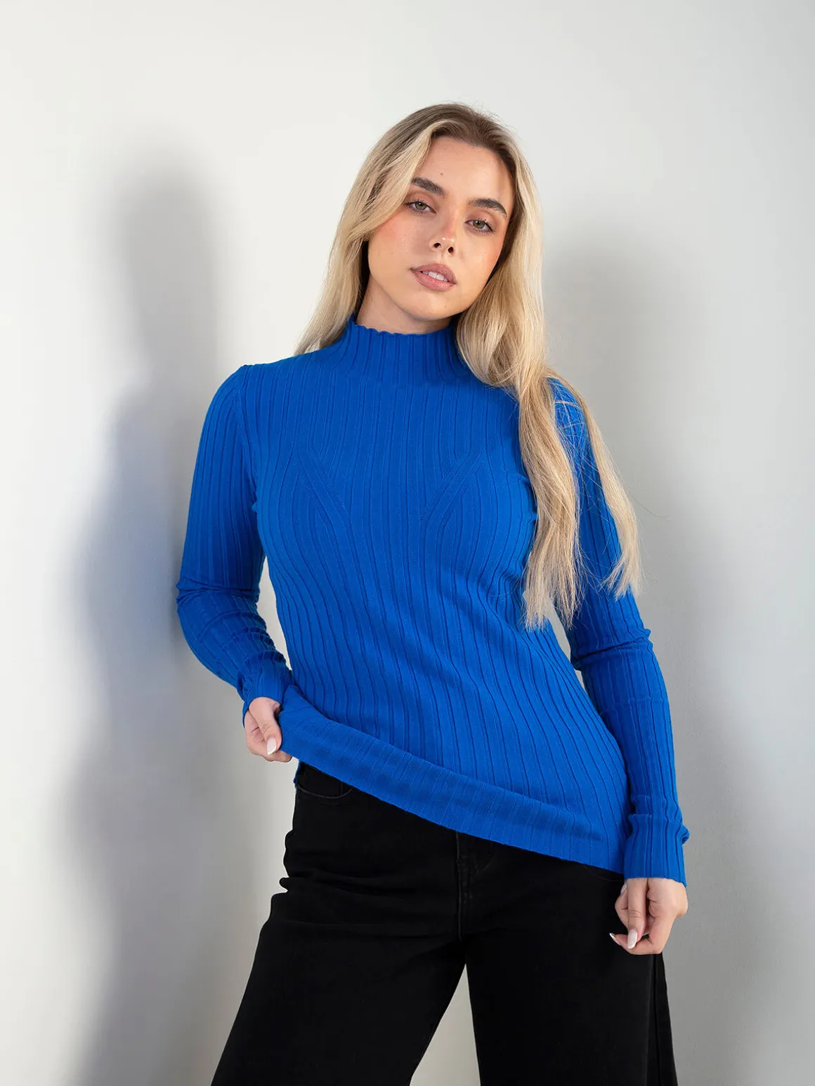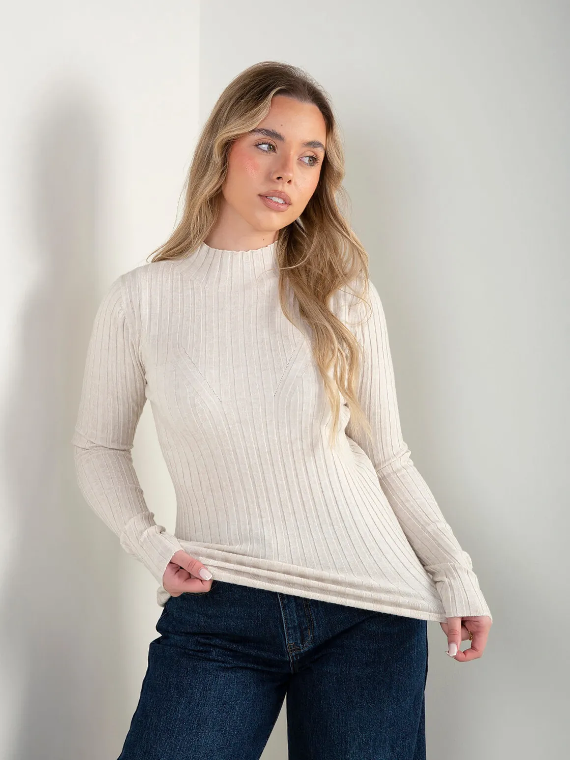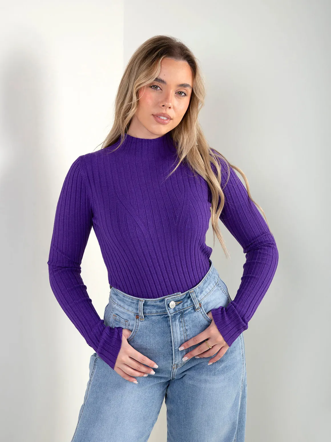 Camisola de malha fina canelada, com gola perkins e detalhe de corte na frente. Macia, confortável é perfeita para combinar com jeans de cintura alta ou calças de alfaiataria. Altura da Modelo: 166 cm | Tamanho: S/M