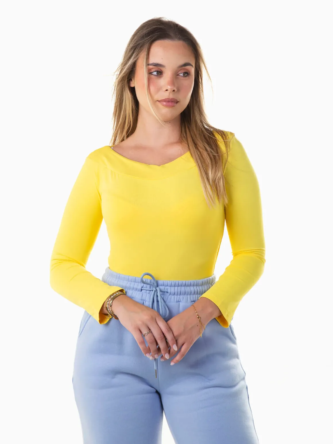 Camisola elástica de manga comprida com decote barco. Camisola justa para senhora.Altura da Modelo: 166 cm | Tamanho: Tamanho Único