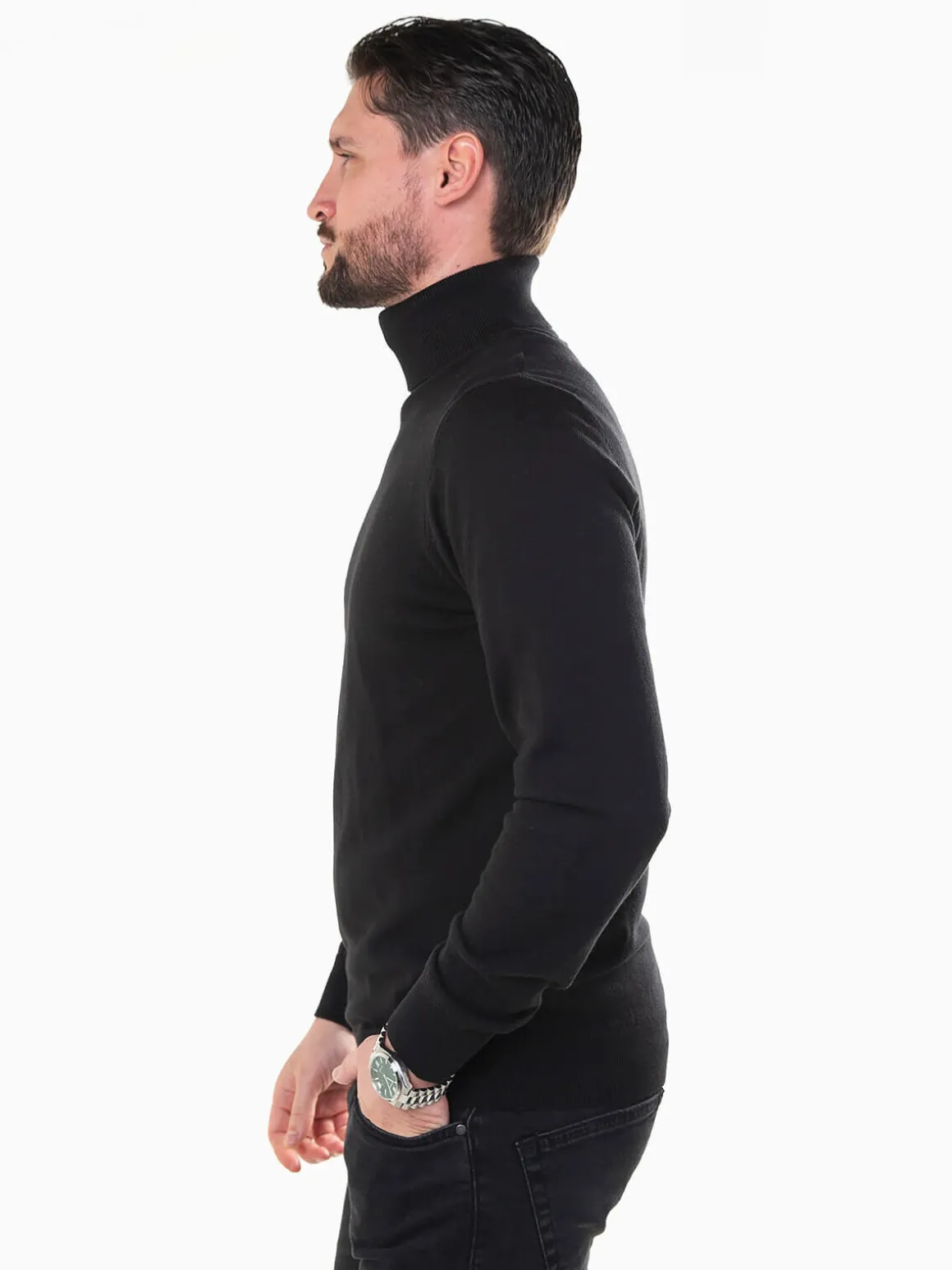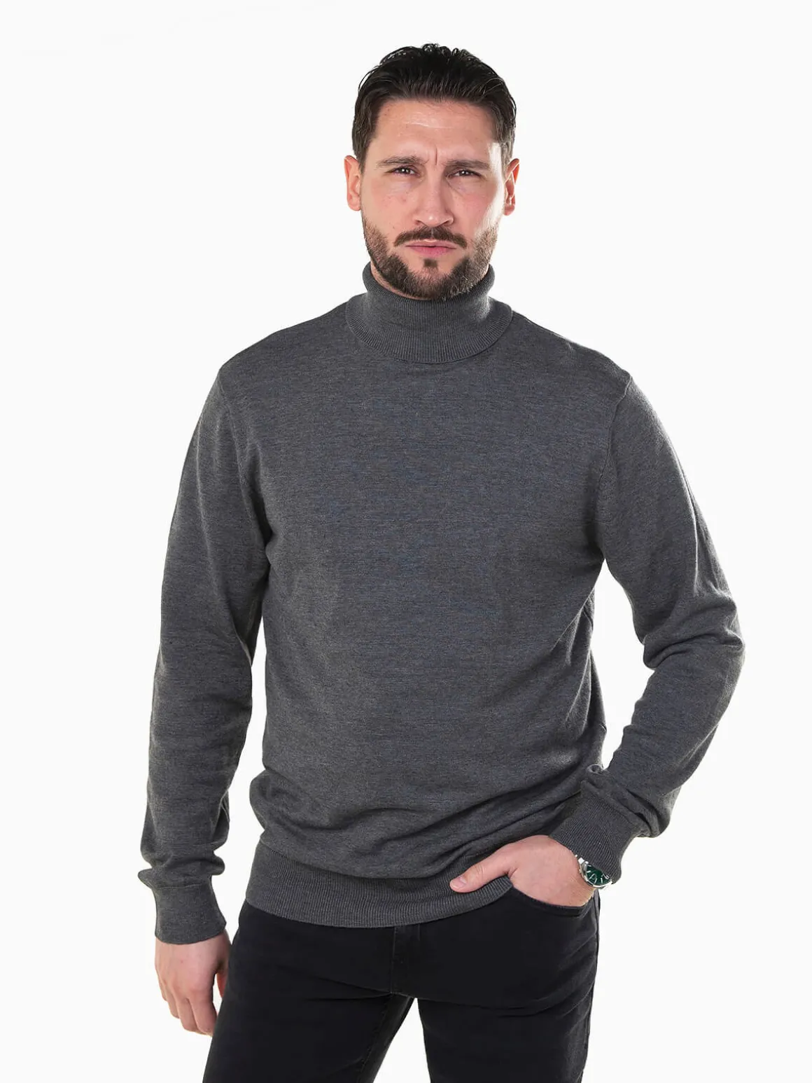 Camisola de malha fina para homem com gola alta de toque suave e corte confortável. Modelo versátil, perfeito para combinar com calças de alfaiataria ou jeans escuros. Altura do Modelo: 180 cm | Tamanho: L