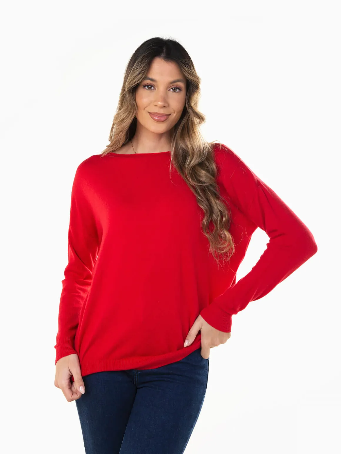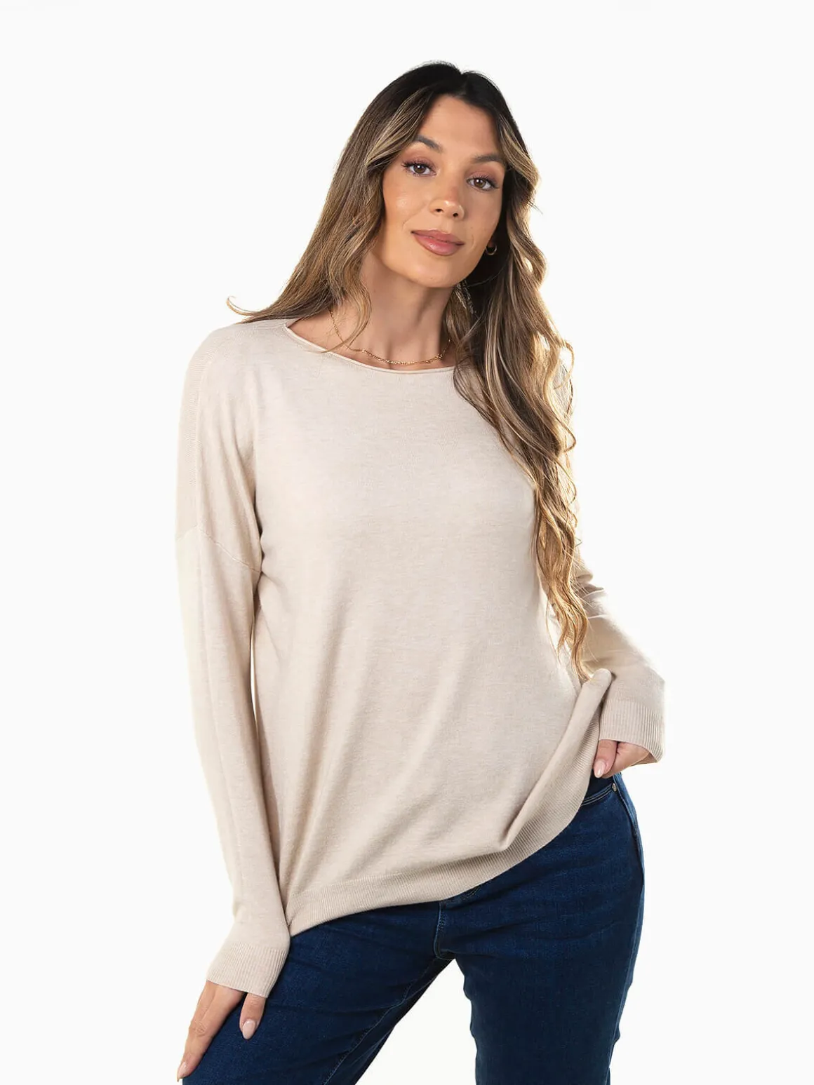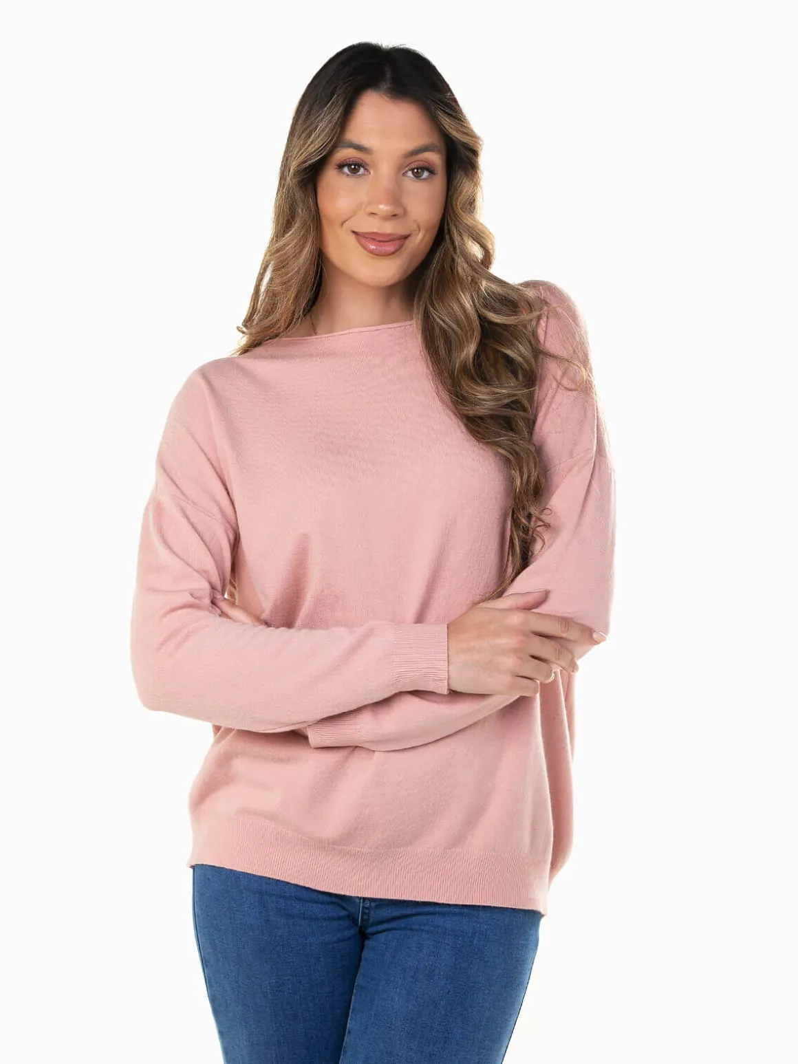 Camisola de malha com acabamento rolling para senhora. Camisola de manga comprida com decote barco e extremidades caneladas. Altura da Modelo: 175 cm | Tamanho: M/L