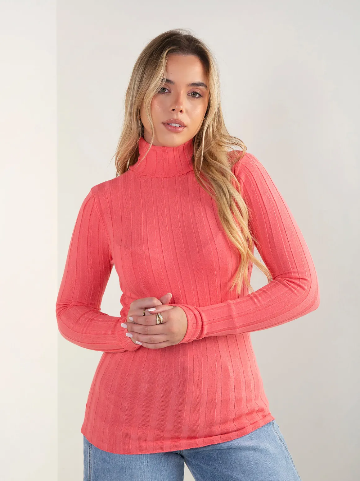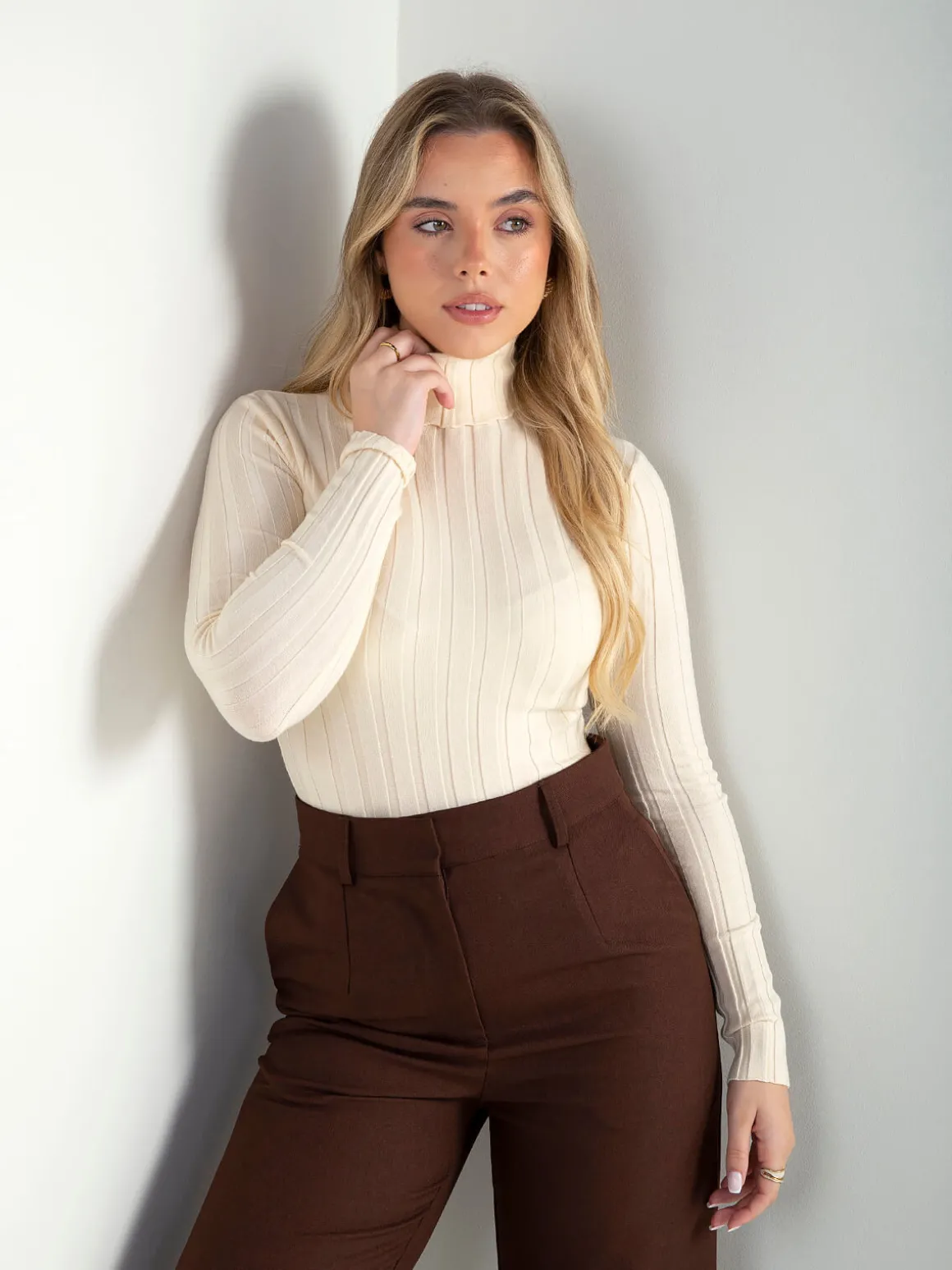 Camisola de malha canelada com gola alta dobrada e manga comprida. Suave e confortável, com corte justo que funciona no dia a dia e combina facilmente com várias peças.Altura da Modelo: 166 cm | Tamanho: S/M