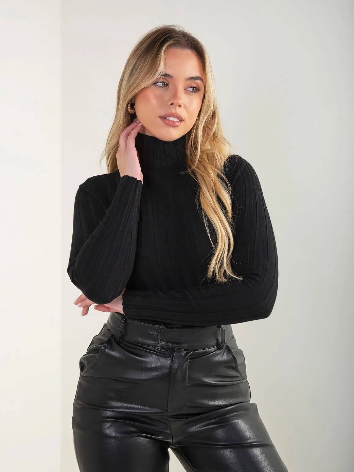 Camisola malha canelada gola alta dobrada