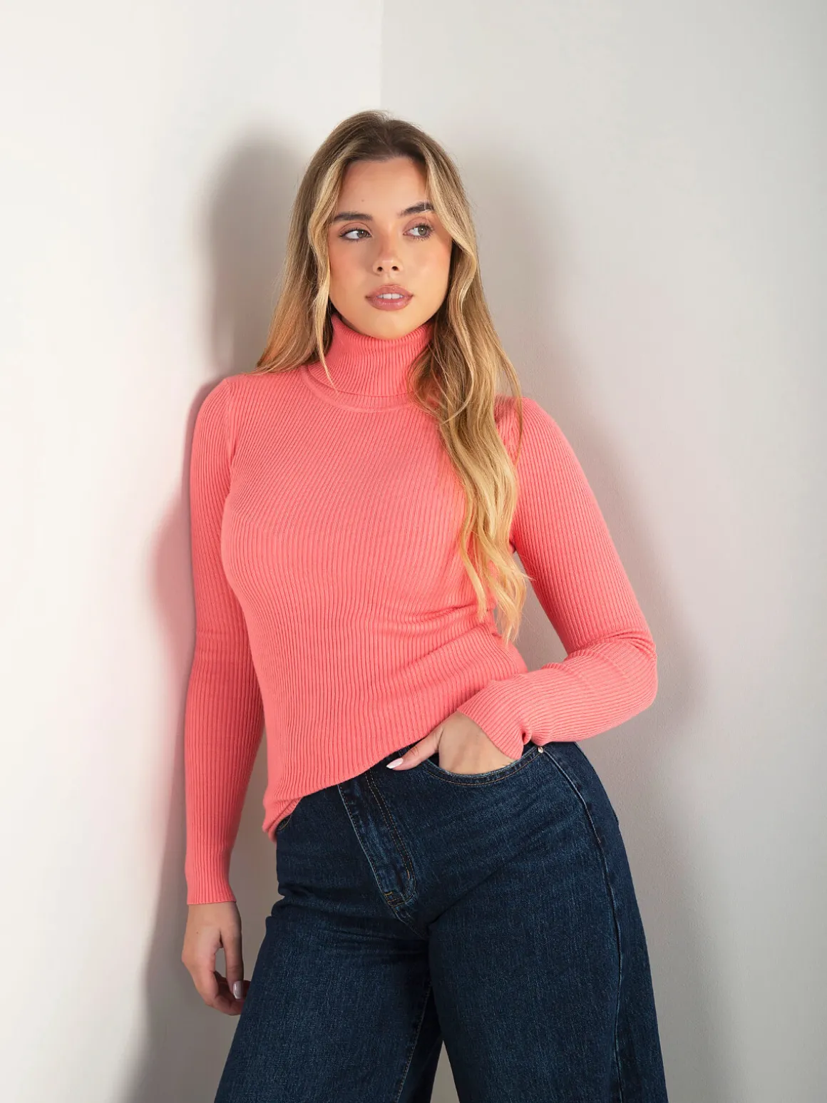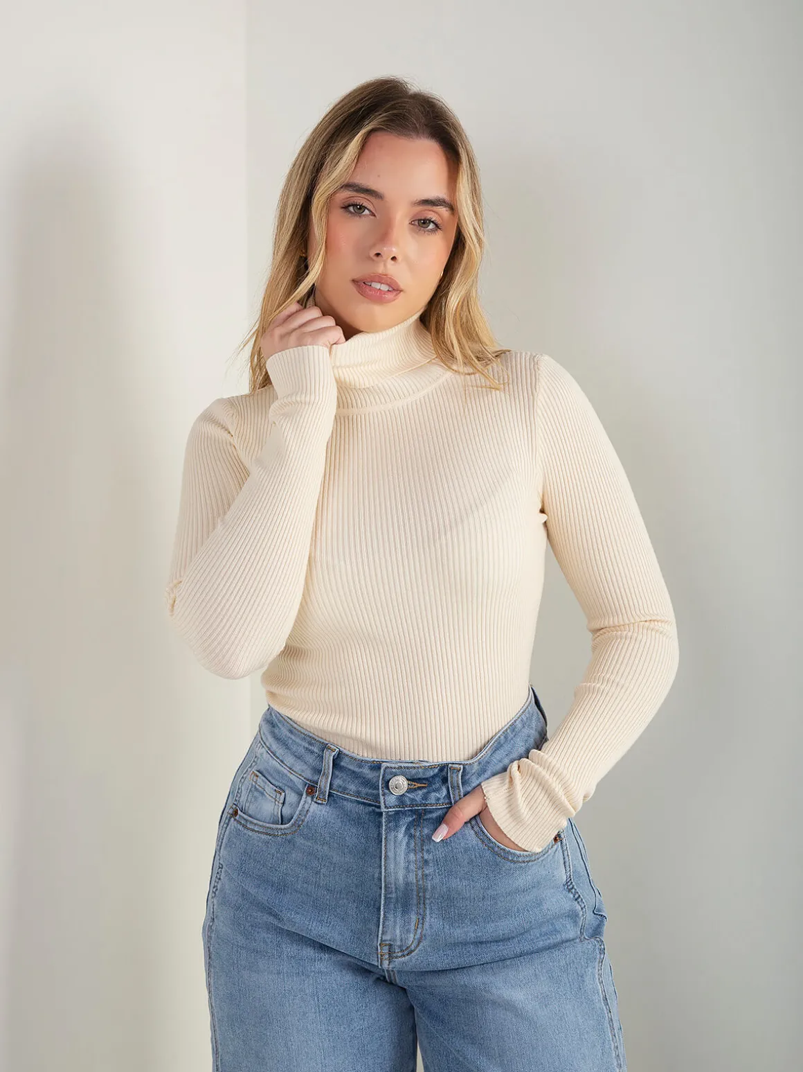 Camisola de malha canelada fina com gola alta e manga comprida. Modelo confortável, suave ao toque e com um caimento ajustado que funciona tanto em looks do dia a dia como em combinações mais sofisticadas.Altura da Modelo: 166 cm | Tamanho: S/M