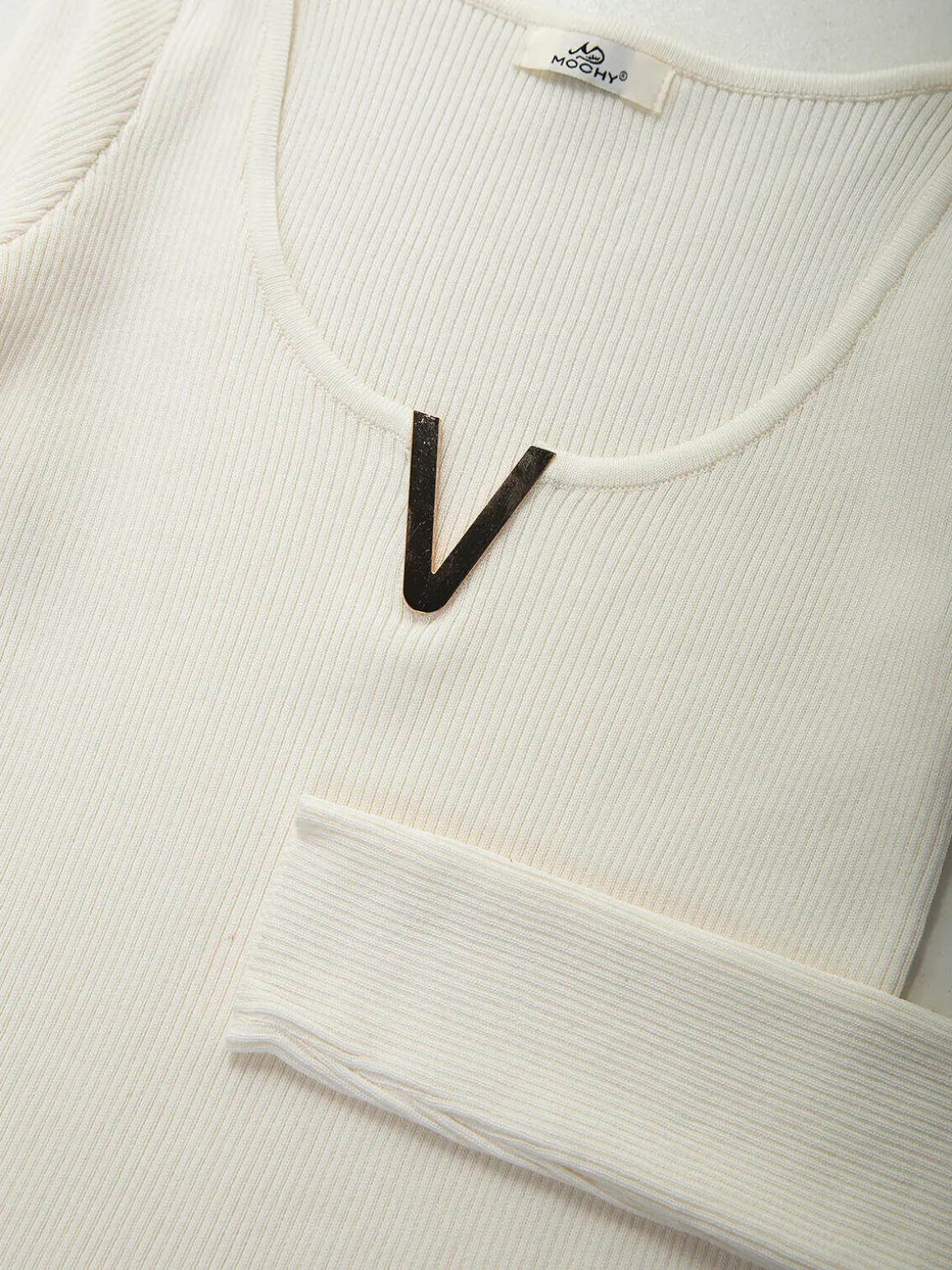 Camisola de malha canelada com decote redondo e abertura em V com chapa dourada. Manga comprida, versátil e perfeita para looks modernos e sofisticados.Altura da Modelo: 166 cm | Tamanho: Tamanho Único