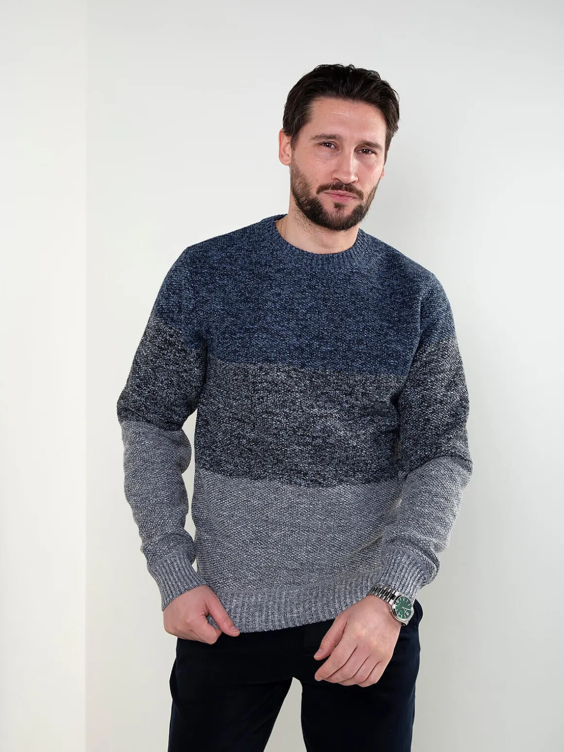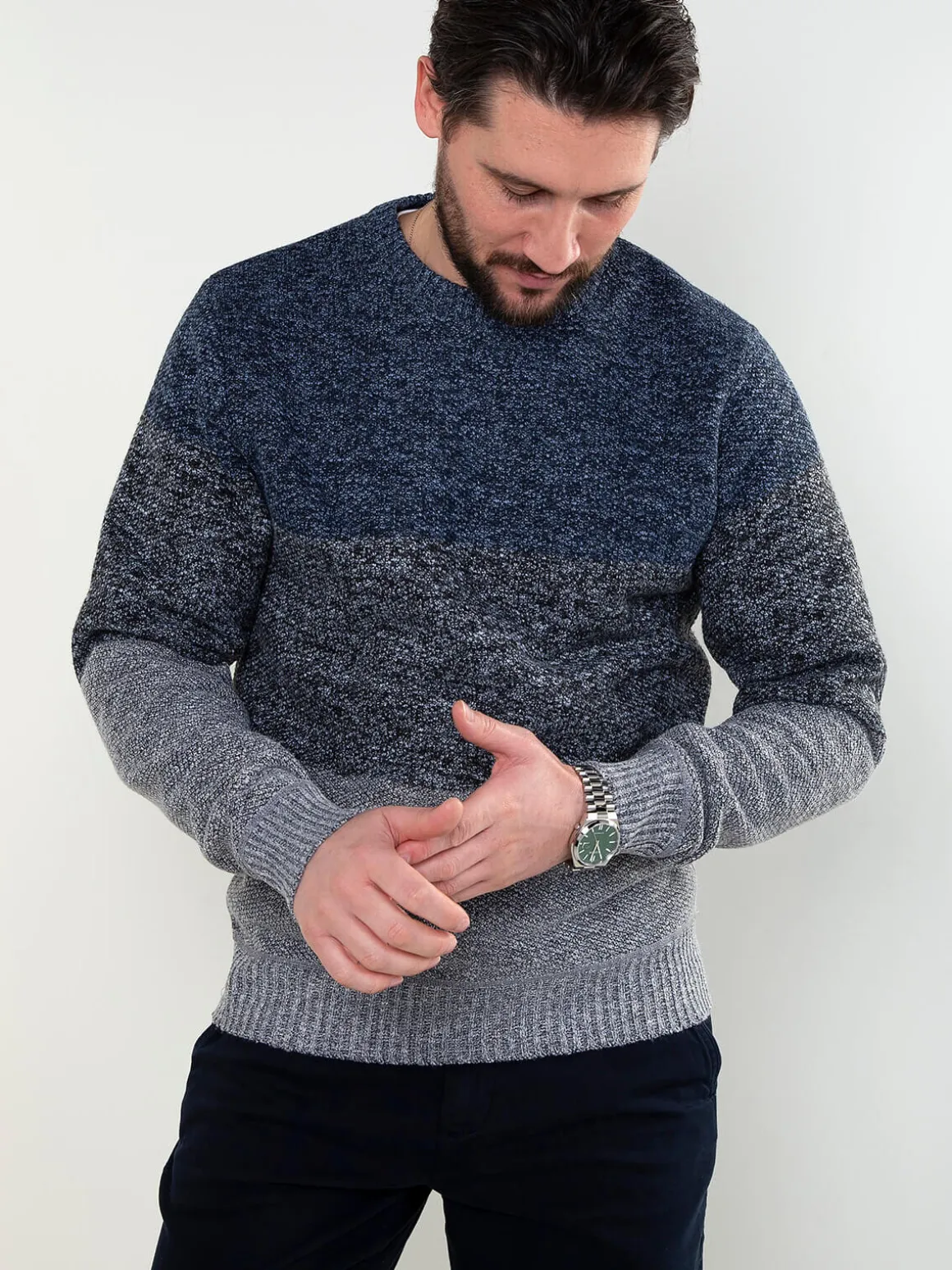 Camisola de malha mesclada azul com interior cardado. Modelo de manga comprida, gola redonda e acabamentos canelados. Interior suave e quente, ideal para os dias frios.Altura do Modelo: 180 cm | Tamanho: S
