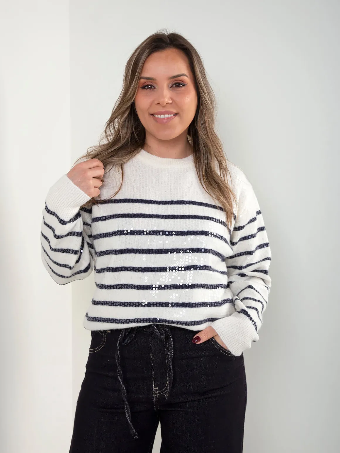 Camisola de malha às riscas com lantejoulas aplicadas para efeito brilhante. Camisola de manga comprida com ombros descaídos e acabamentos canelados. Decote redondo. Altura da Modelo: 160 cm | Tamanho: Tamanho Único