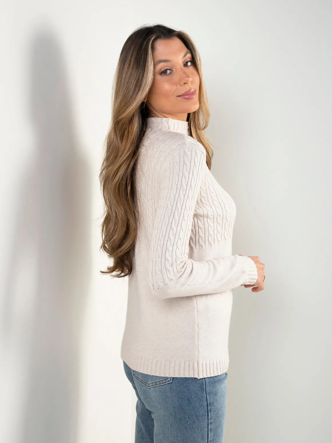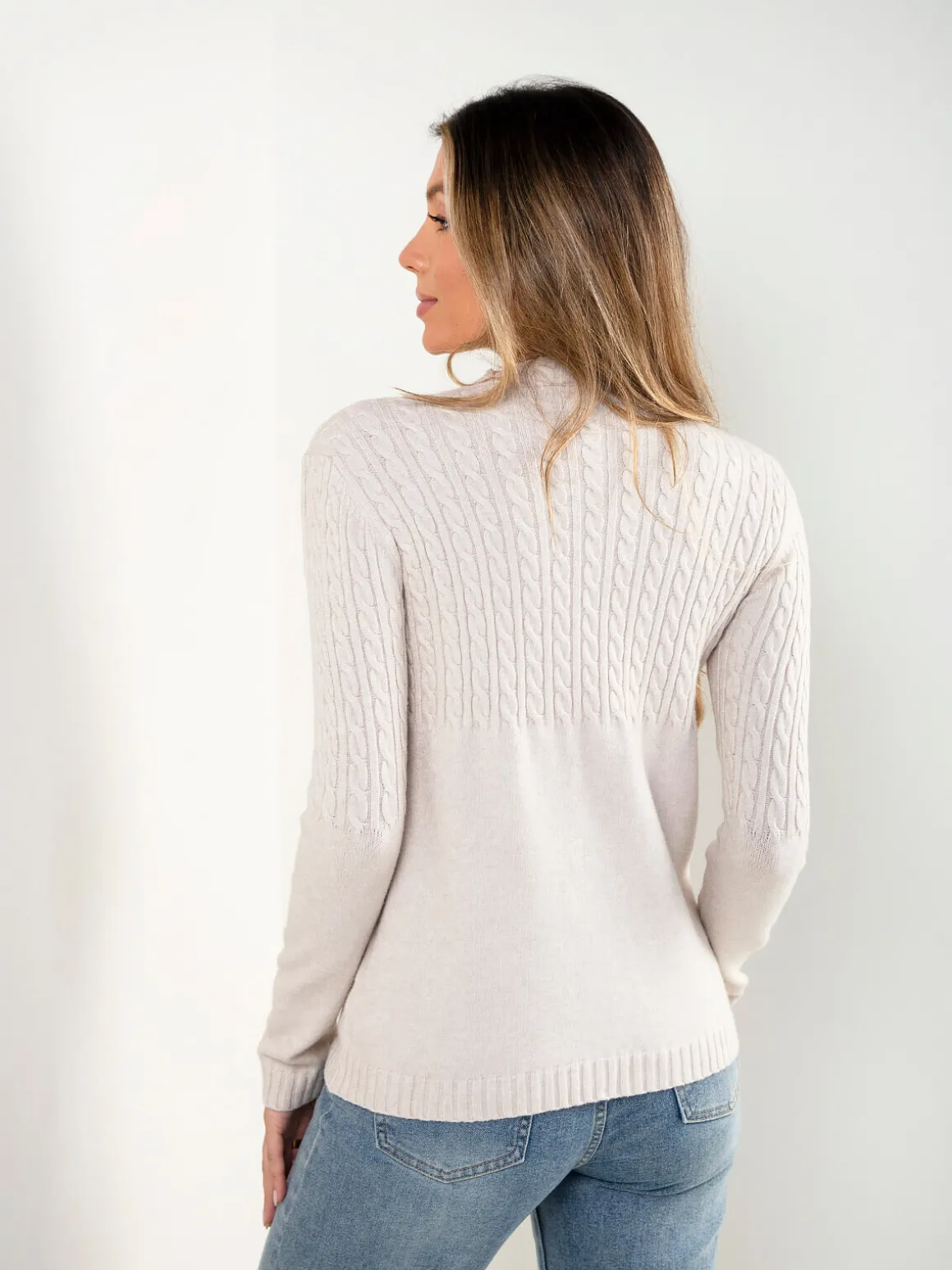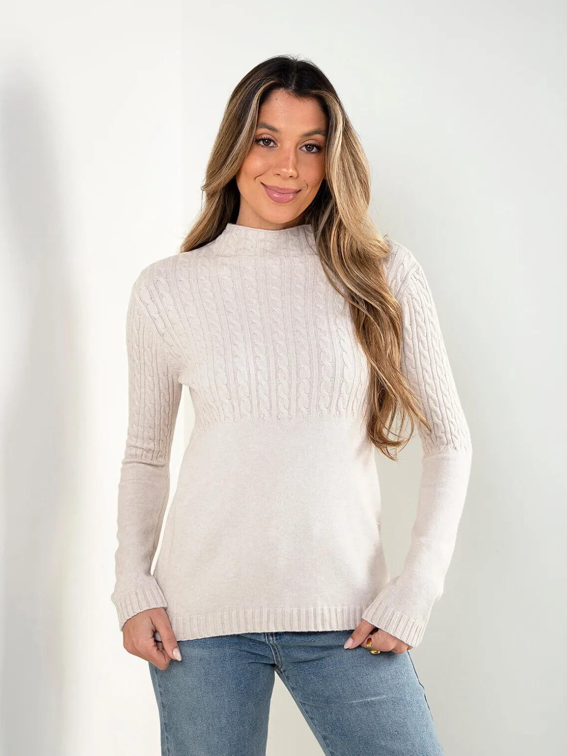 Camisola de malha trançada para senhora, com gola perkins e manga comprida. Malha macia com textura em relevo, ideal para looks clássicos e intemporais. Acabamentos canelados na gola, punhos e base.Altura da Modelo: 175 cm | Tamanho: Tamanho Único