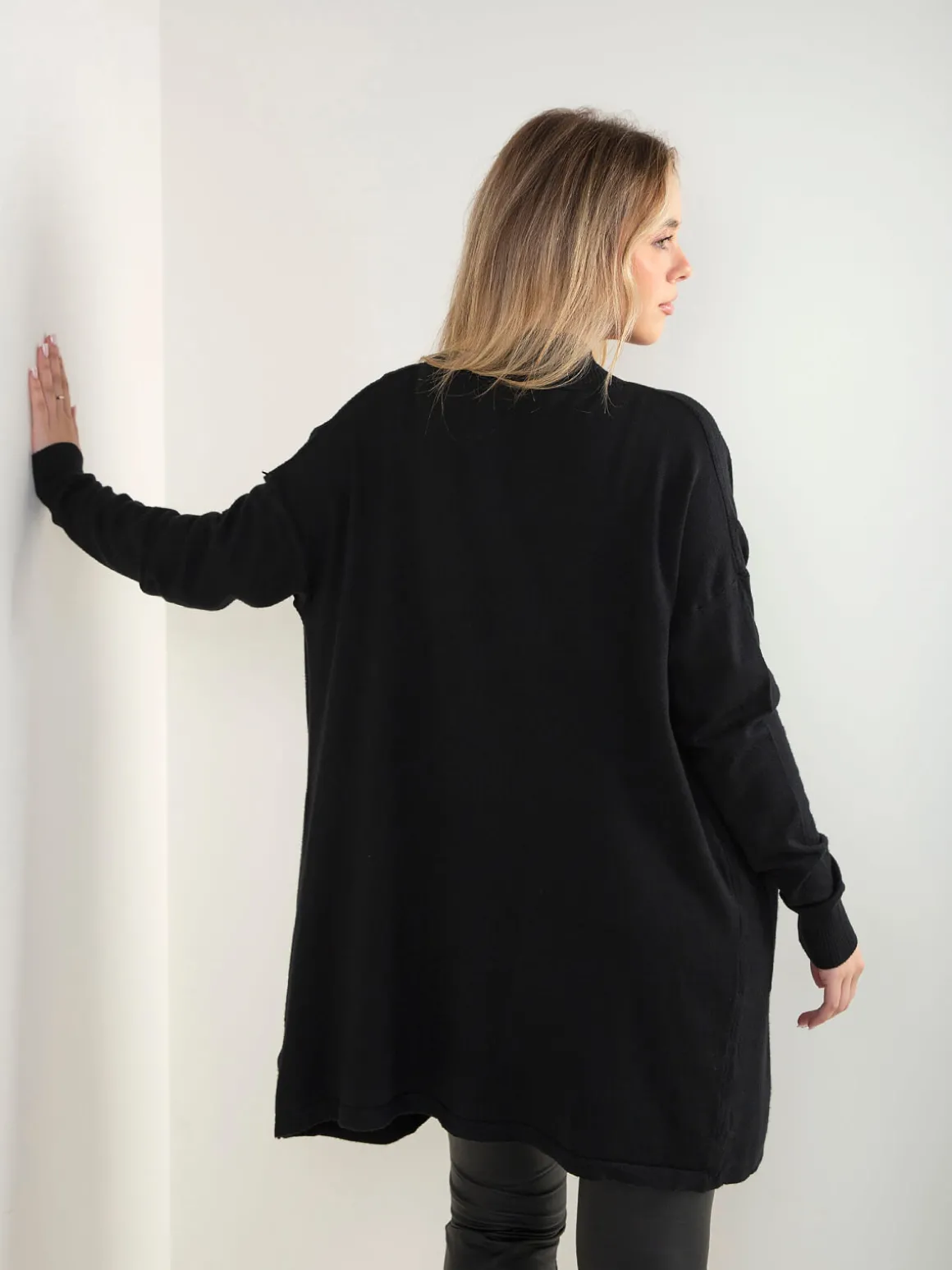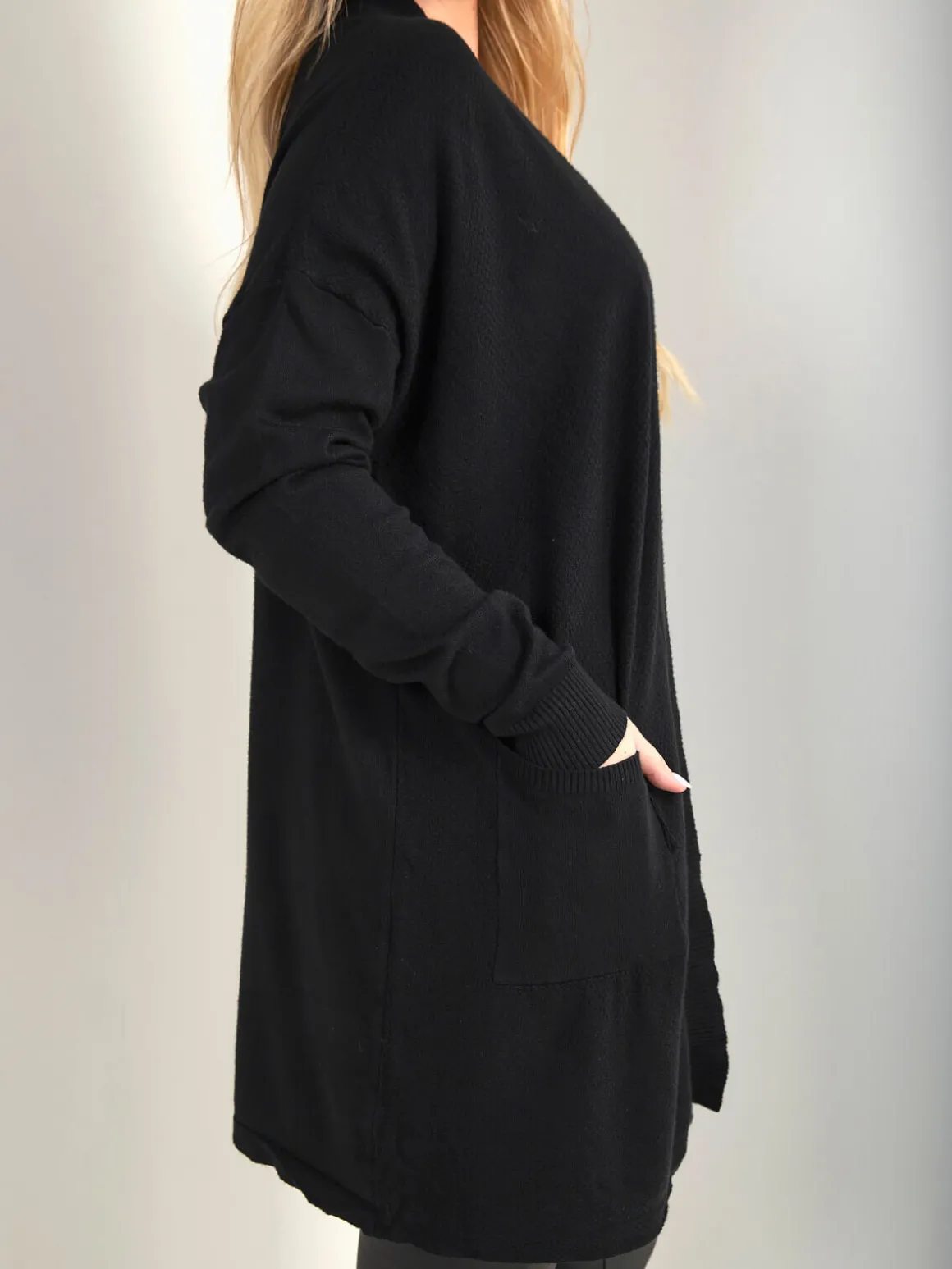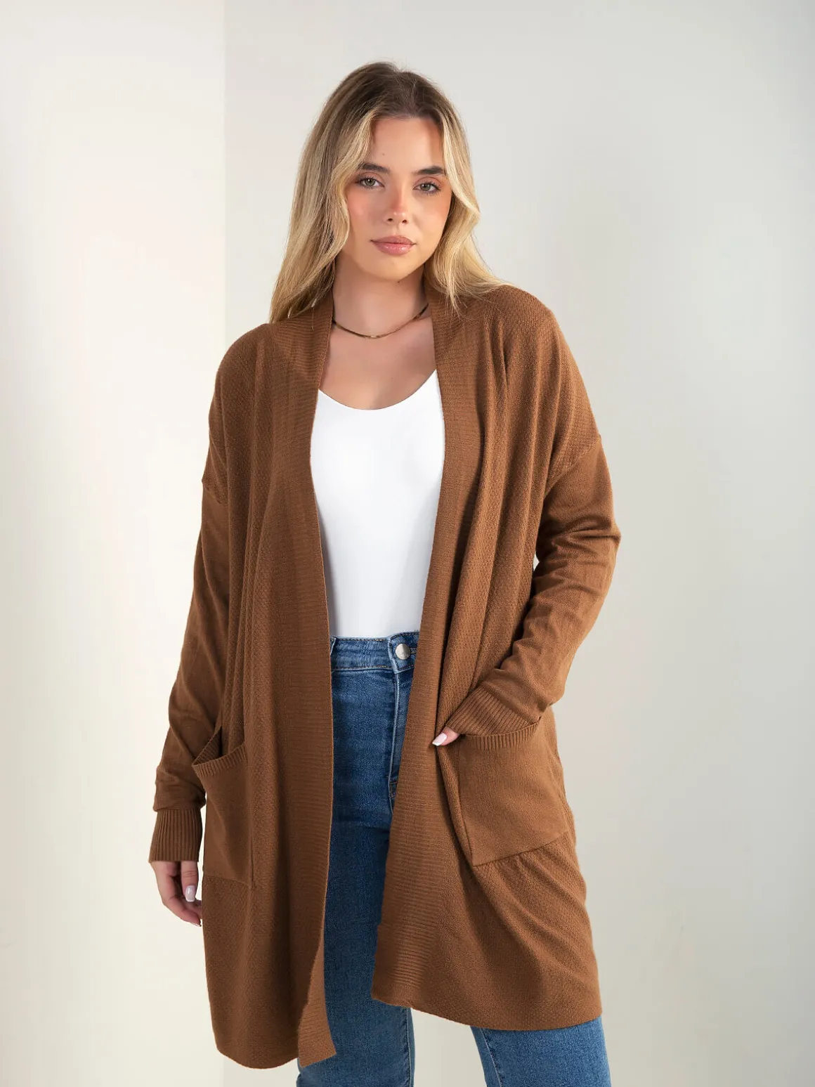 Casaco de malha comprido e aberto, com bolsos frontais e malha fina estruturada. Modelo leve e confortável, ideal para usar no dia a dia sobre tops ou malhas básicas.Altura da Modelo: 166 cm | Tamanho: Tamanho Único