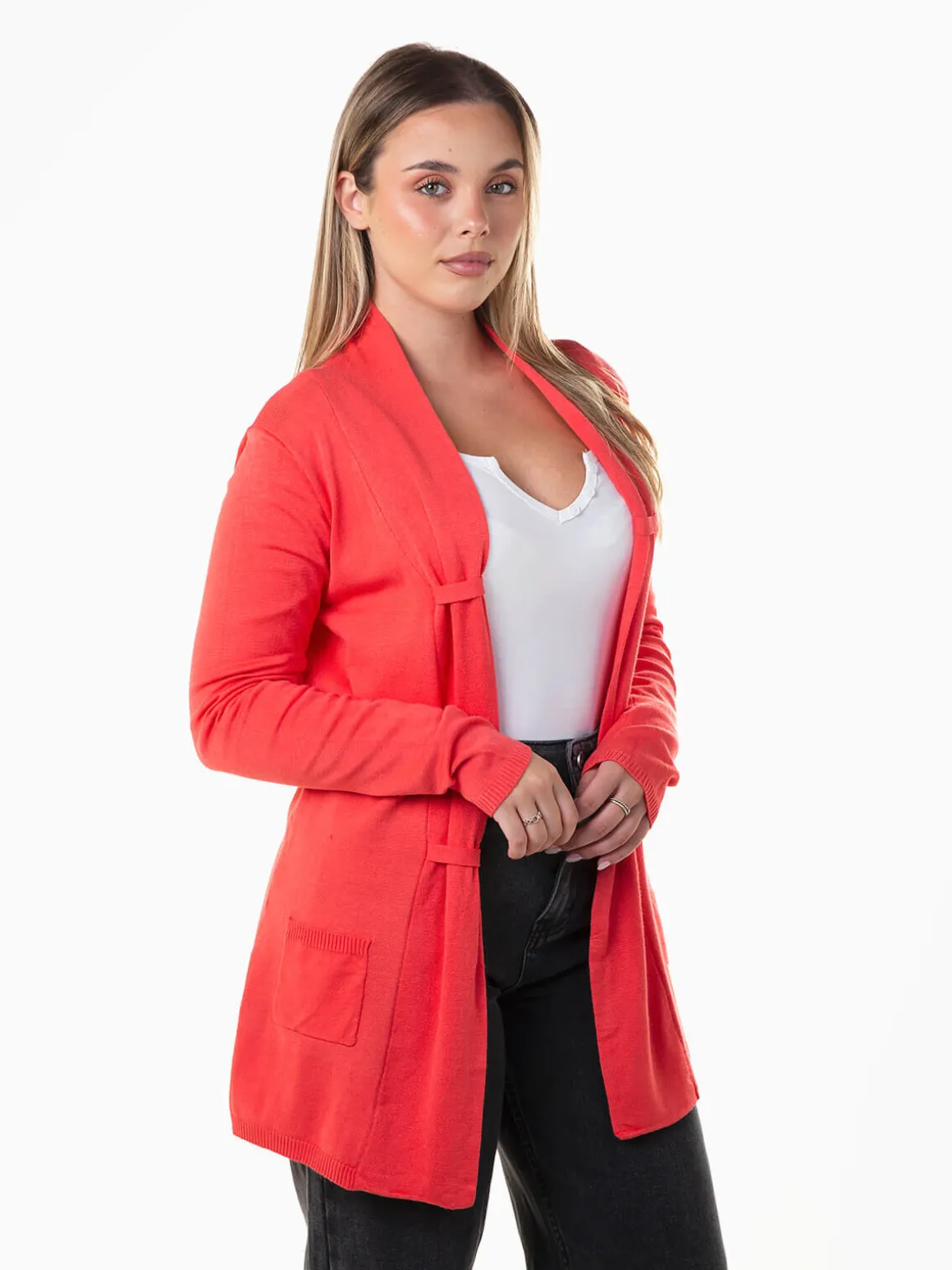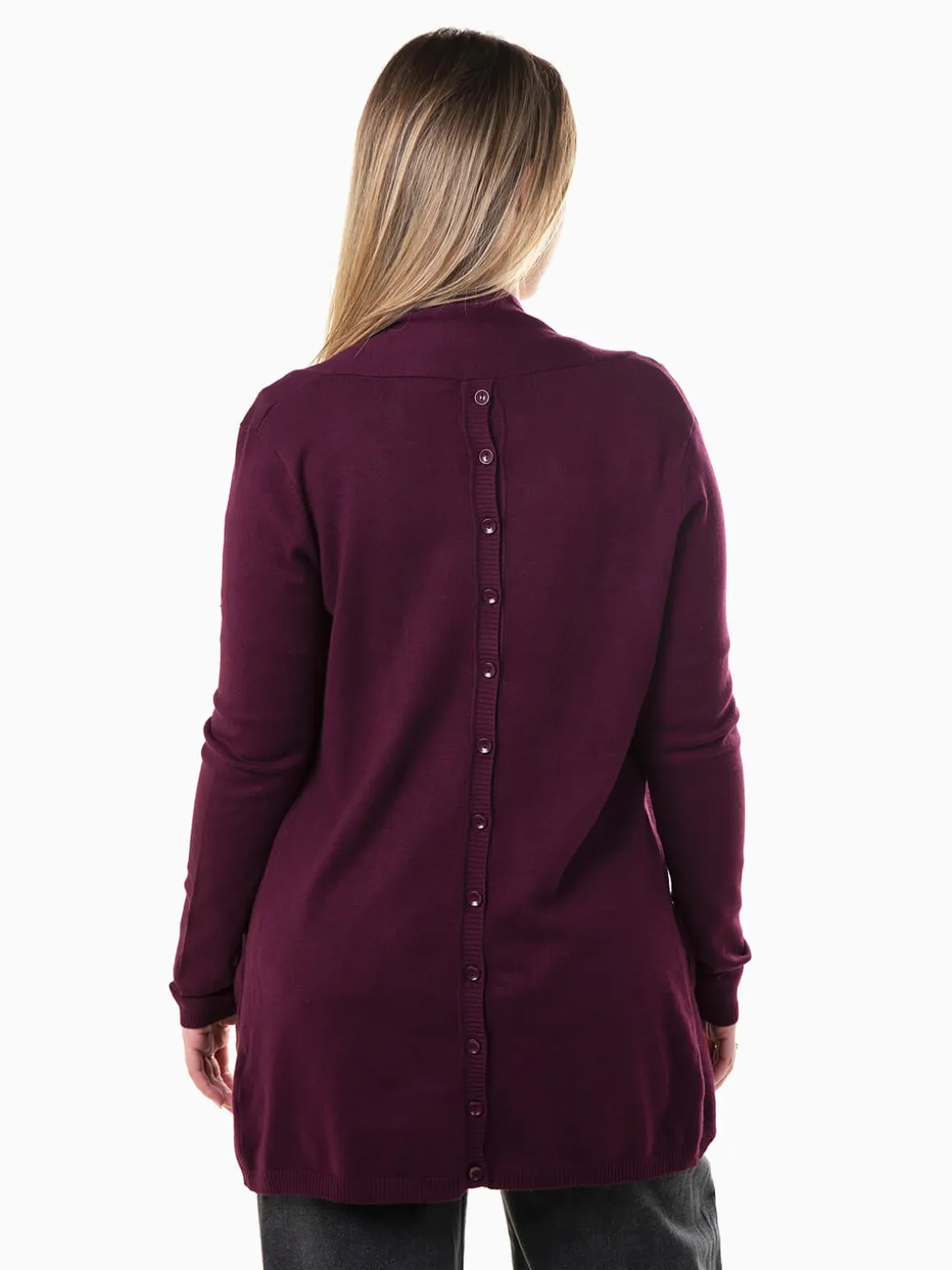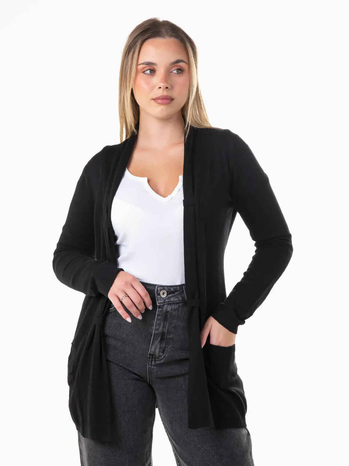 Casaco malha comprido com 2 bolsos quadrados. Cardigan aberto de manga comprida com botões decorativos na parte posterior. Altura da Modelo: 166 cm | Tamanho: Tamanho Único