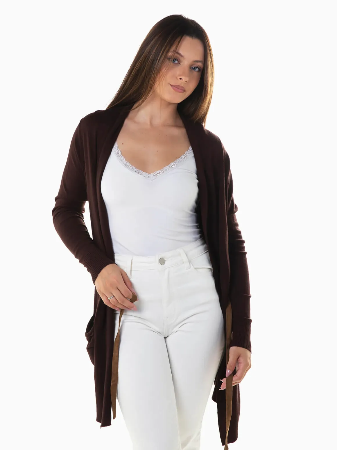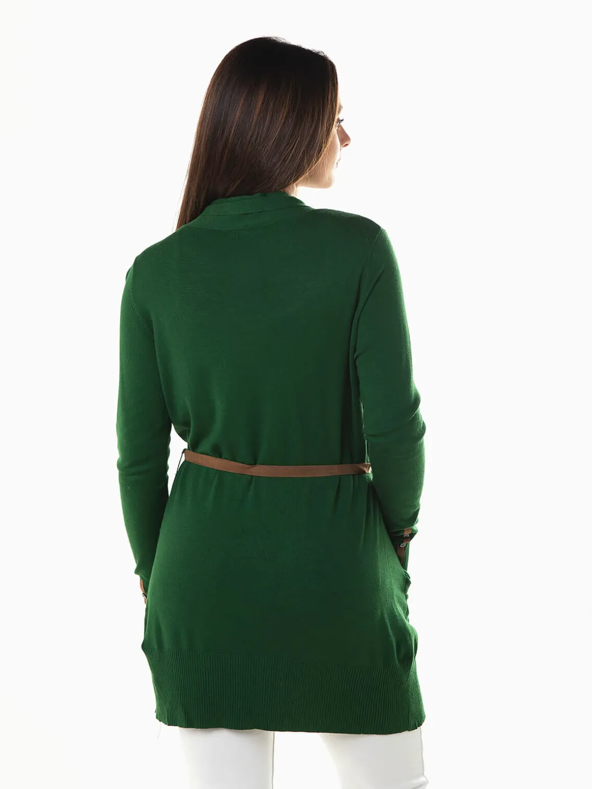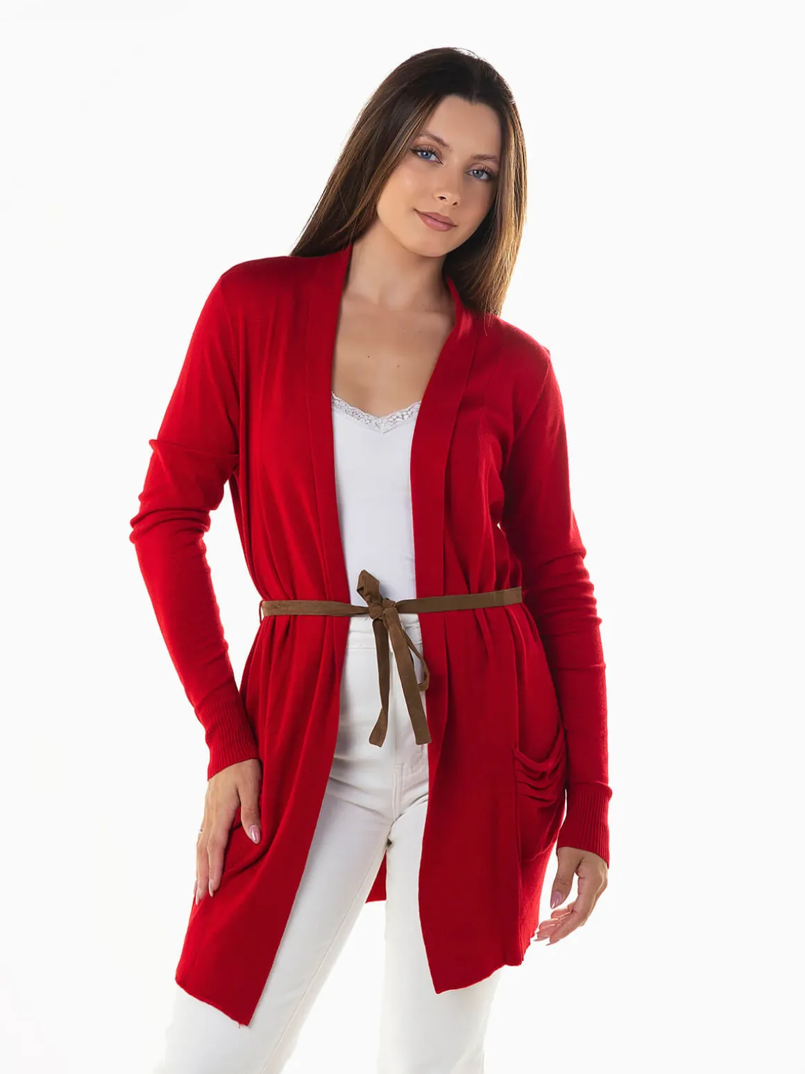 Casaco malha comprido com cinto em pele de pessêgo. Casaco aberto de manga comprida com 2 bolsos. Altura da Modelo: 163 cm | Tamanho: M/L