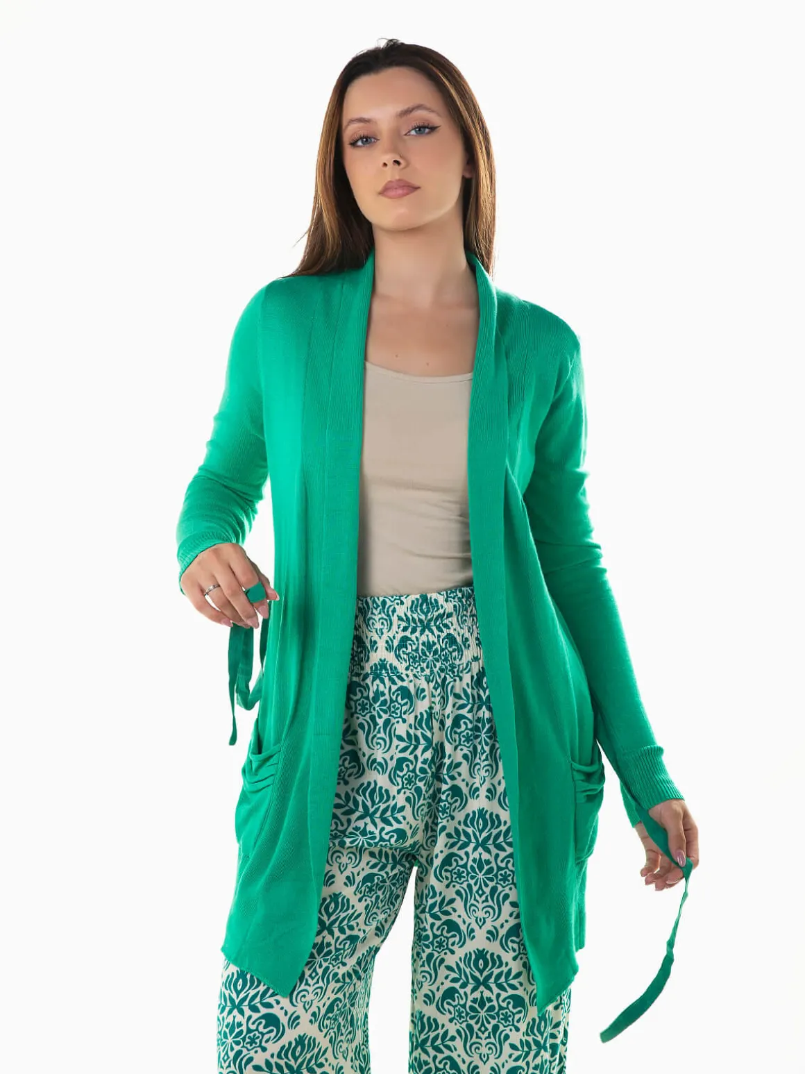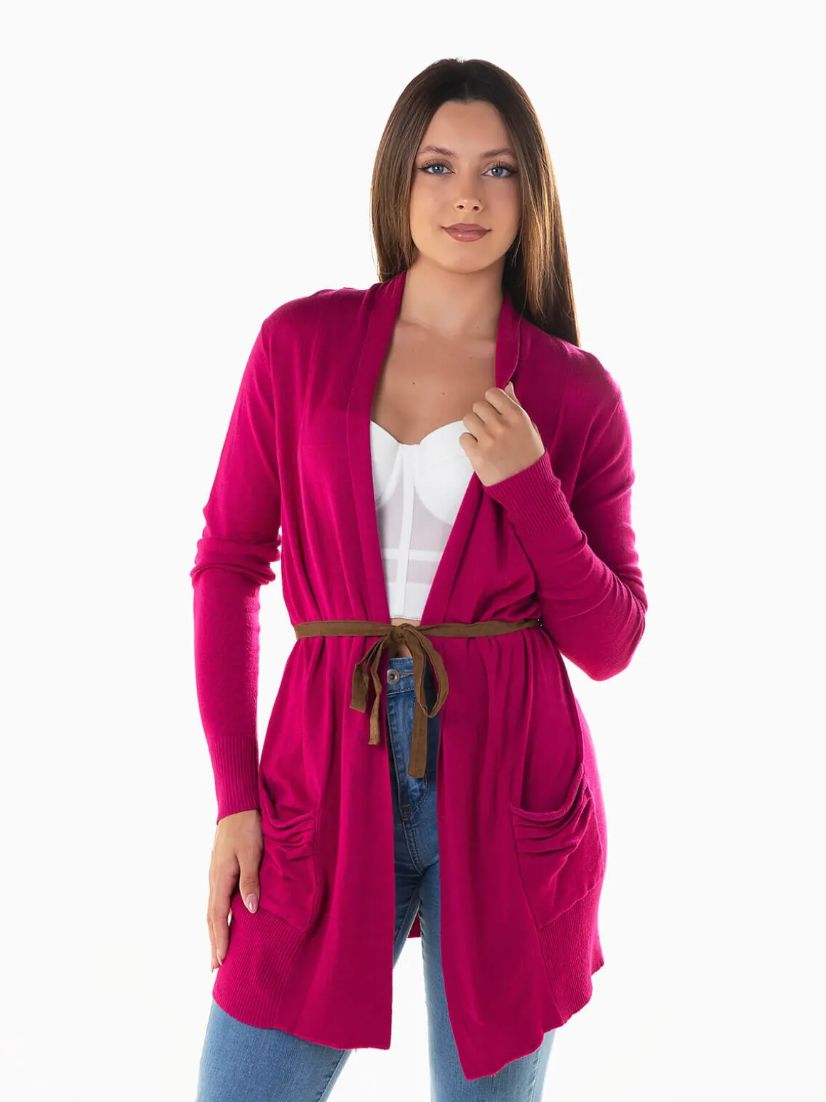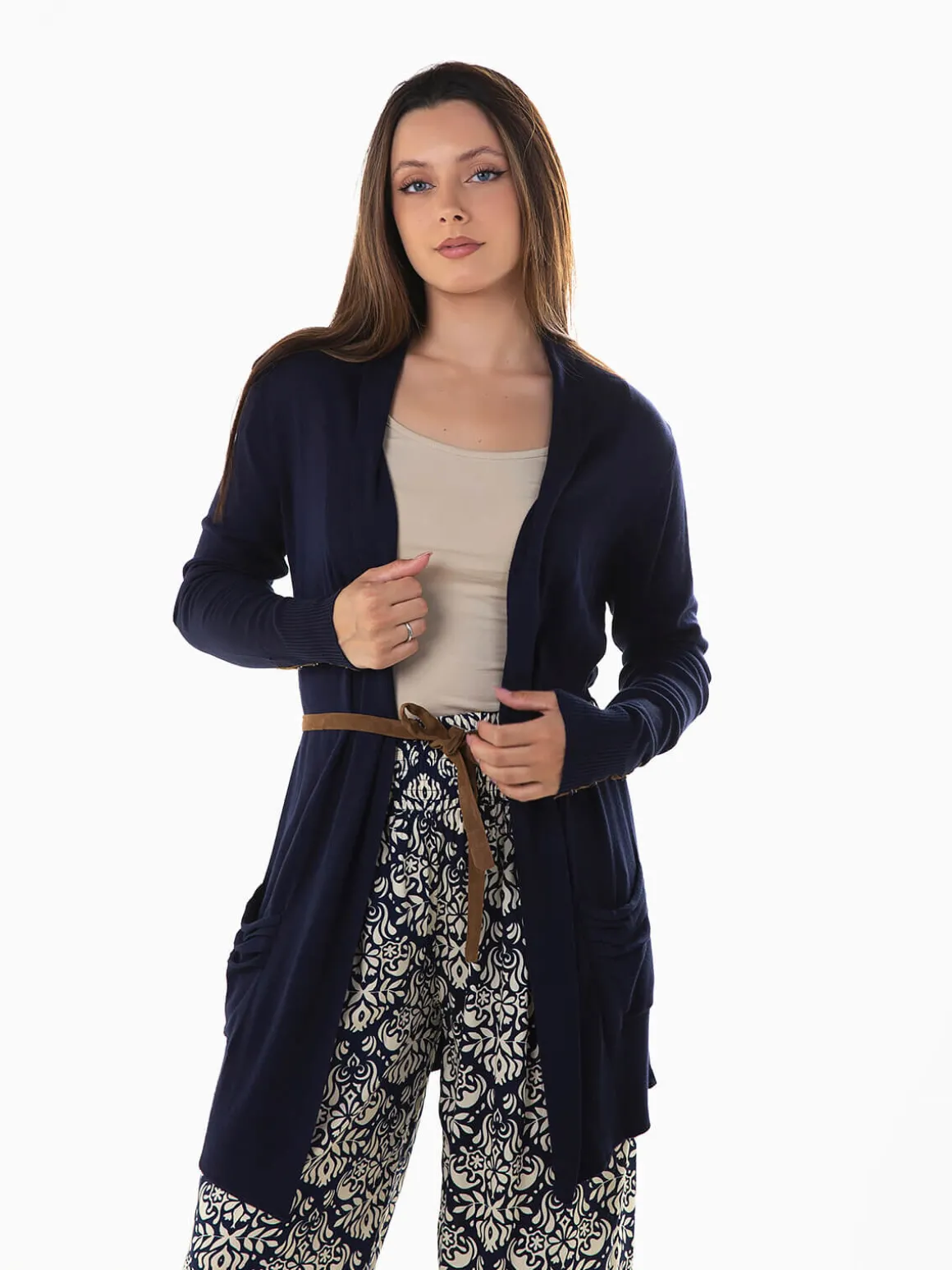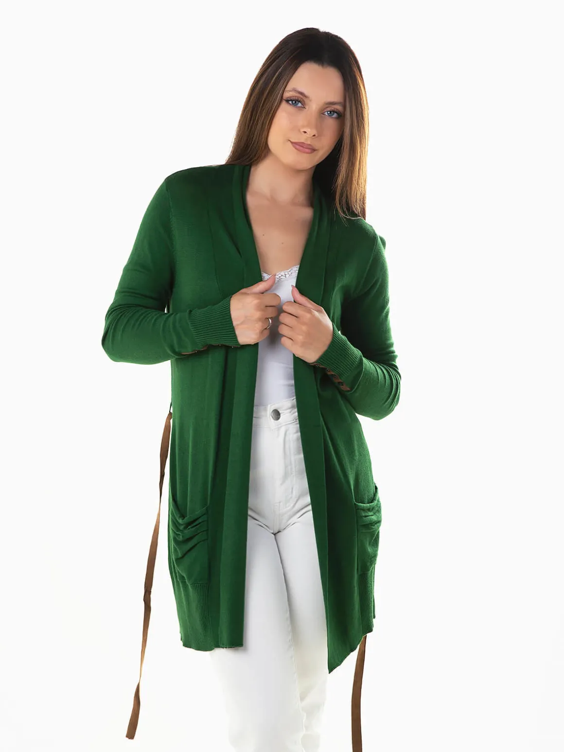 Casaco malha comprido com cinto em pele de pessêgo. Casaco aberto de manga comprida com 2 bolsos. Altura da Modelo: 163 cm | Tamanho: M/L