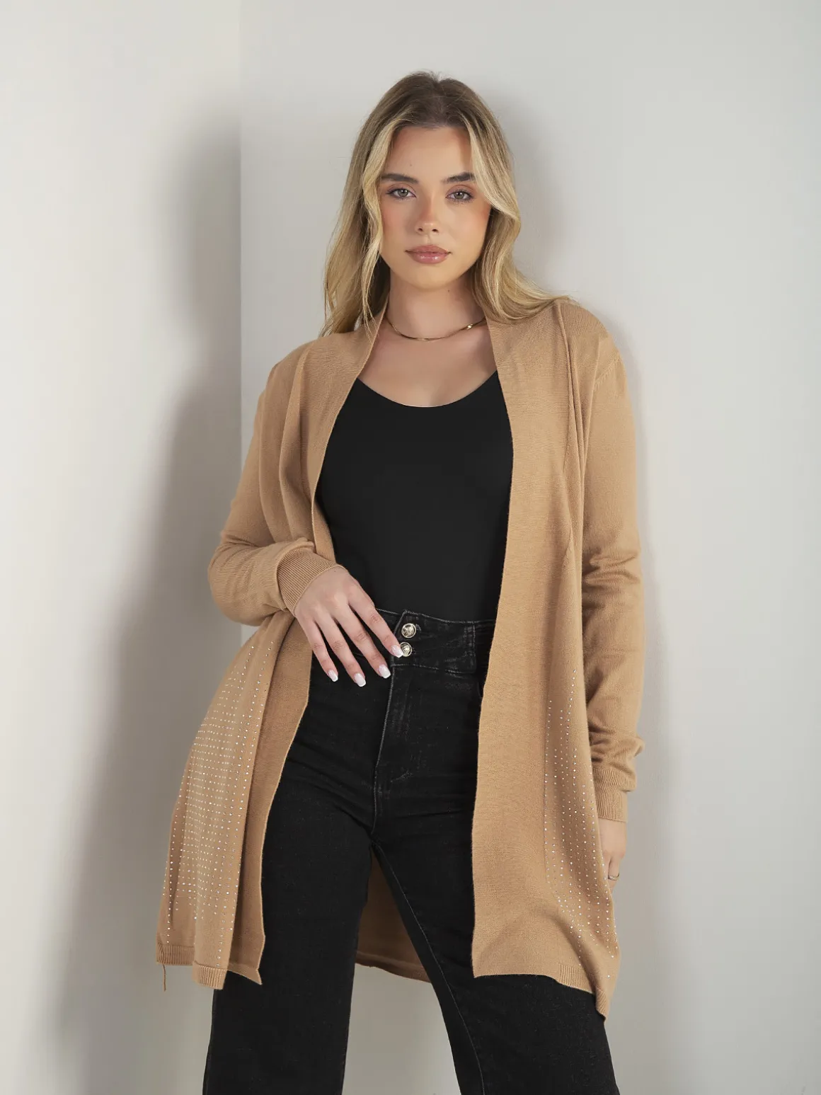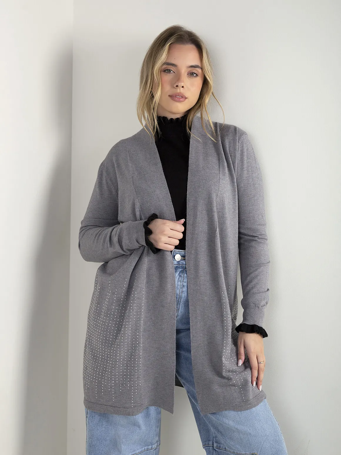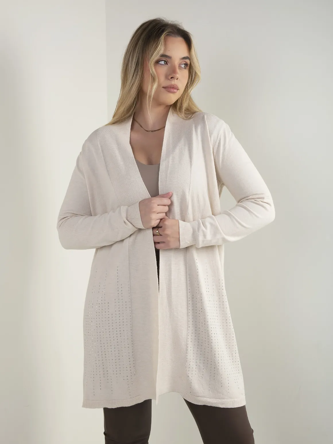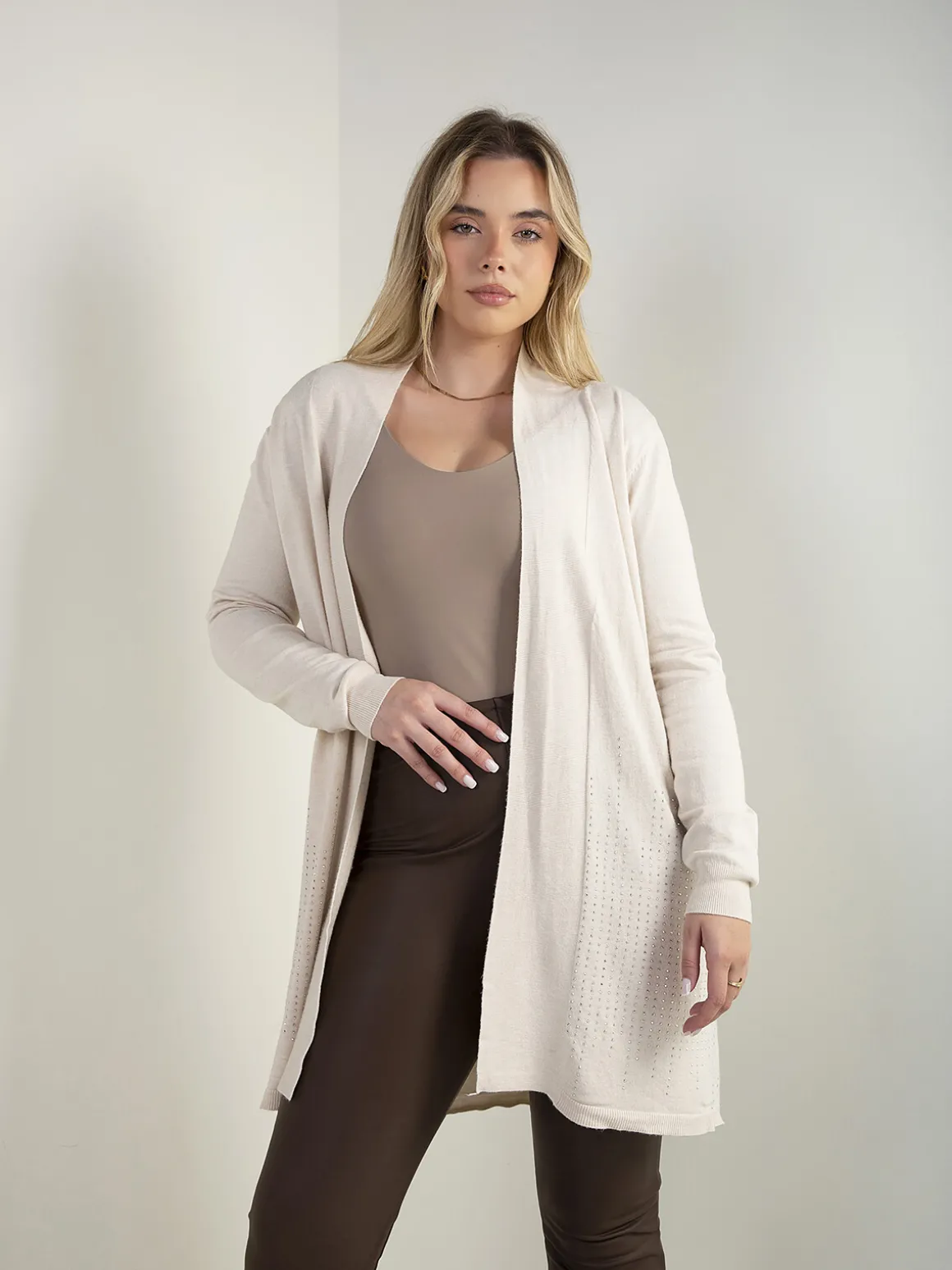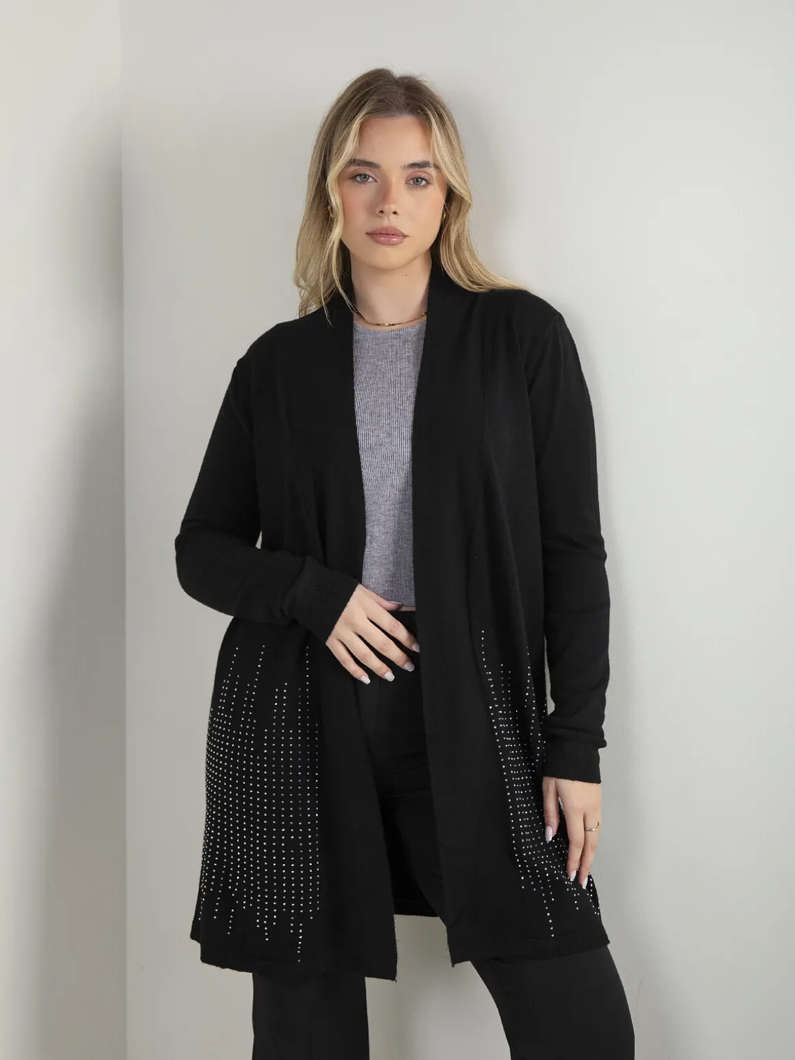 Casaco de malha comprido e aberto, com manga comprida e aplicações de strass na base. Modelo leve e confortável, ideal para usar sobre tops ou malhas finas no dia a dia.Altura da Modelo: 166 cm | Tamanho: Tamanho Único