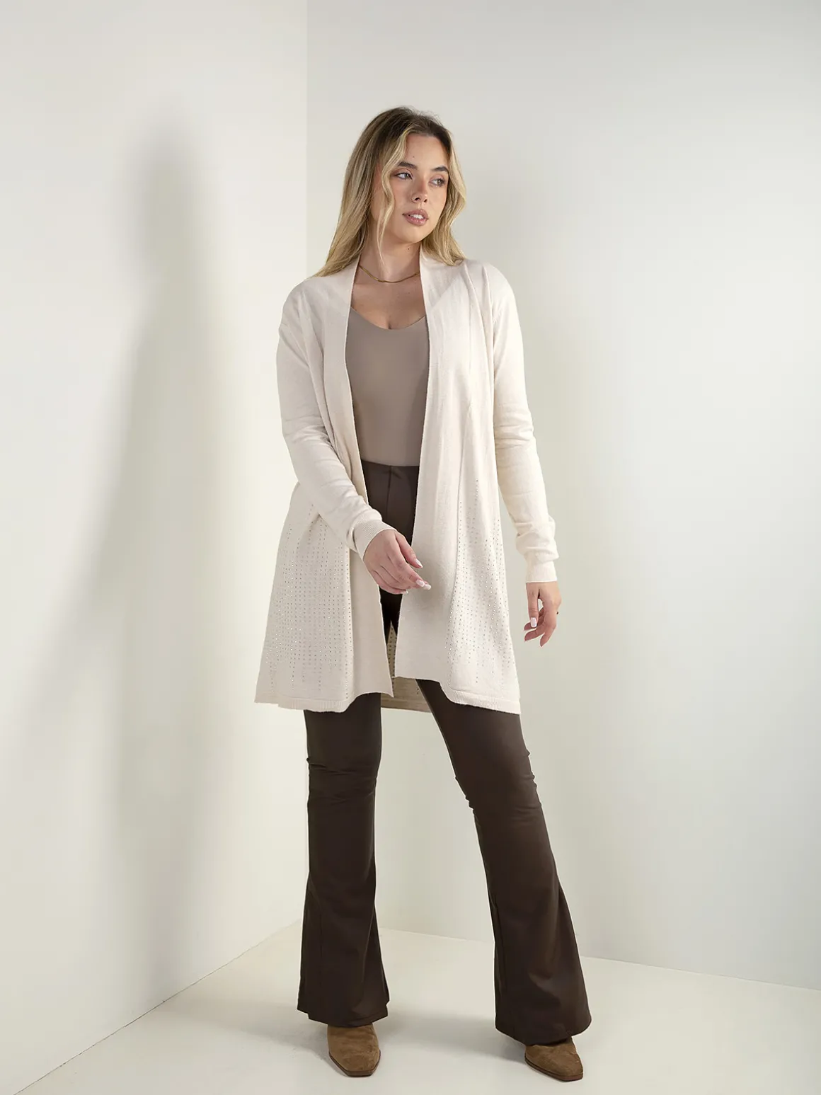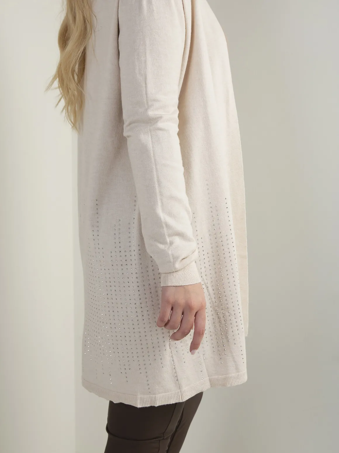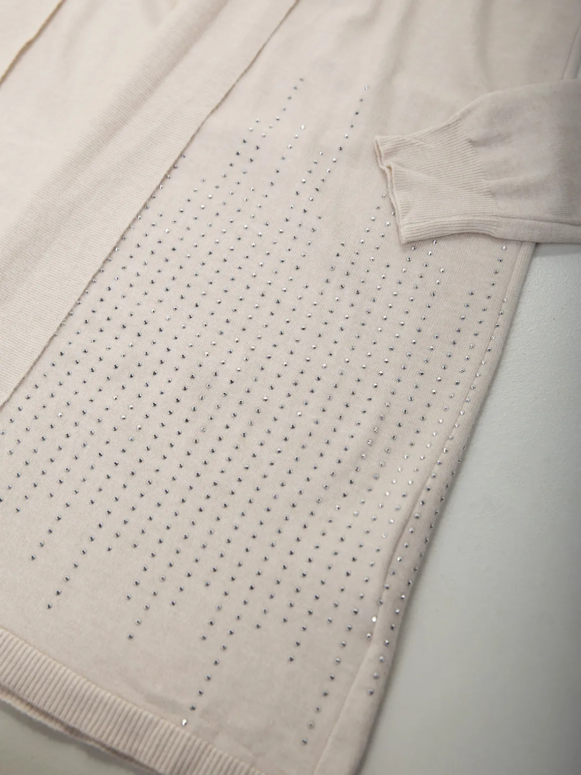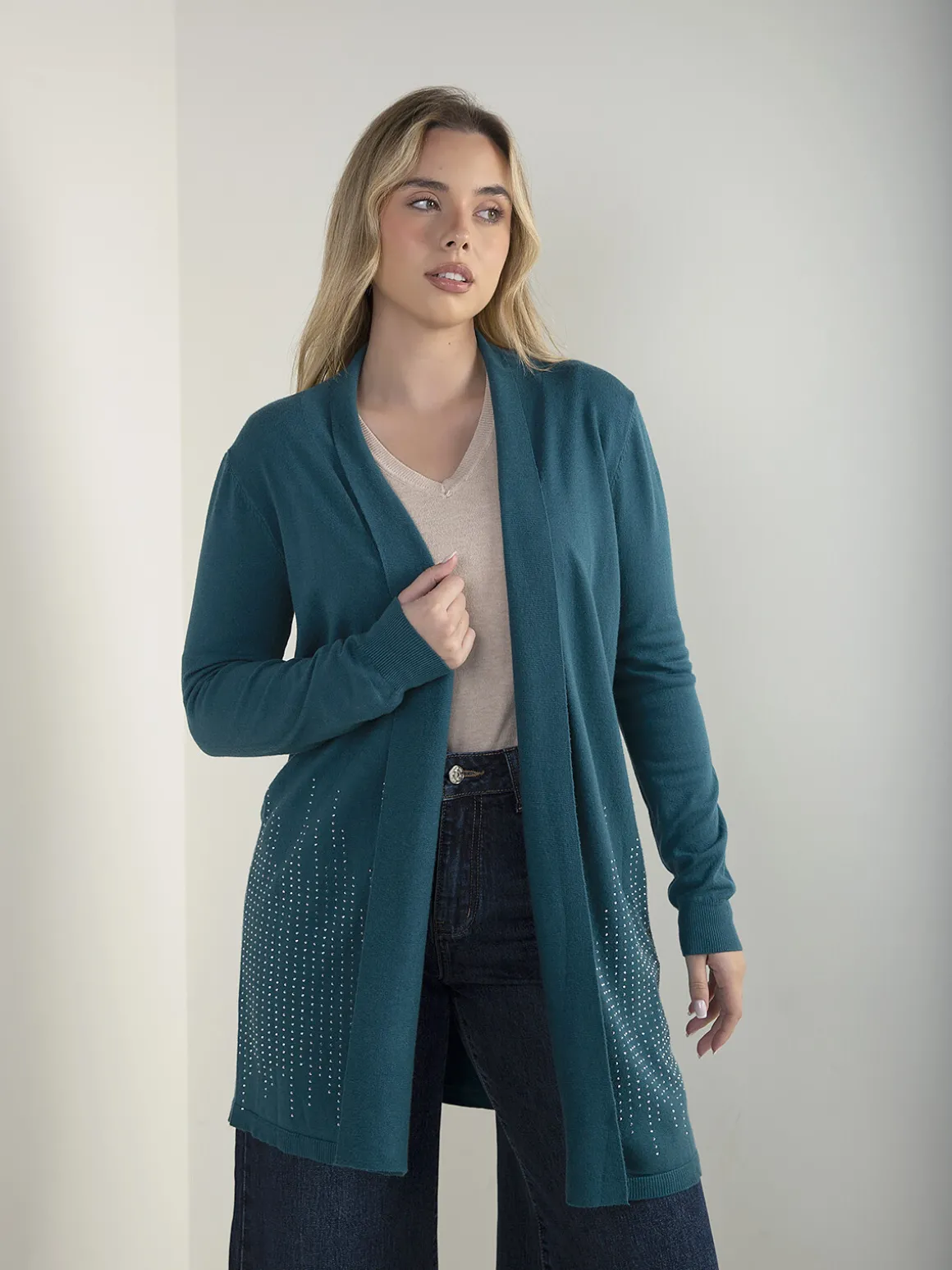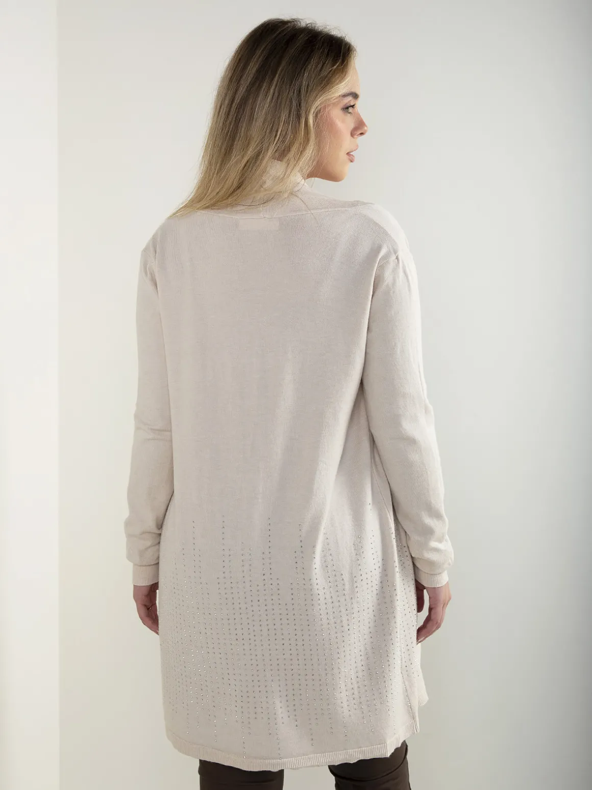 Casaco de malha comprido e aberto, com manga comprida e aplicações de strass na base. Modelo leve e confortável, ideal para usar sobre tops ou malhas finas no dia a dia.Altura da Modelo: 166 cm | Tamanho: Tamanho Único