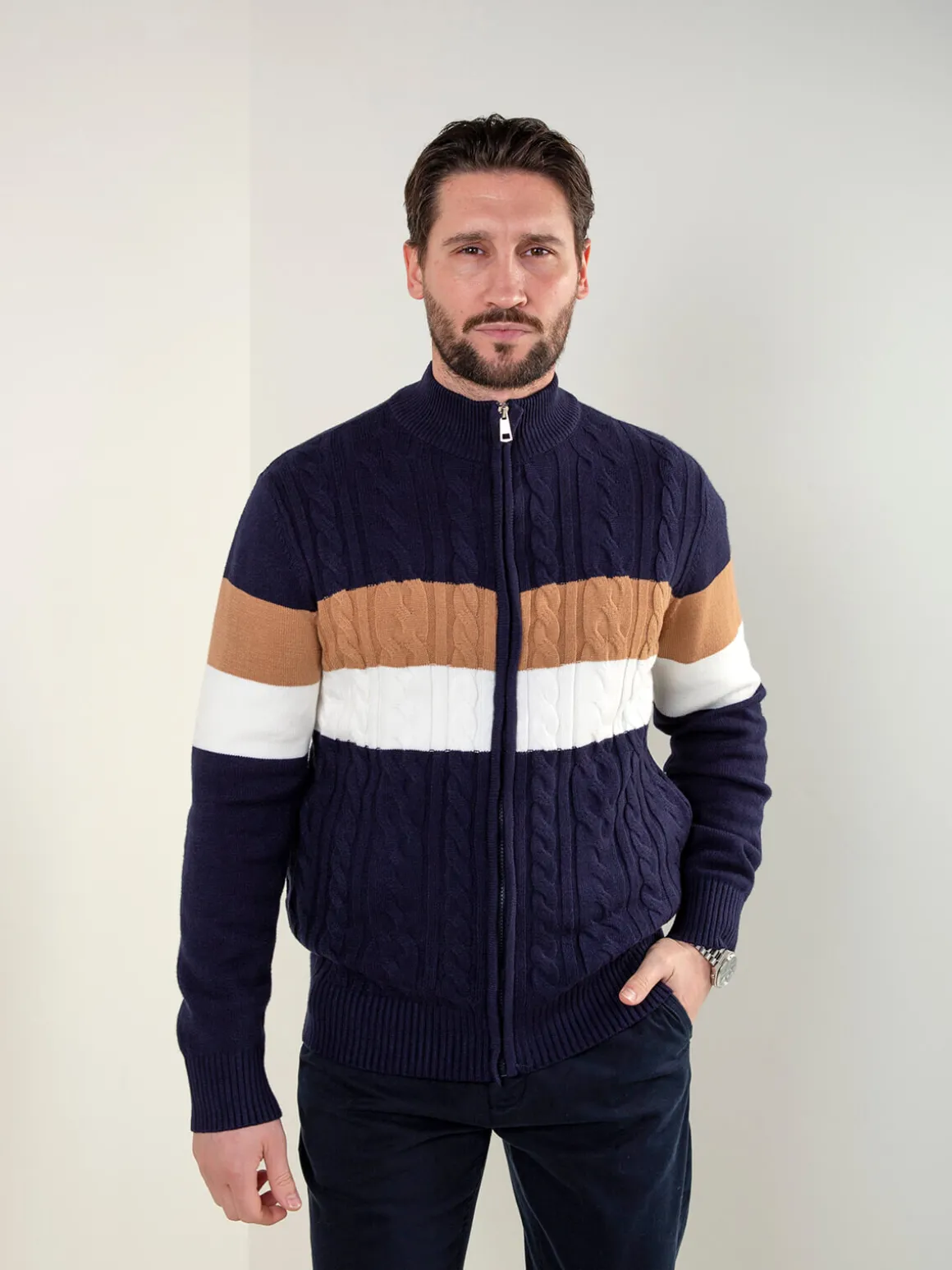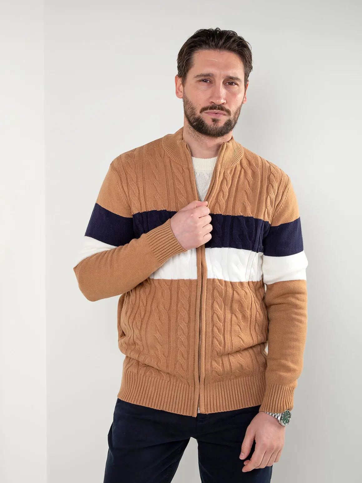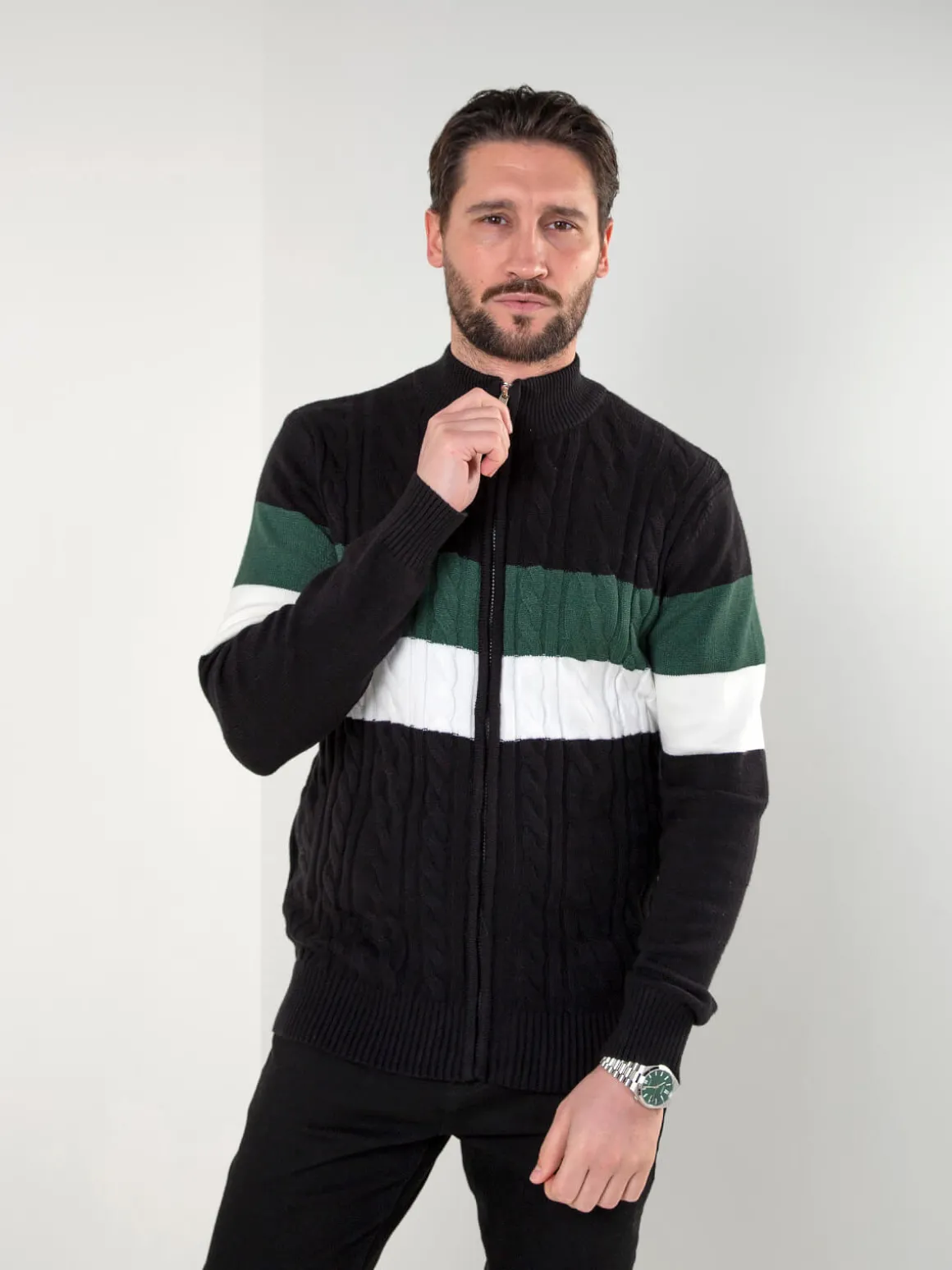 Casaco de malha para homem com padrão trançado e fecho frontal. Modelo confortável, de corte regular, ideal para usar em looks casuais durante a meia-estação. Acabamentos canelados no colarinho, punhos e base.Altura do Modelo: 180 cm | Tamanho: M