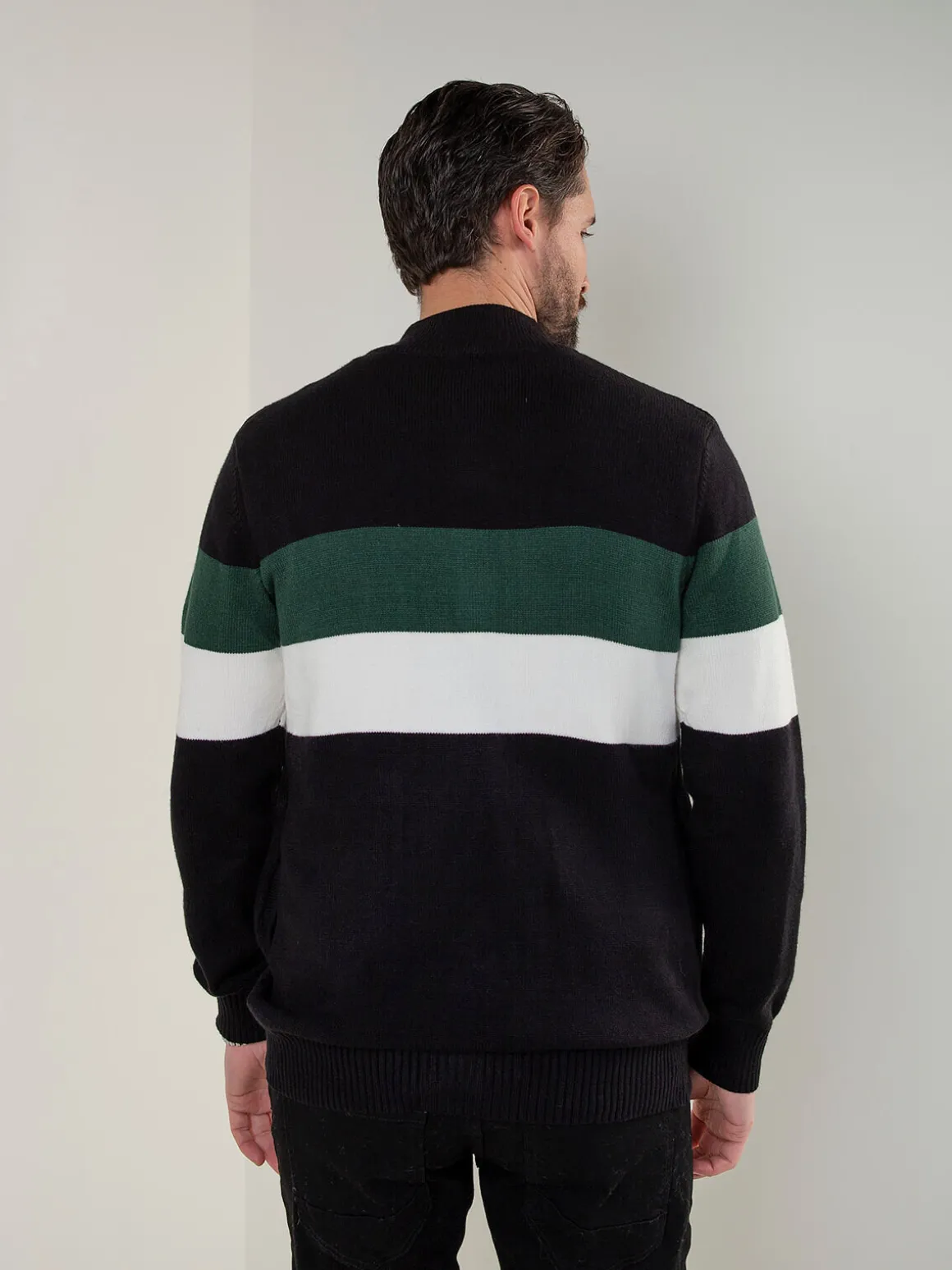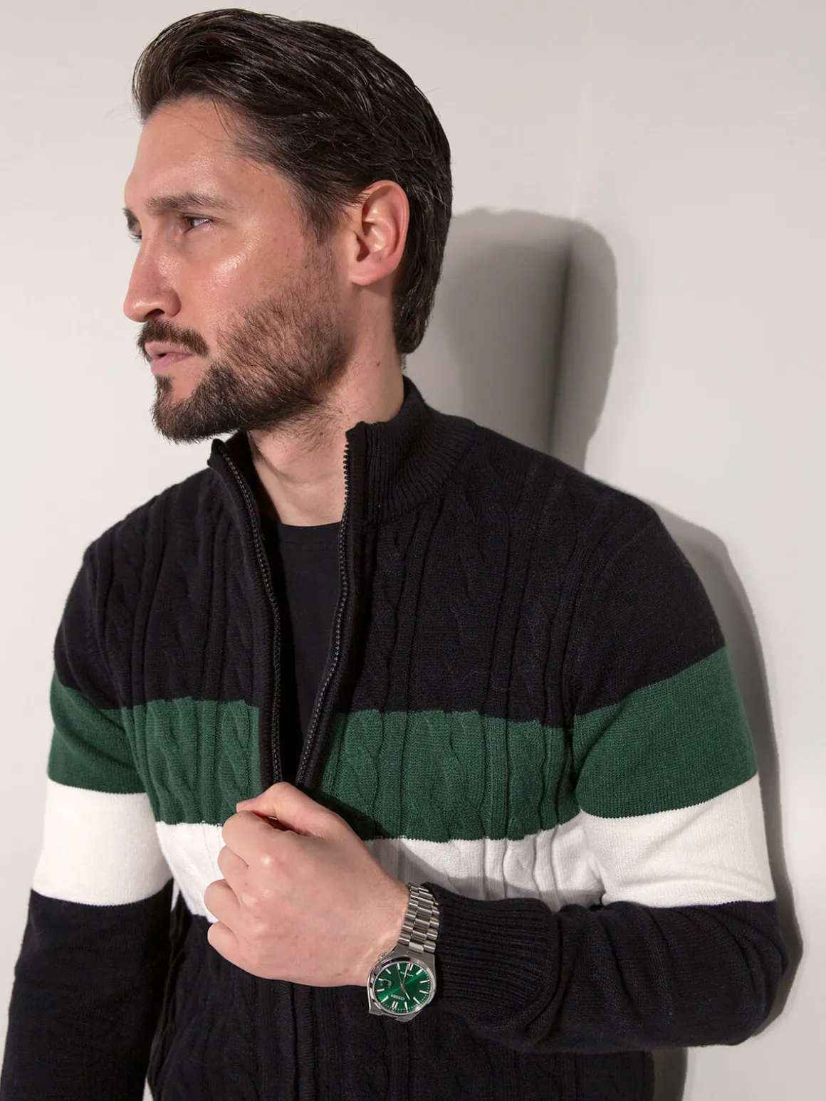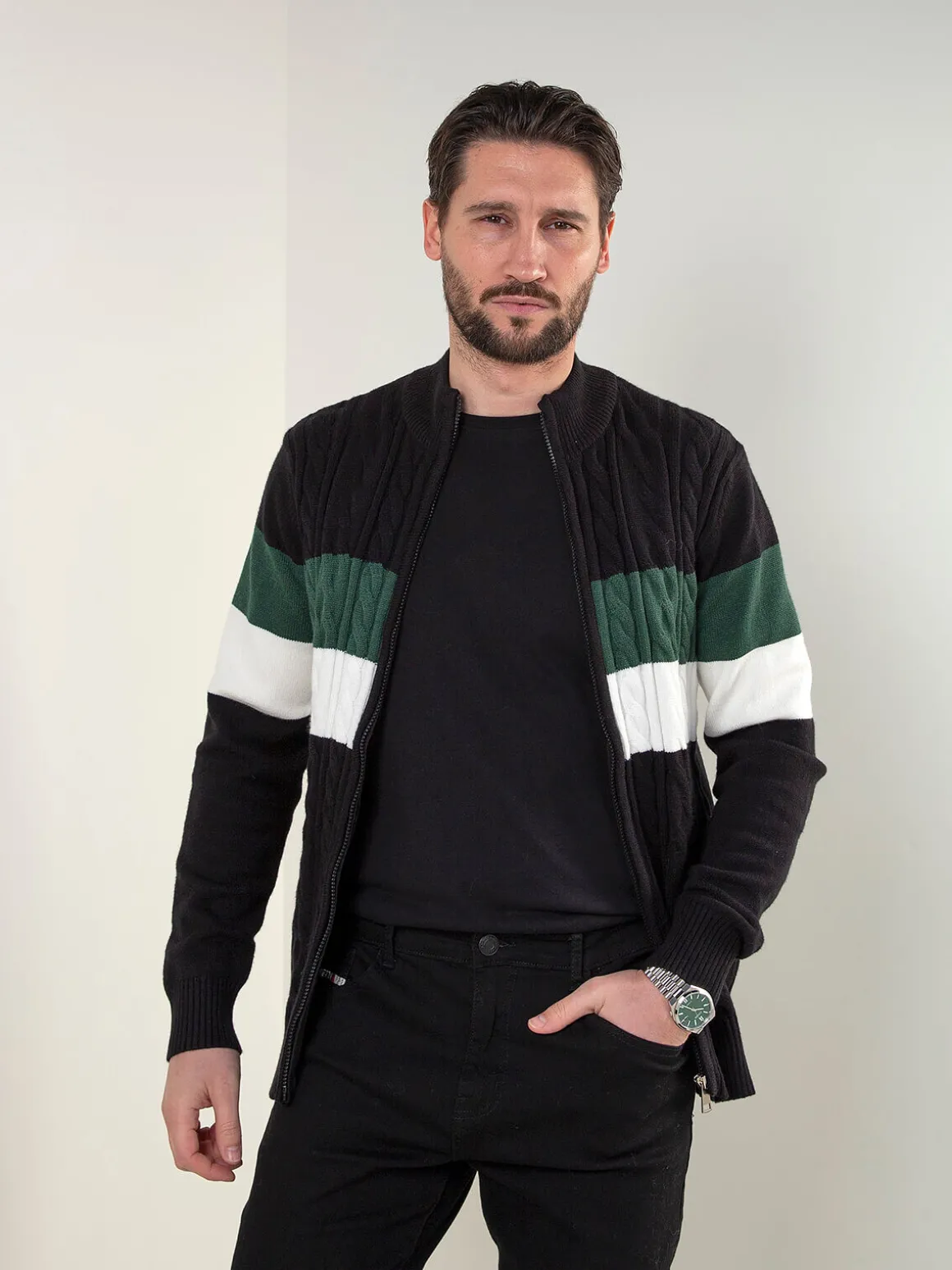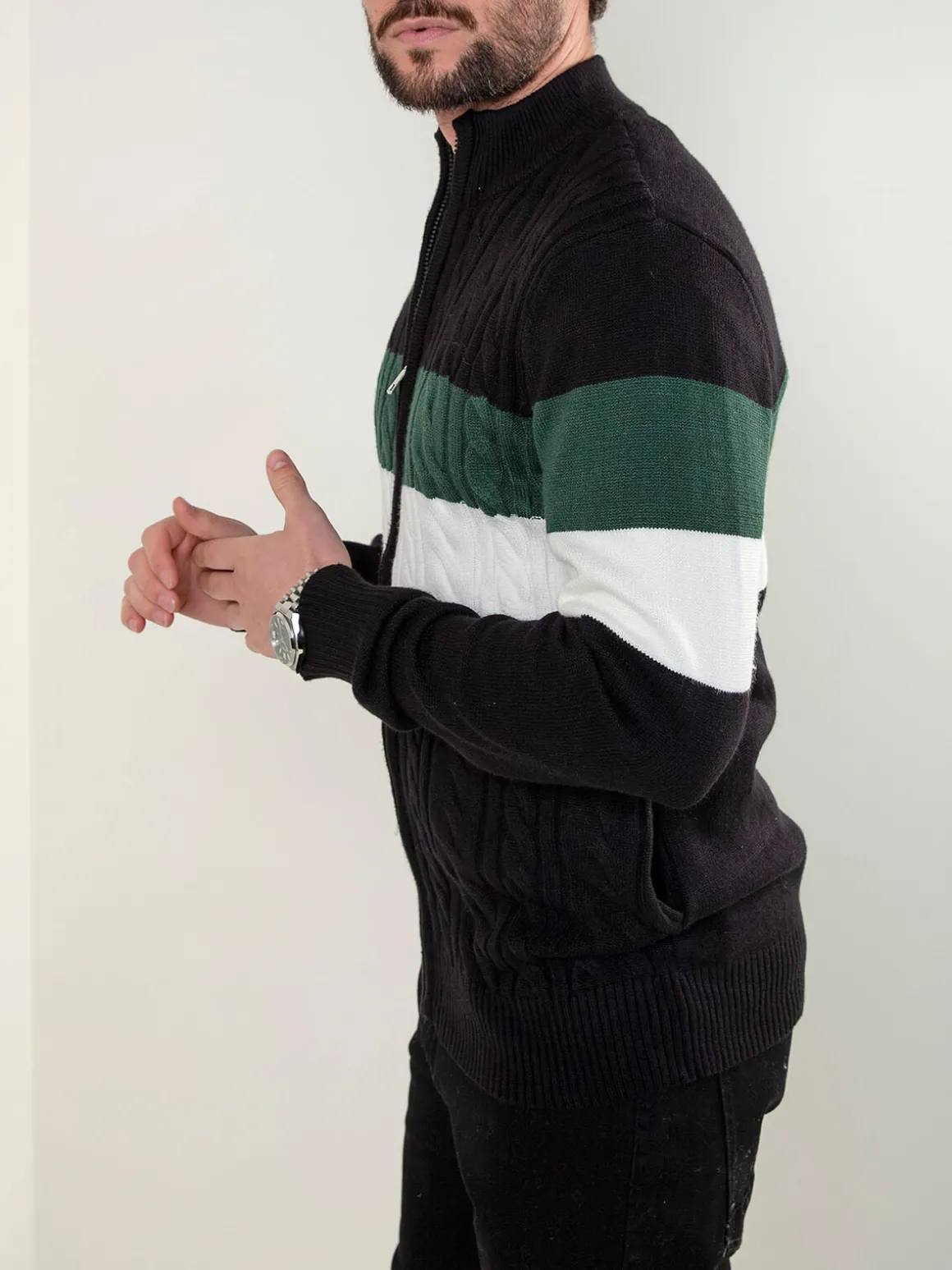 Casaco de malha para homem com padrão trançado e fecho frontal. Modelo confortável, de corte regular, ideal para usar em looks casuais durante a meia-estação. Acabamentos canelados no colarinho, punhos e base.Altura do Modelo: 180 cm | Tamanho: M