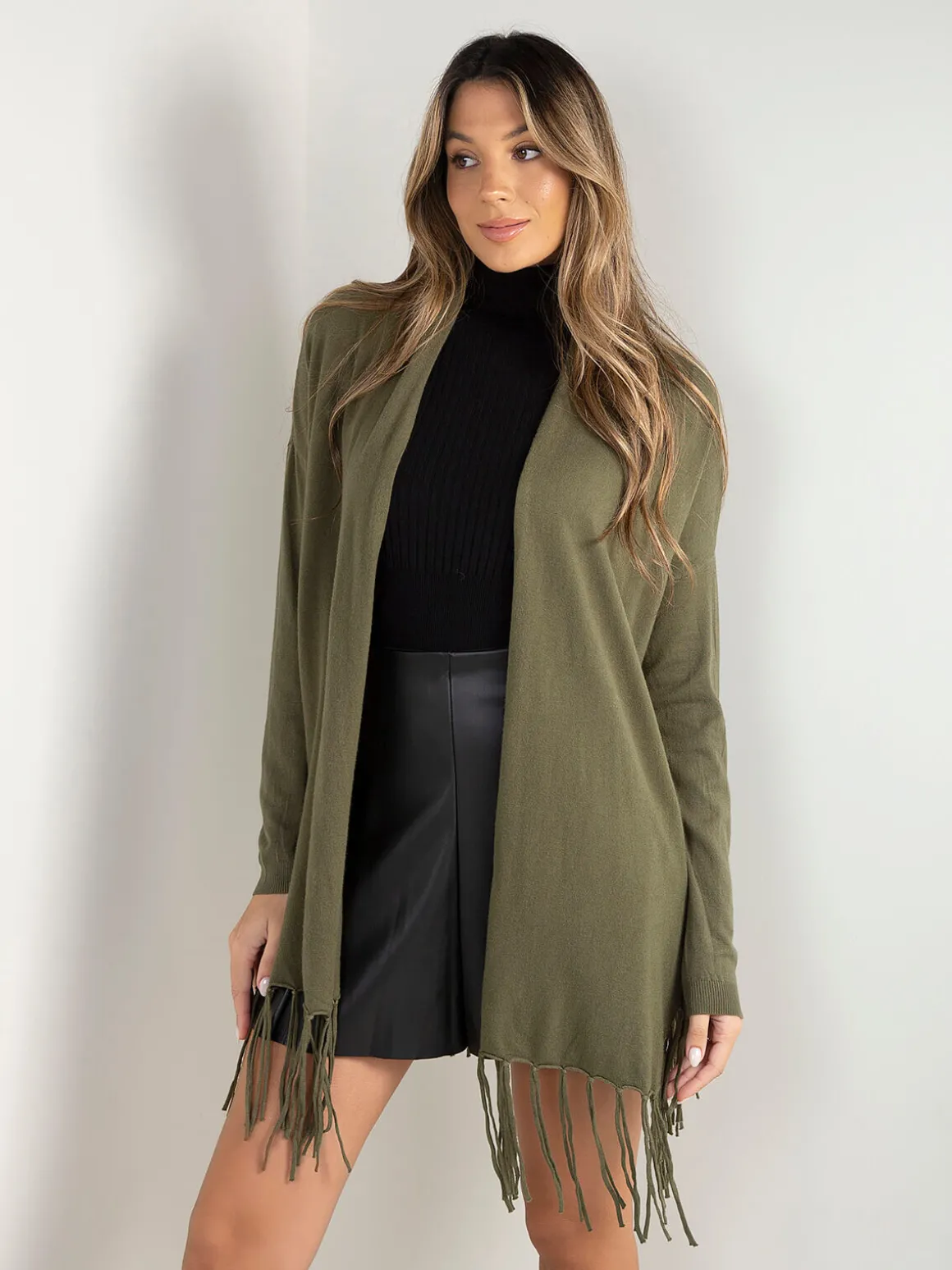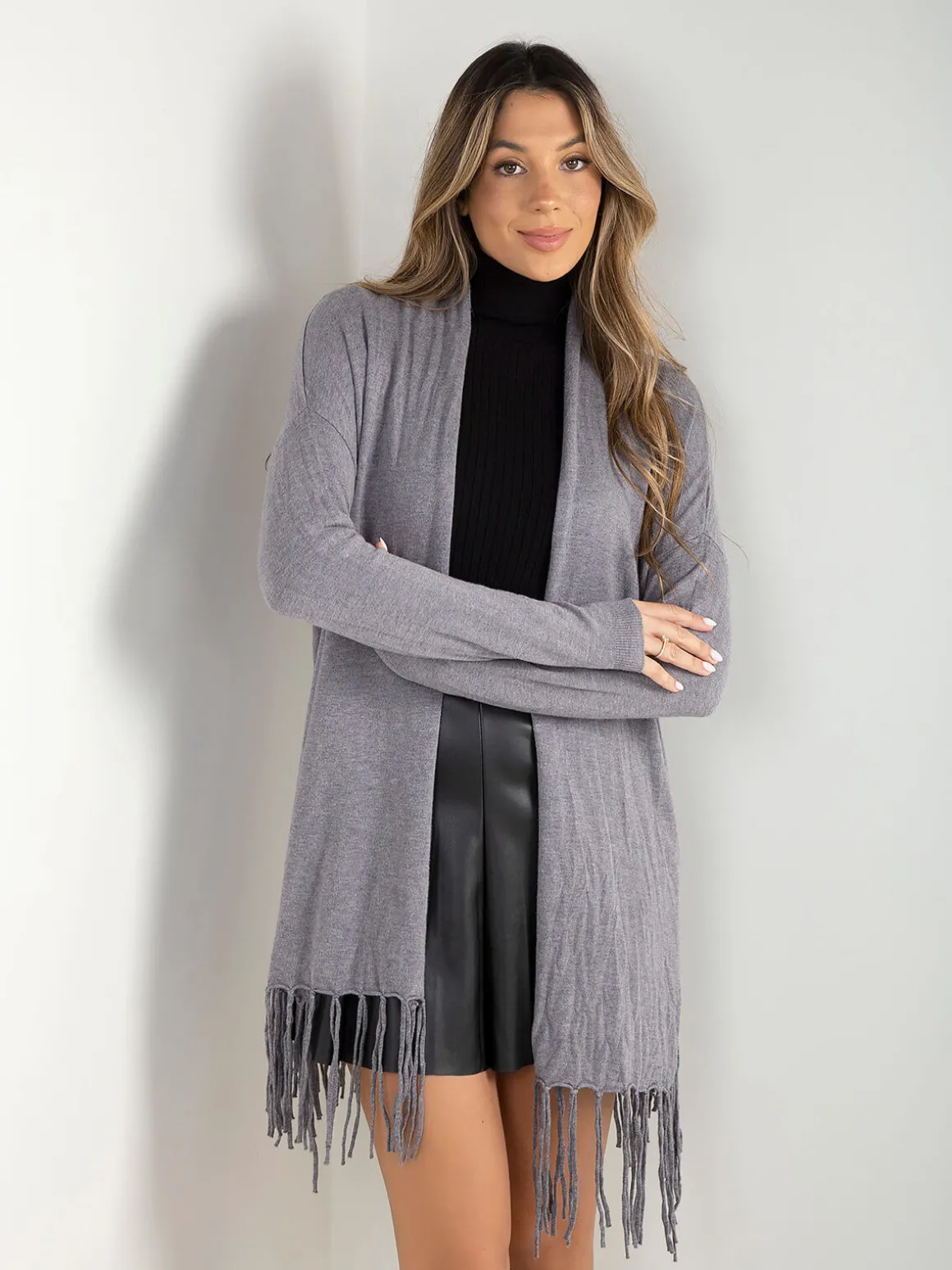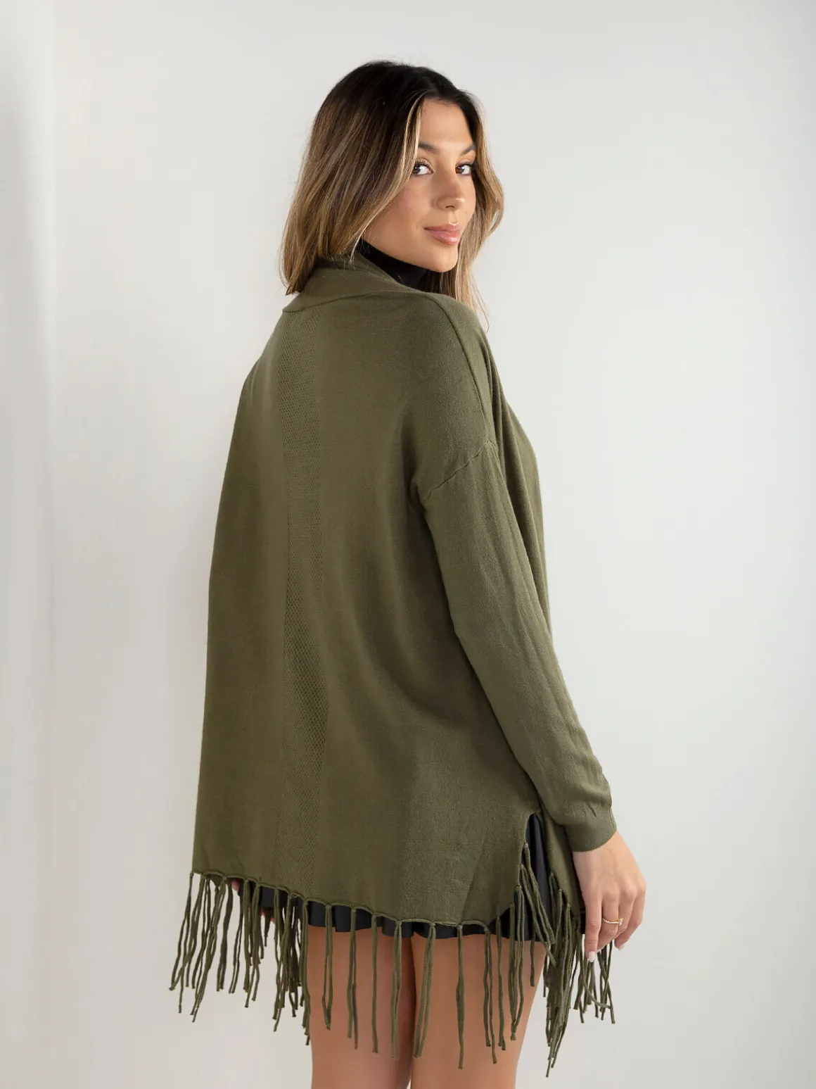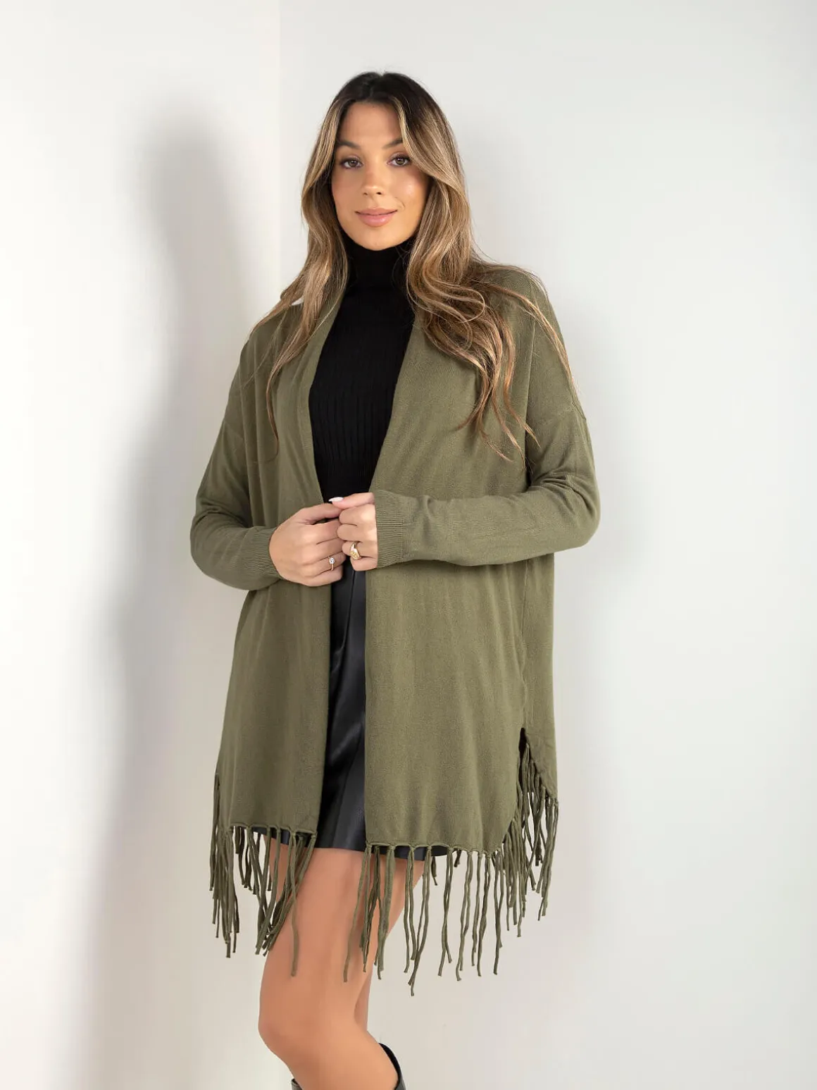 Casaco de malha fina, modelo aberto e com franjas na base. Leve, fluido e perfeito para dar um toque boho aos looks do dia a dia.Altura da Modelo: 175 cm | Tamanho: Tamanho Único