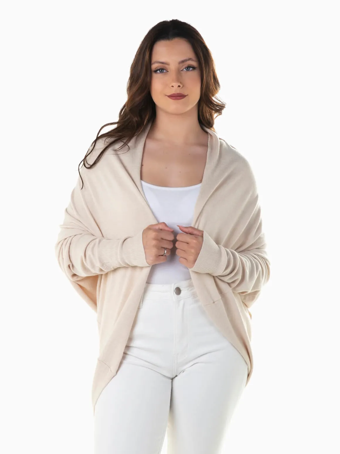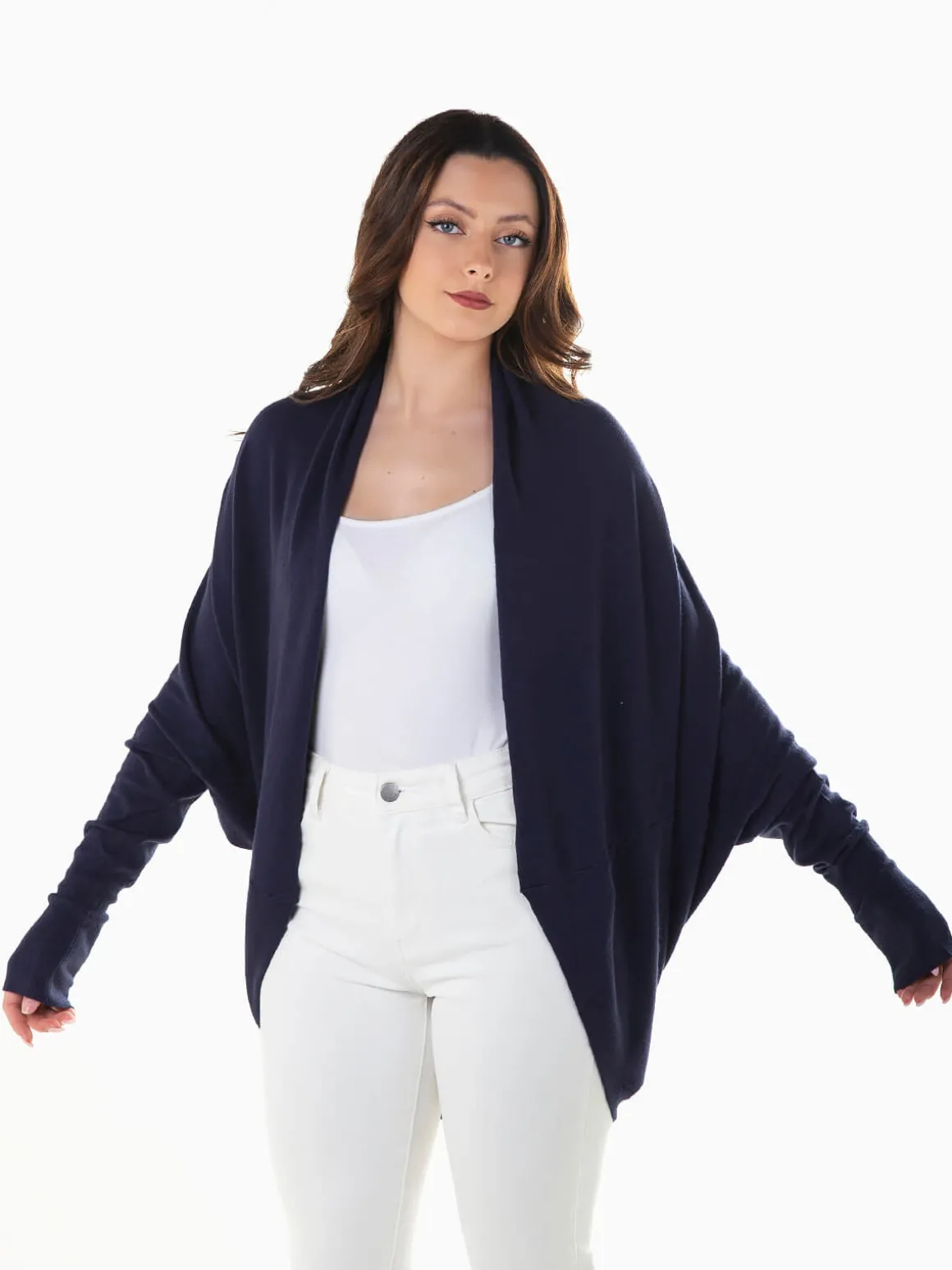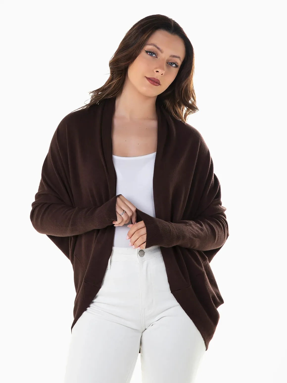 Casaco de malha aberto com manga morcego para senhora. Cardigan largo confeccionado em tecido mistura viscose para maior conforto. Punhos canelados. Altura da Modelo: 163 cm | Tamanho: S/M