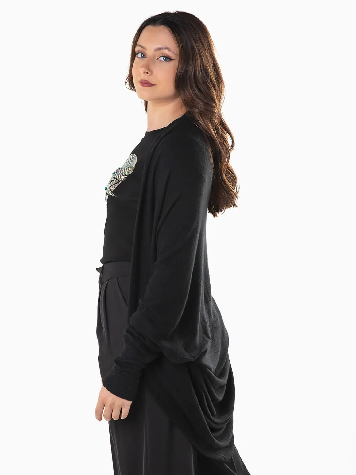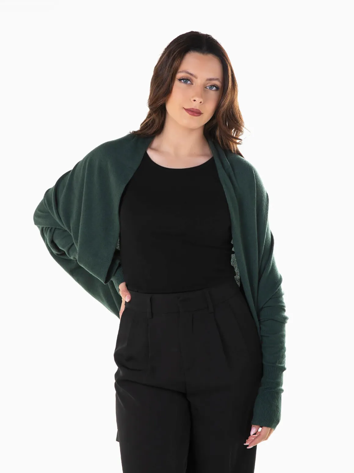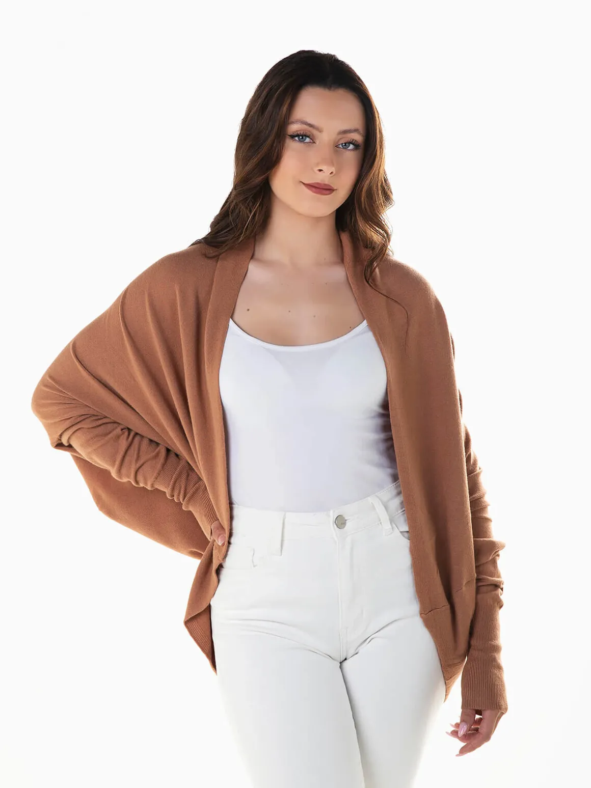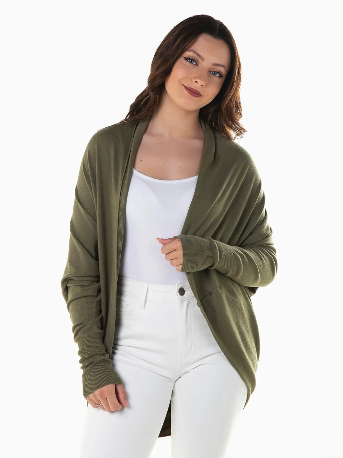 Casaco de malha aberto com manga morcego para senhora. Cardigan largo confeccionado em tecido mistura viscose para maior conforto. Punhos canelados. Altura da Modelo: 163 cm | Tamanho: S/M