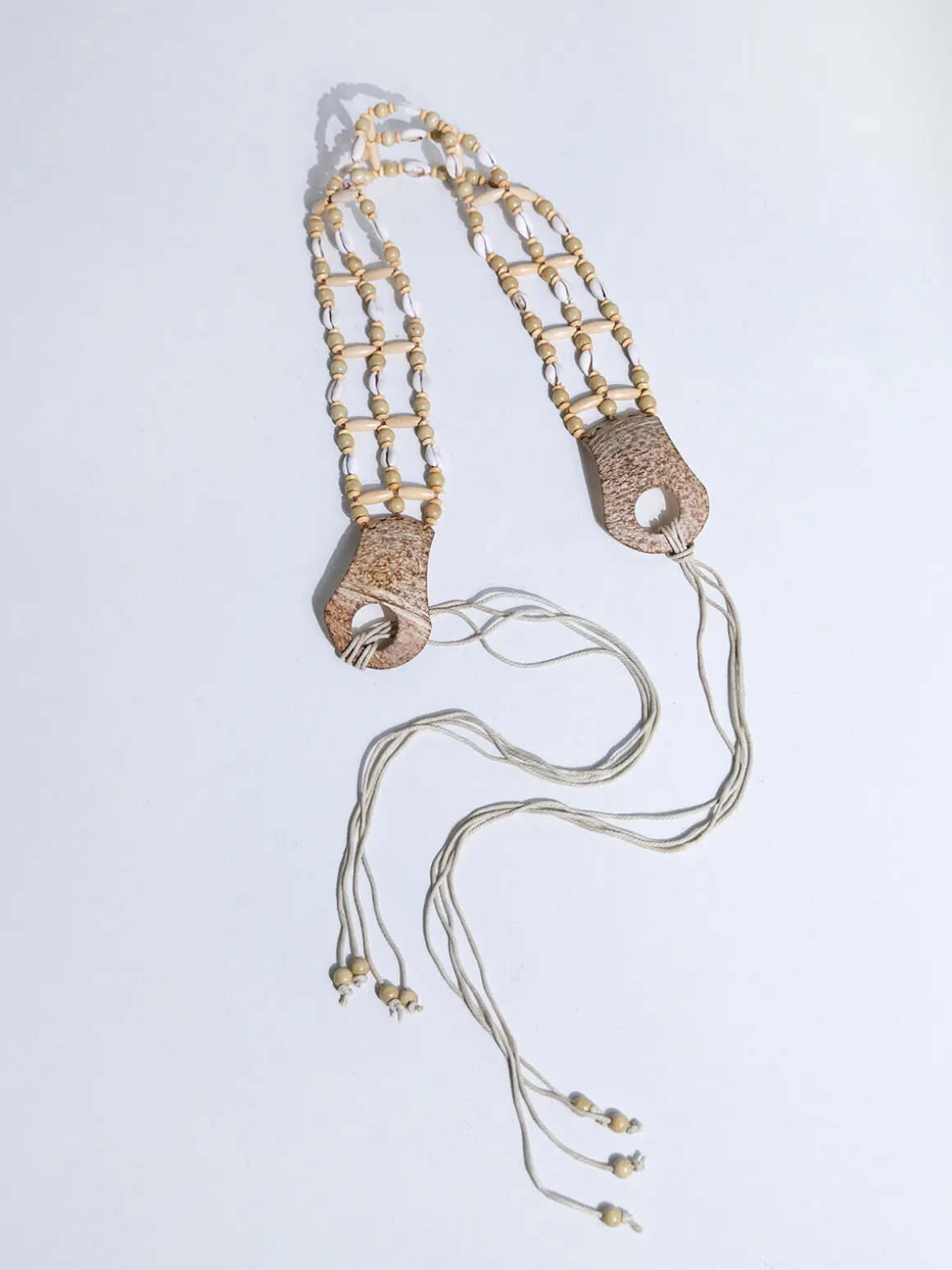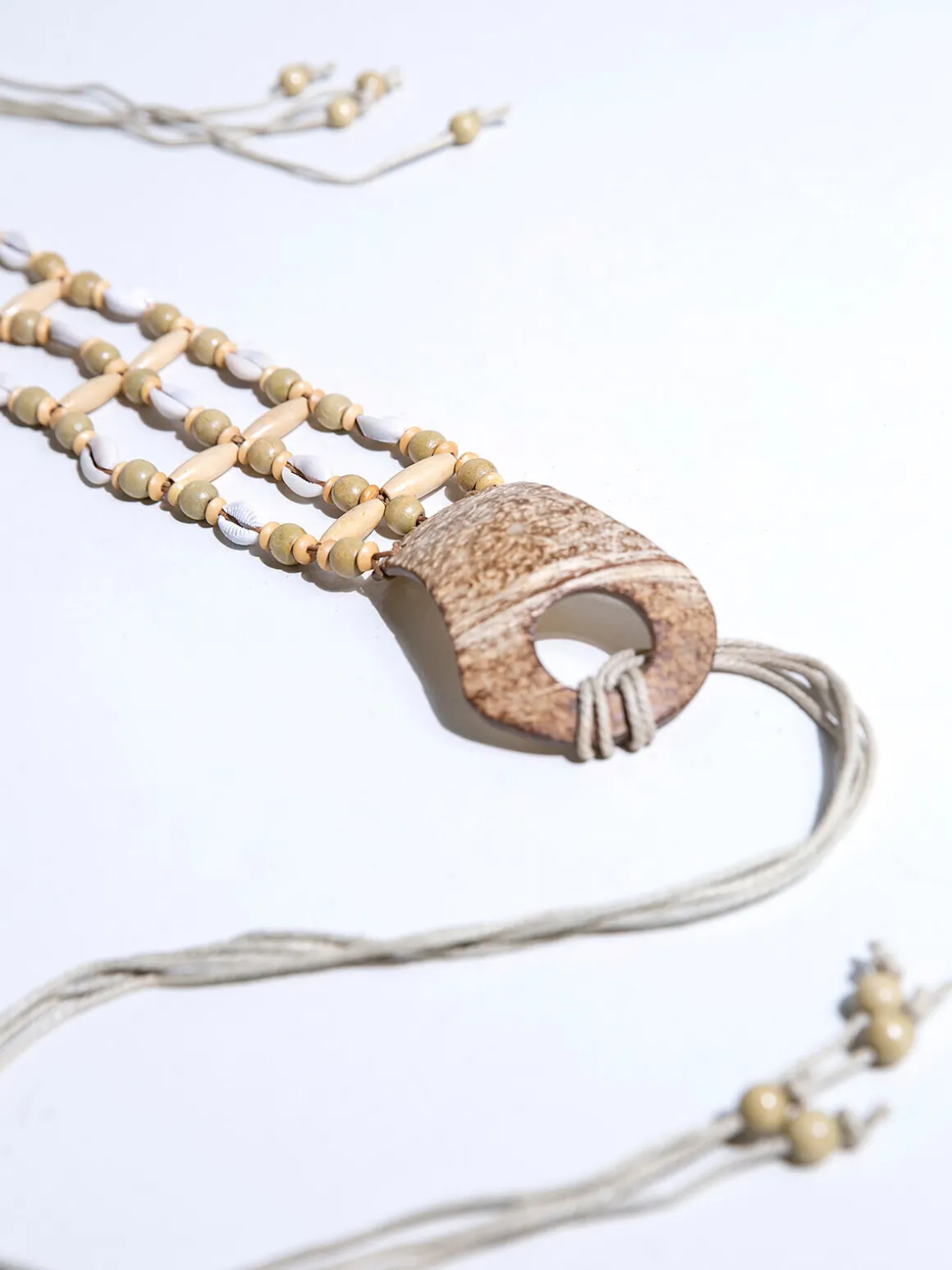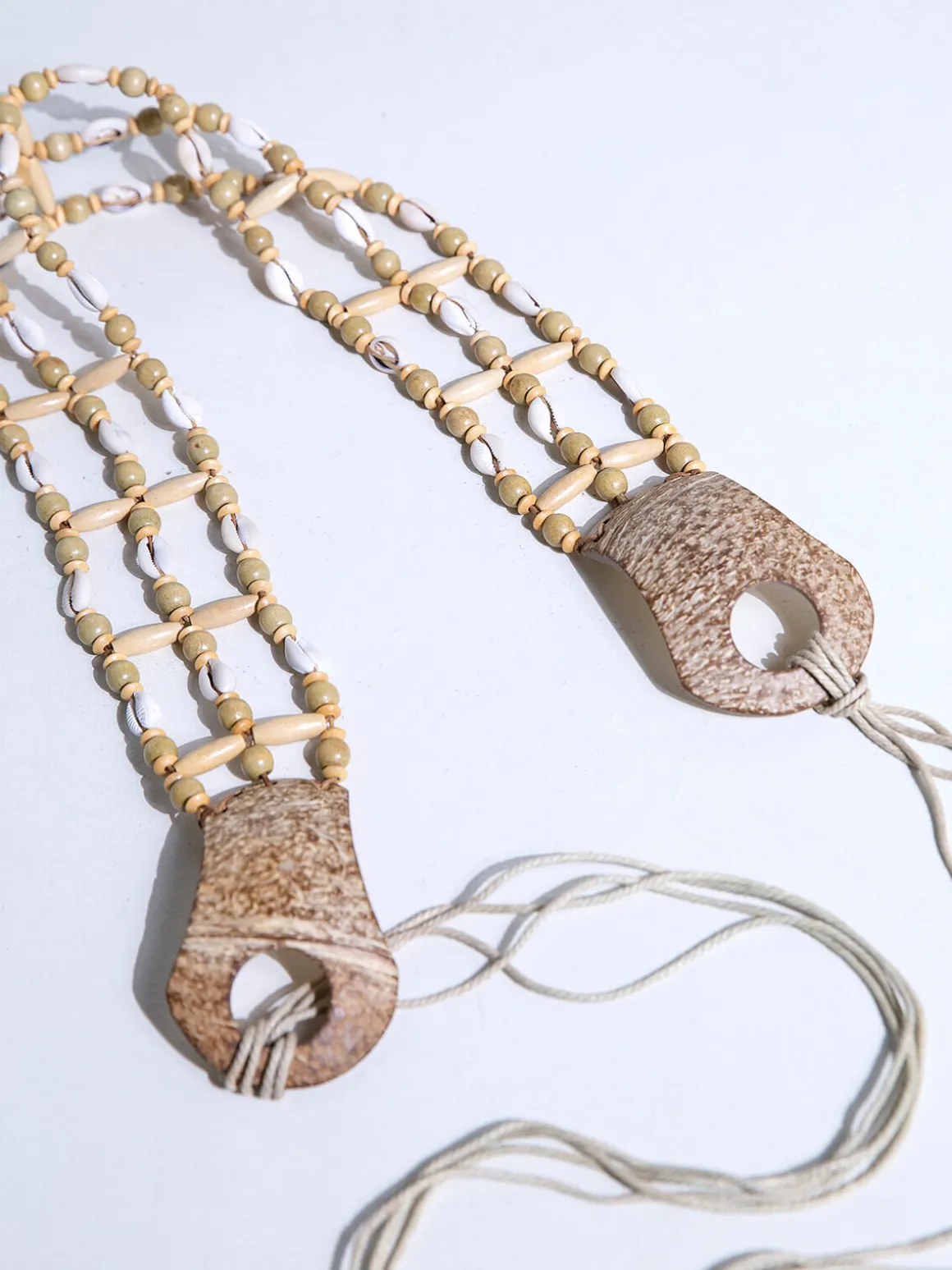 Cinto bege com conchas e missangas de madeira. Cinto de juta.