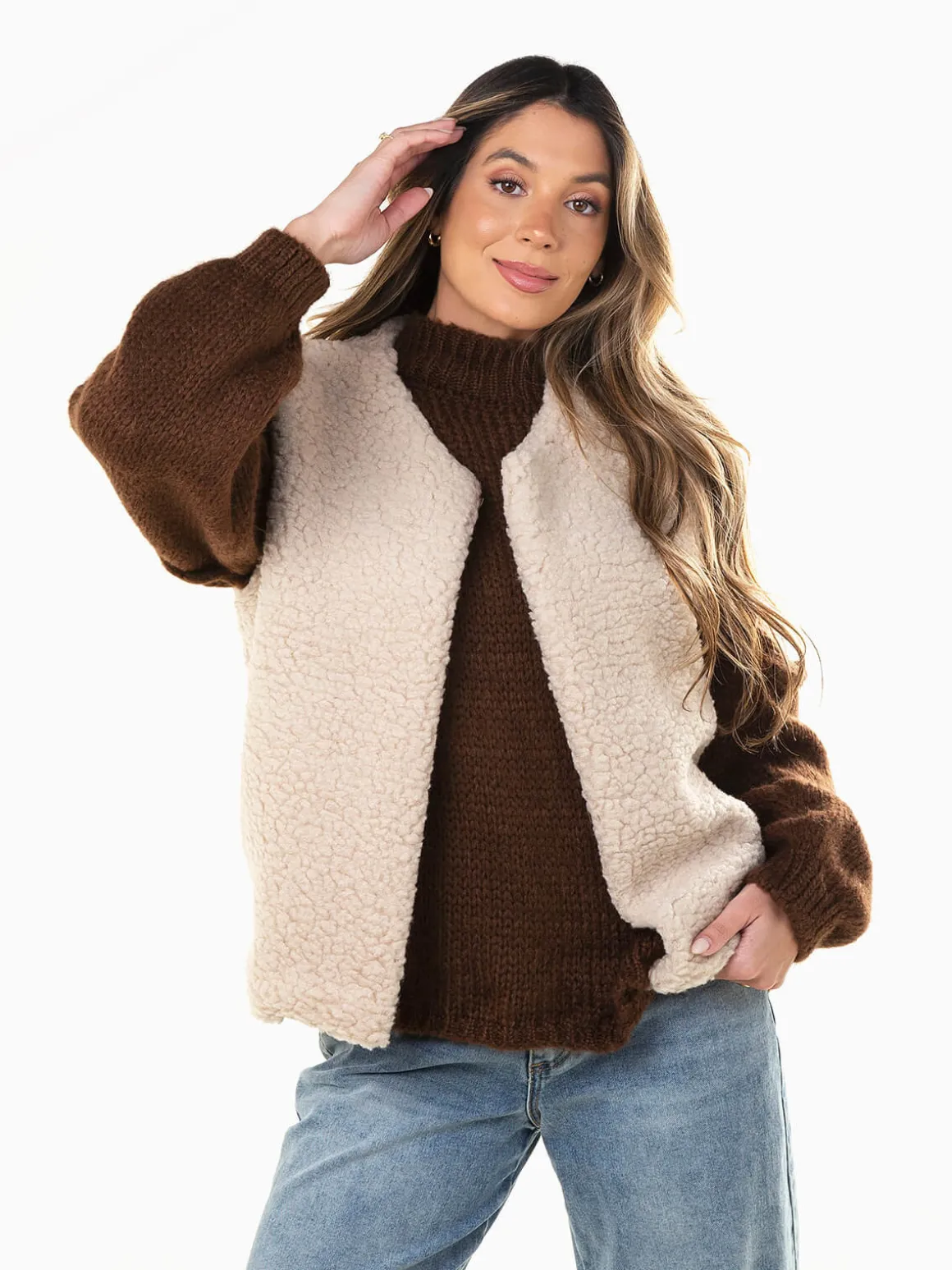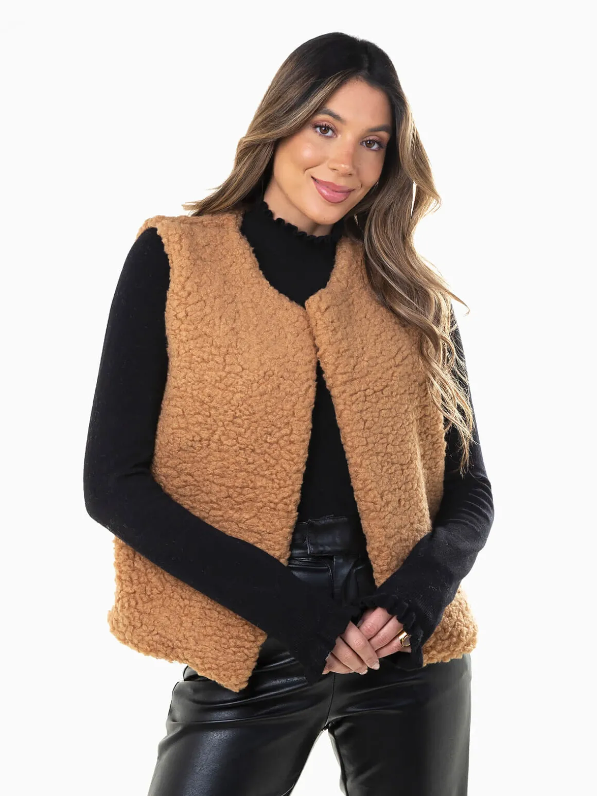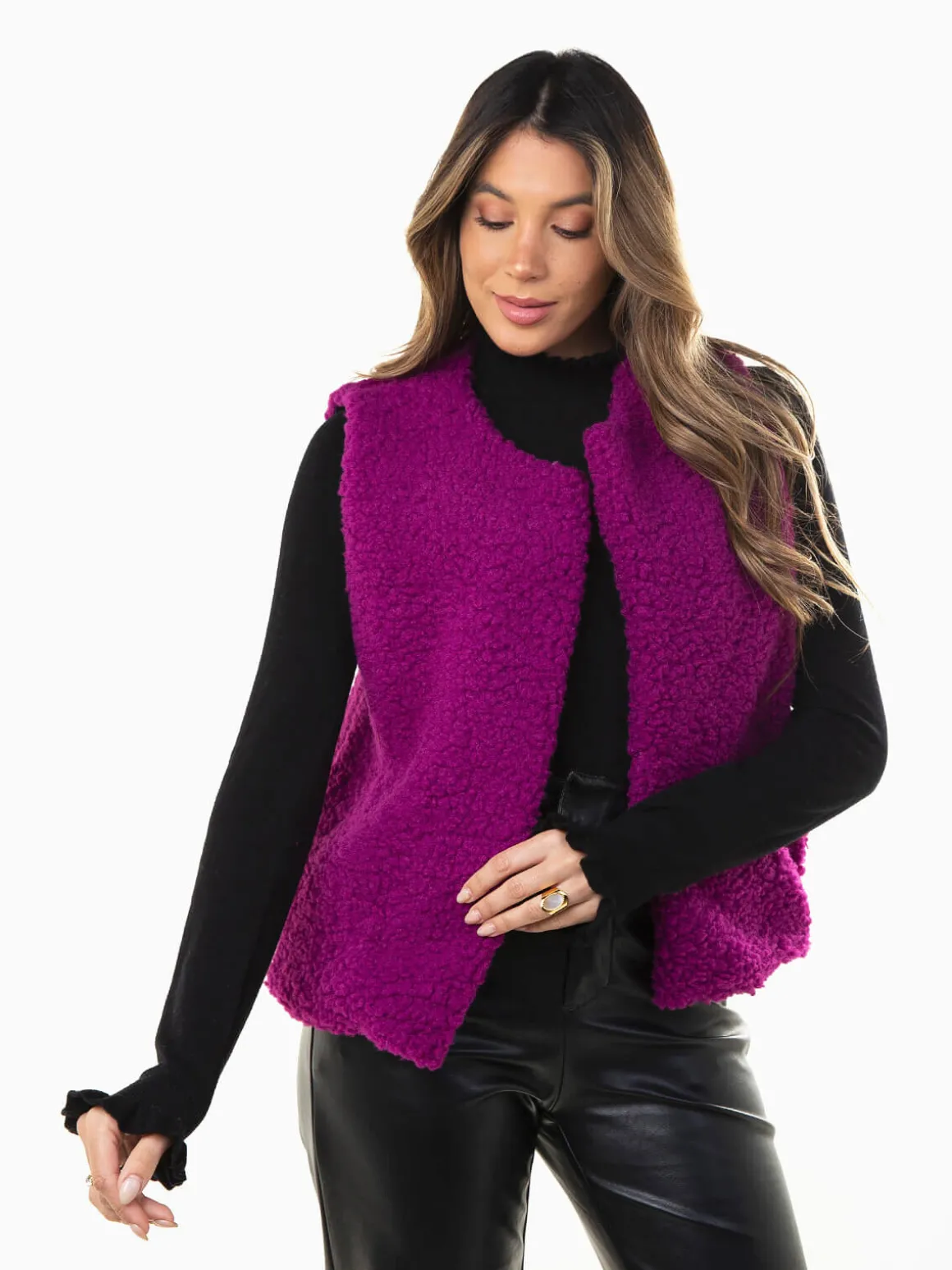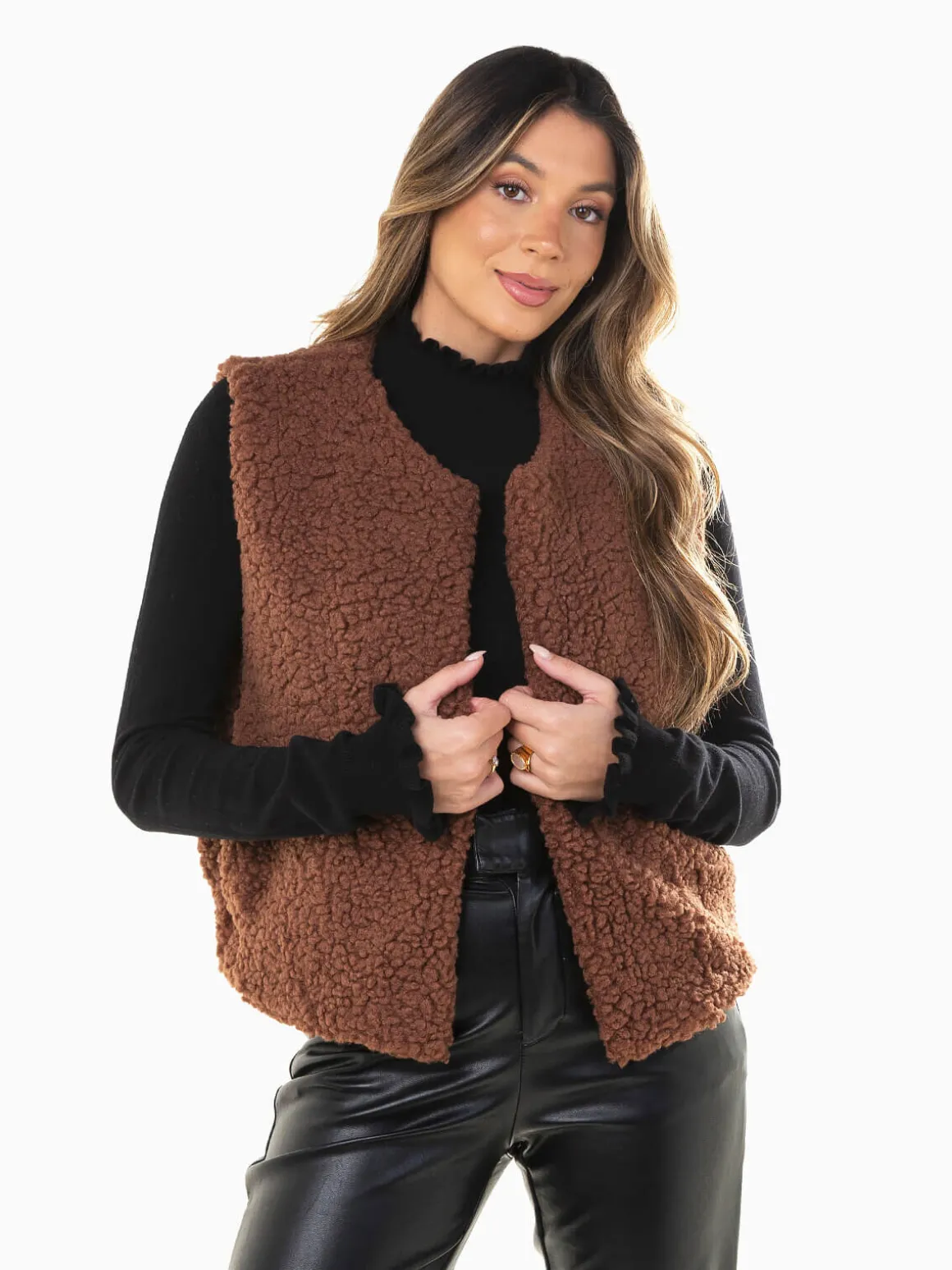 Colete aberto com efeito pelo de ovelha, forrado no interior e com decote redondo. Uma peça leve, prática e perfeita para criar camadas confortáveis no dia a dia.Altura da Modelo: 175 cm | Tamanho: Tamanho Único