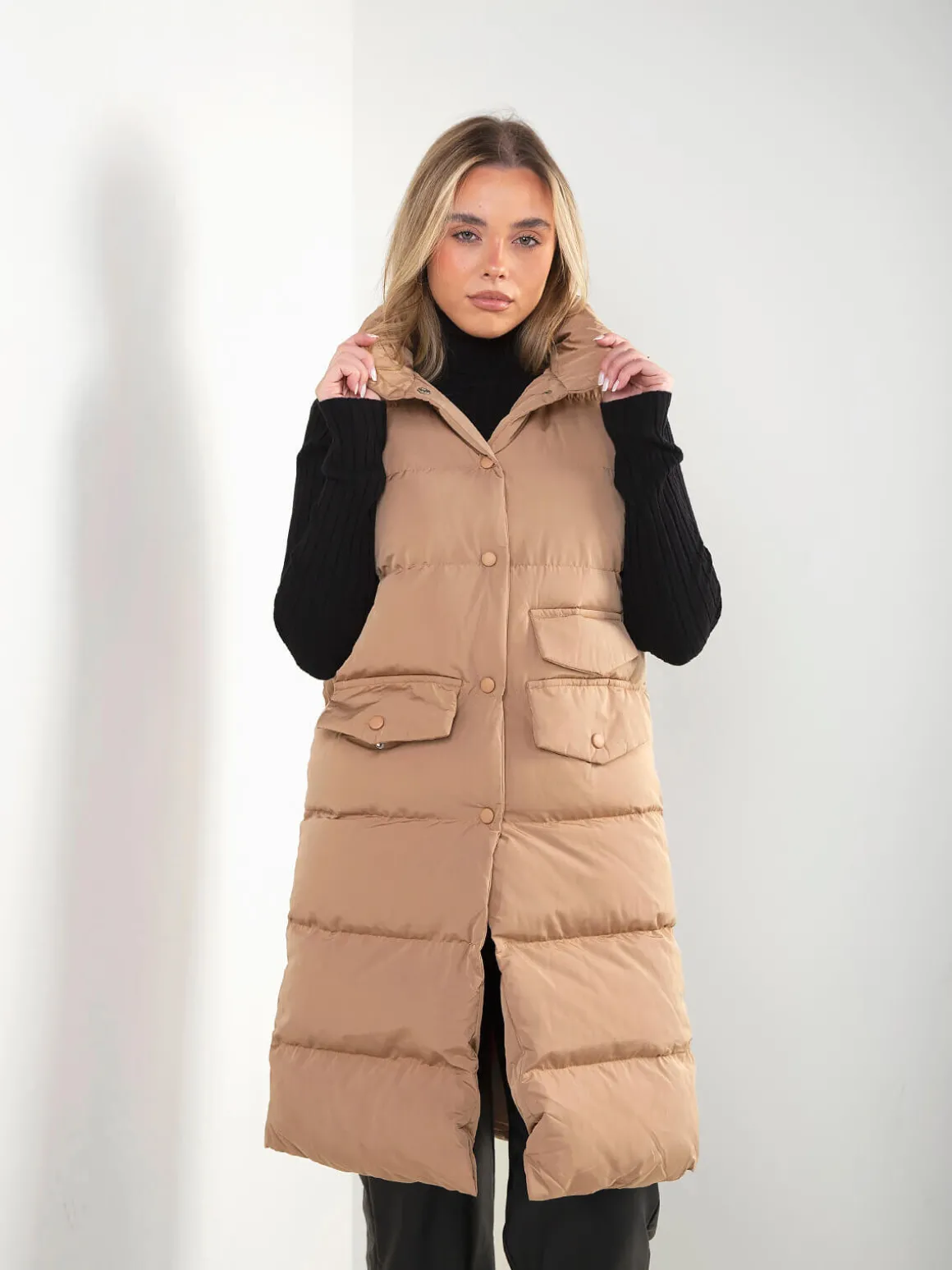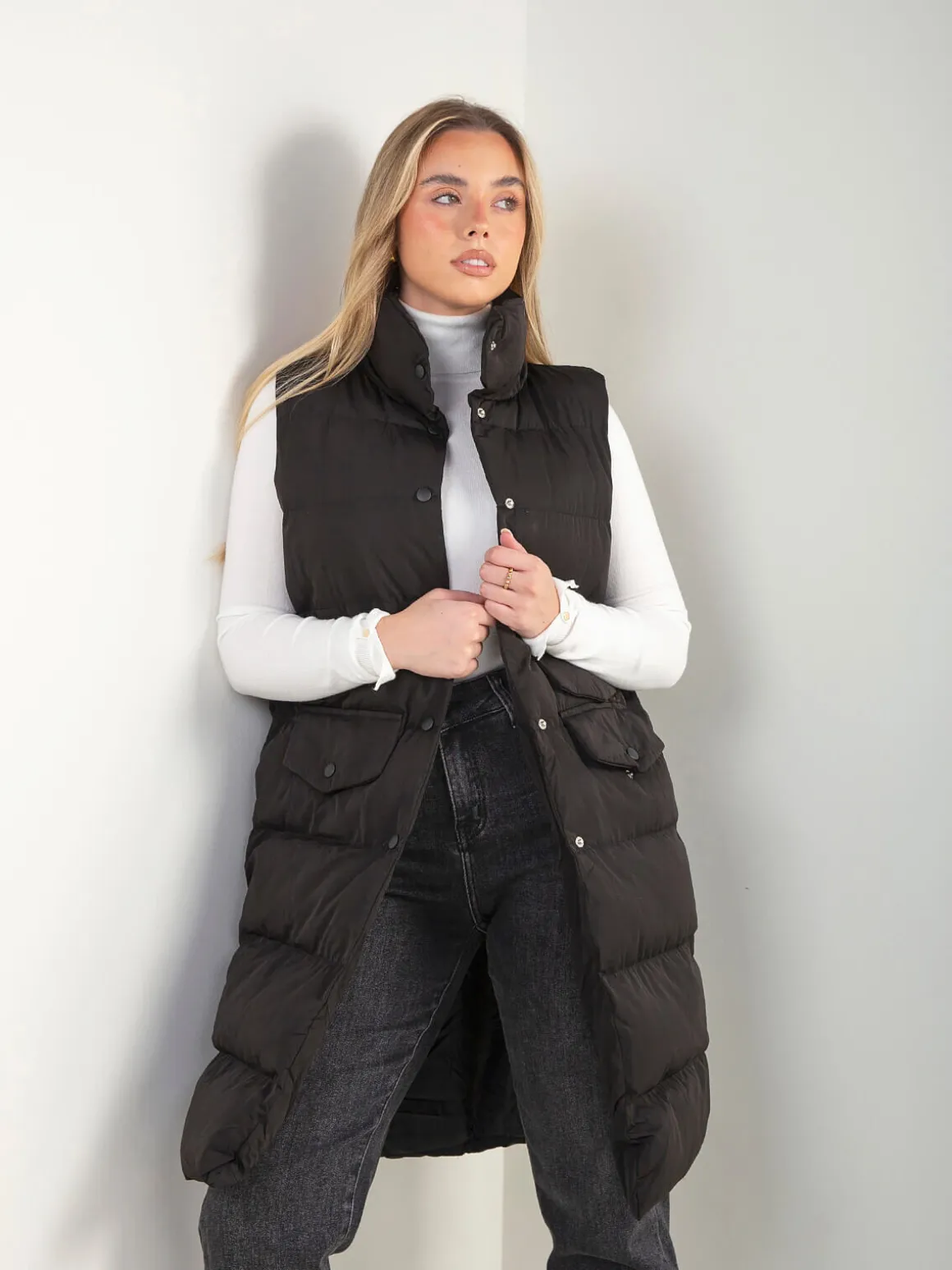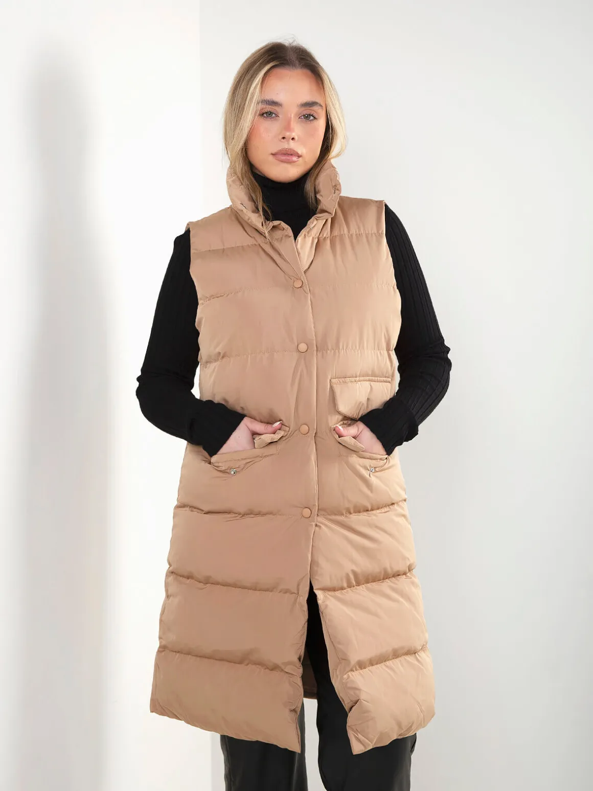 Colete acolchoado comprido, com gola subida e fecho frontal de botões de pressão. Modelo com dois bolsos frontais. Ideal para conjugar com malhas de gola subida ou camadas leves.Altura da Modelo: 166 cm | Tamanho: Tamanho Único