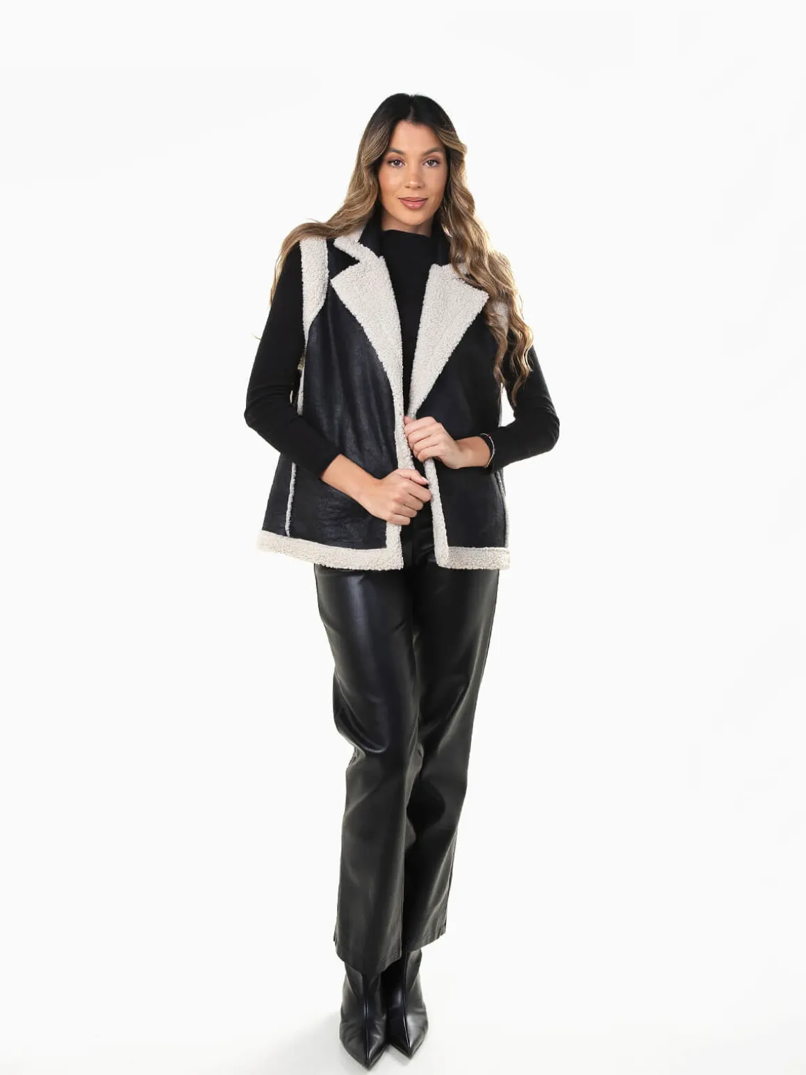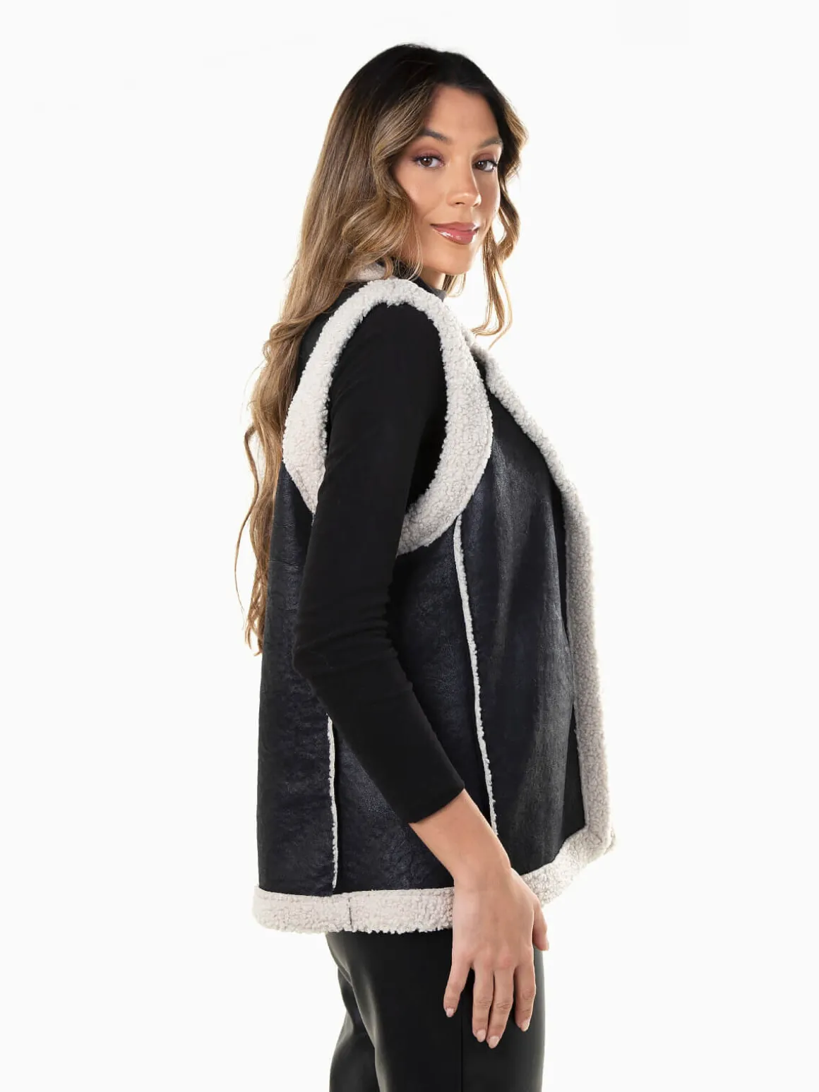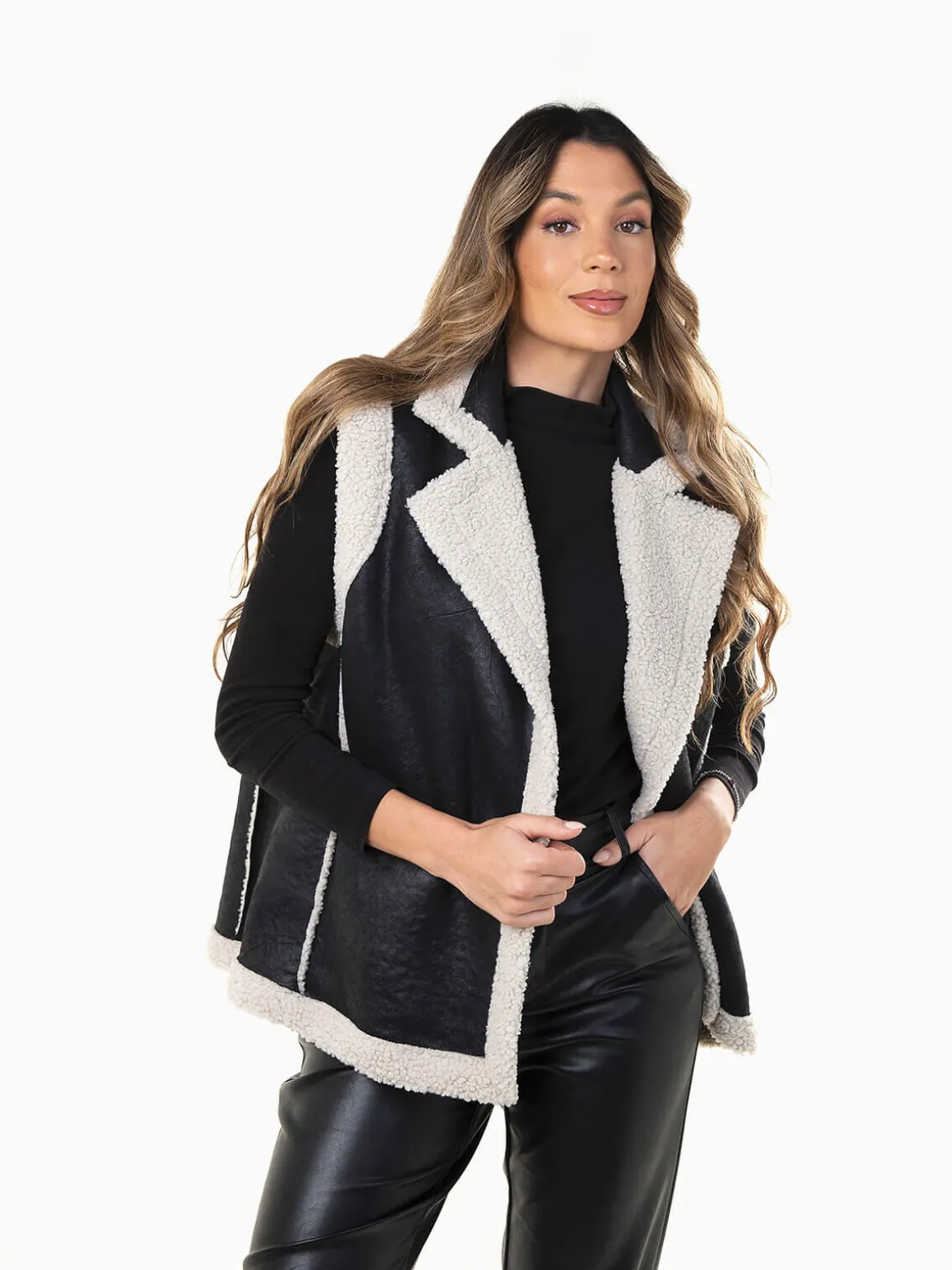 Colete em efeito pele envelhecida com interior e rebordo em pelo encaracolado. Modelo aberto, quente e moderno.Altura da Modelo: 175 cm | Tamanho: Tamanho Único