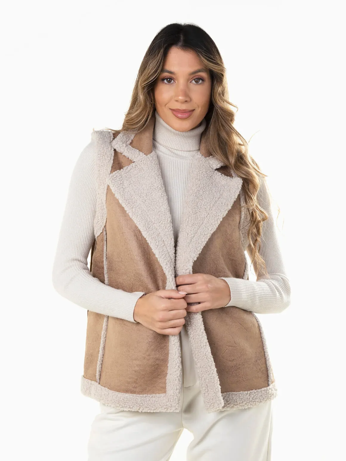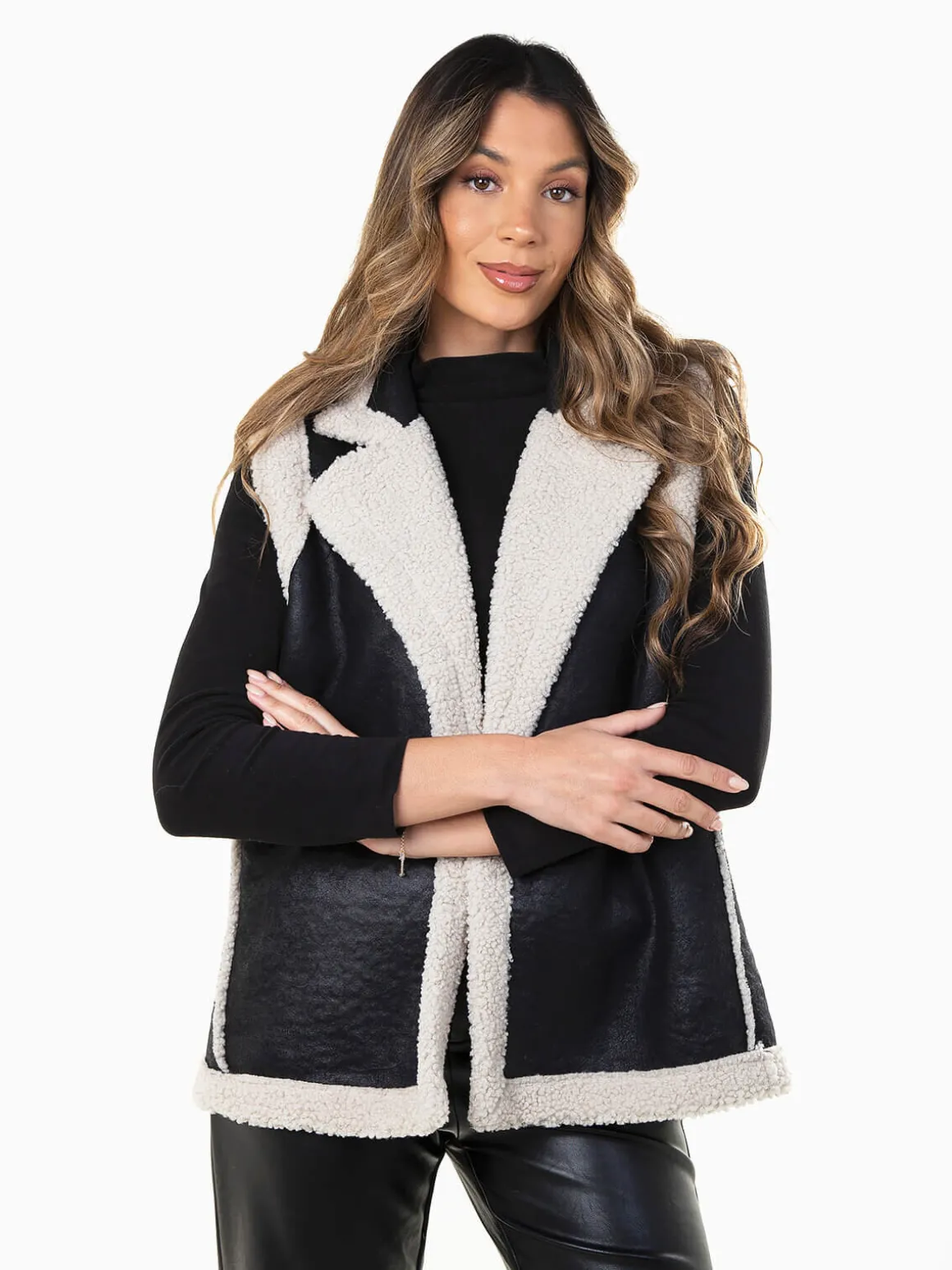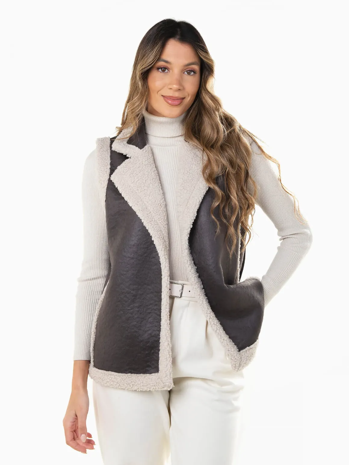 Colete em efeito pele envelhecida com interior e rebordo em pelo encaracolado. Modelo aberto, quente e moderno.Altura da Modelo: 175 cm | Tamanho: Tamanho Único
