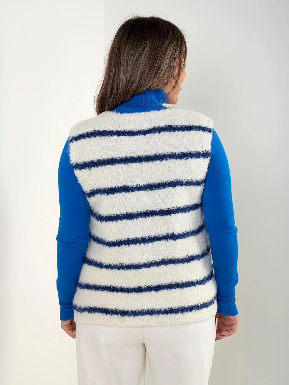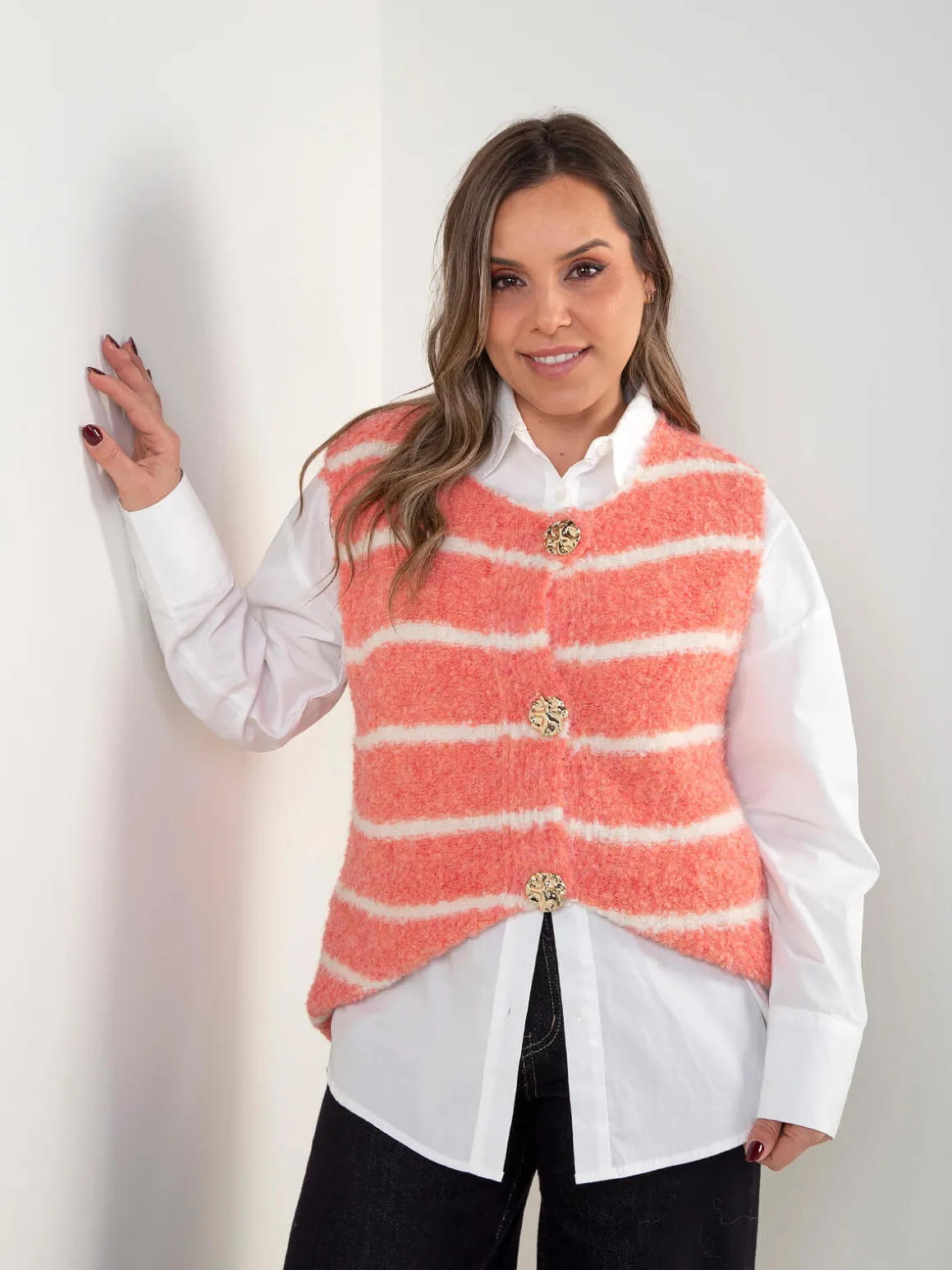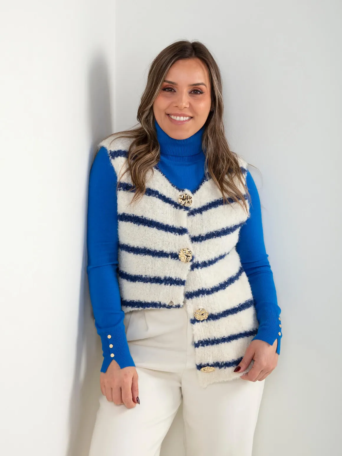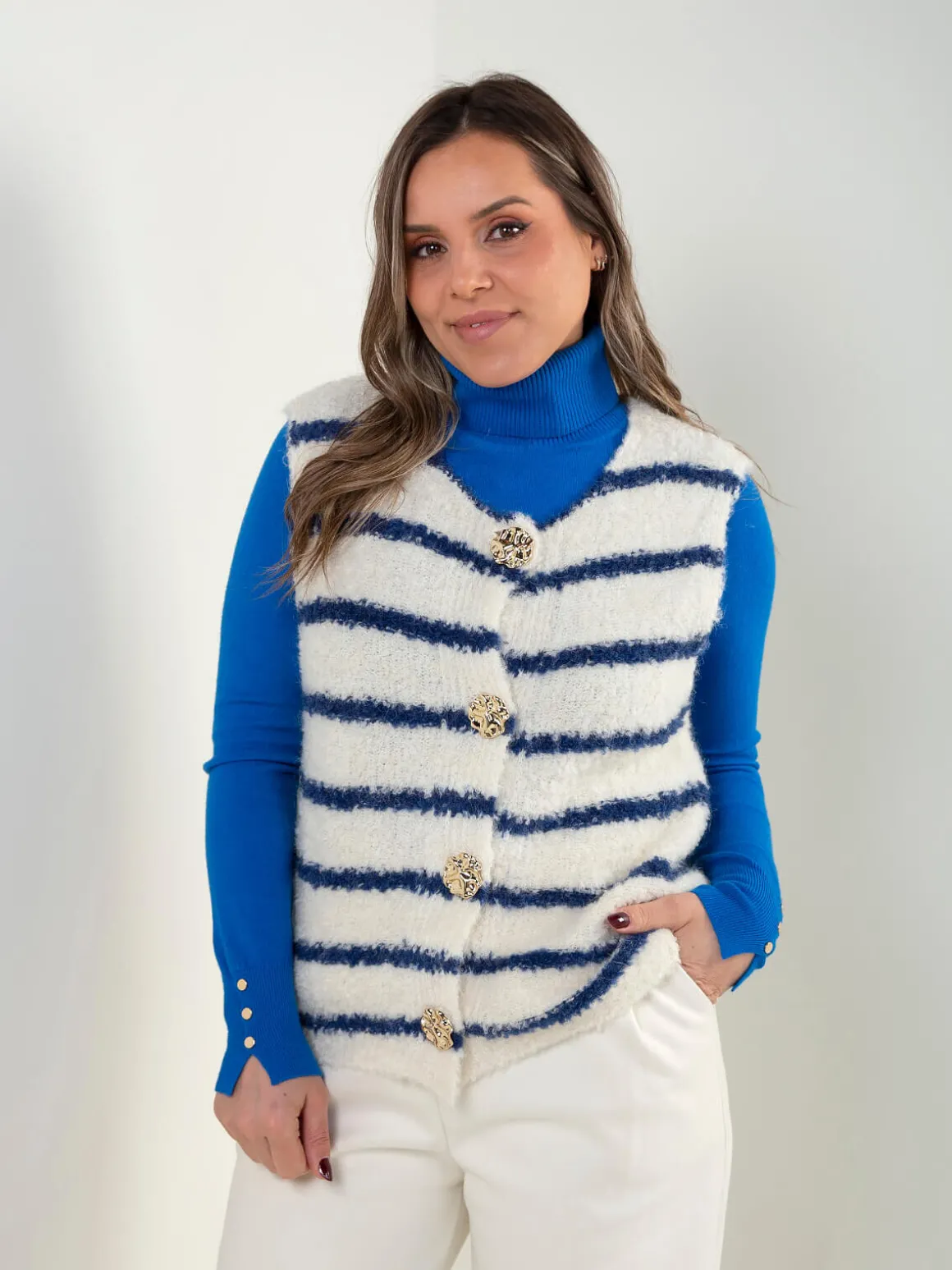 Colete de malha suave com padrão de riscas em contraste e botões dourados à frente. Decote redondo e acabamento simples, pensado para dar destaque ao detalhe e ao padrão, sem exageros. Ideal para looks clean com um toque mais cuidado.Altura da Modelo: 160 cm | Tamanho: Tamanho Único