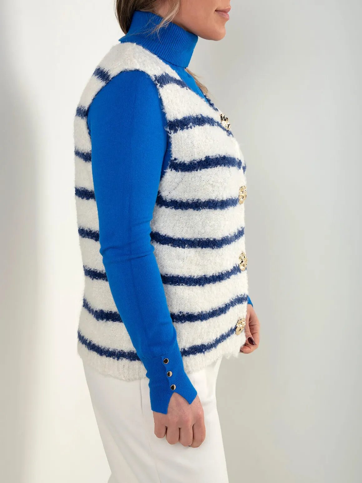 Colete malha às riscas com botões dourados