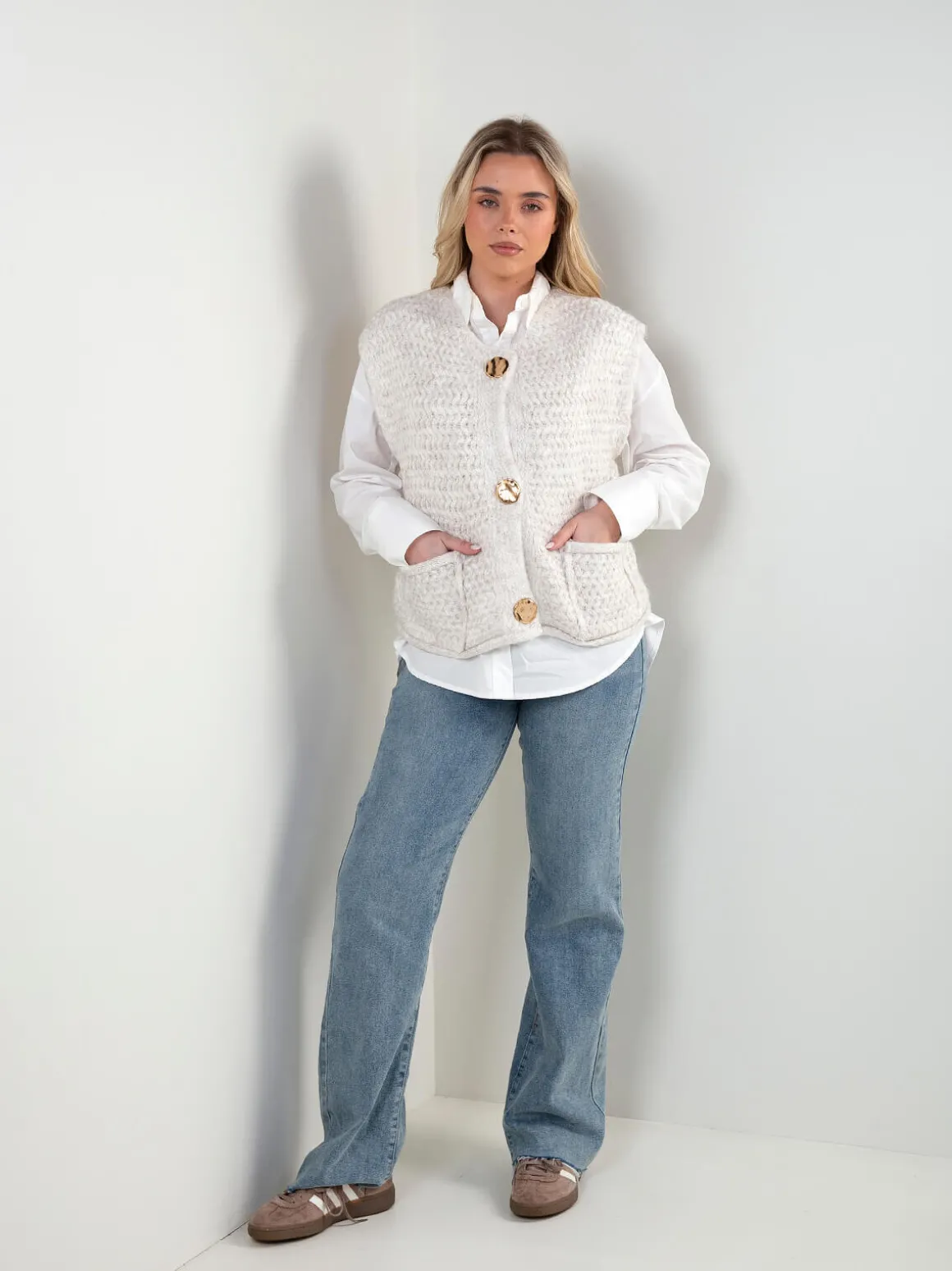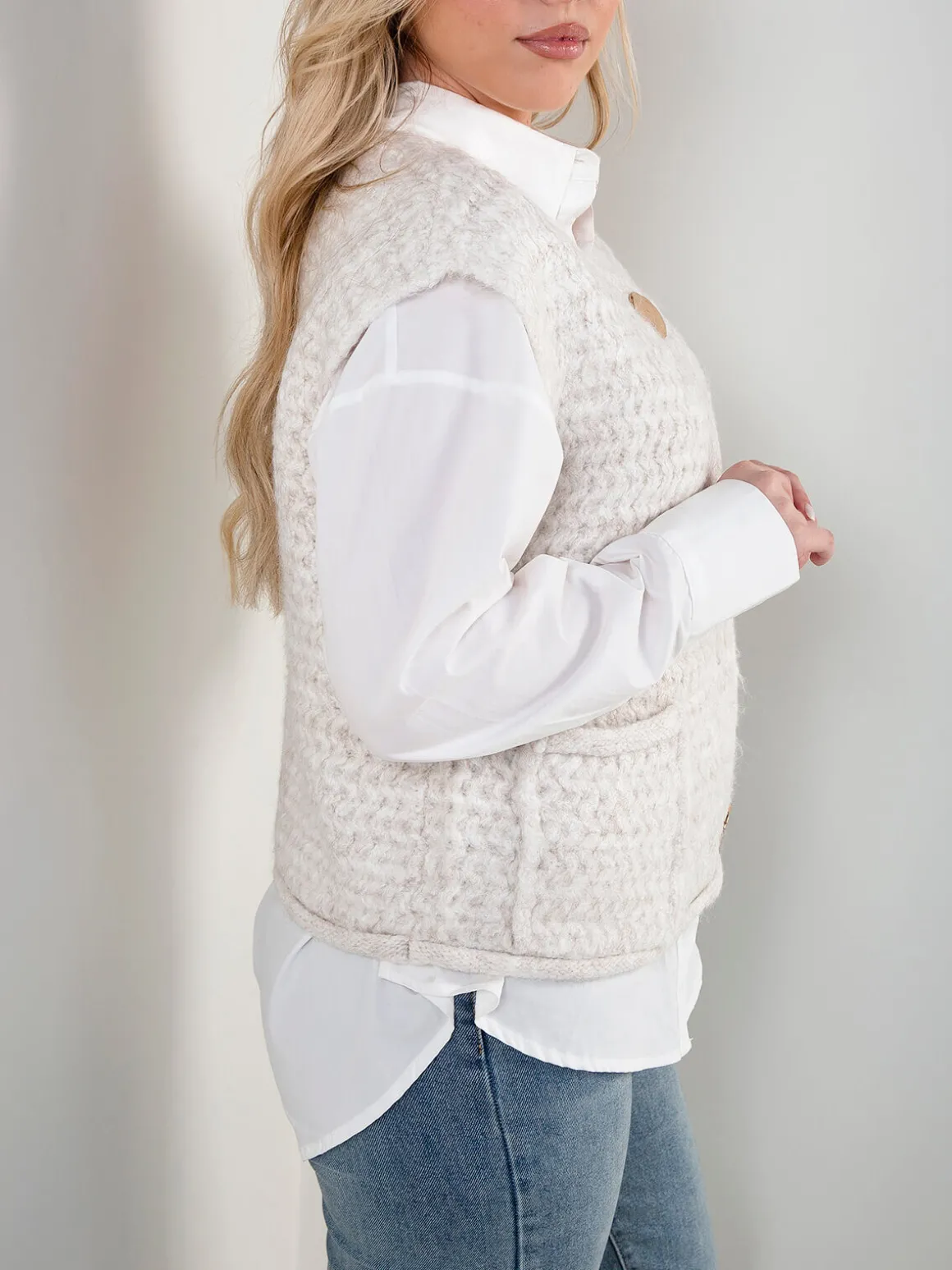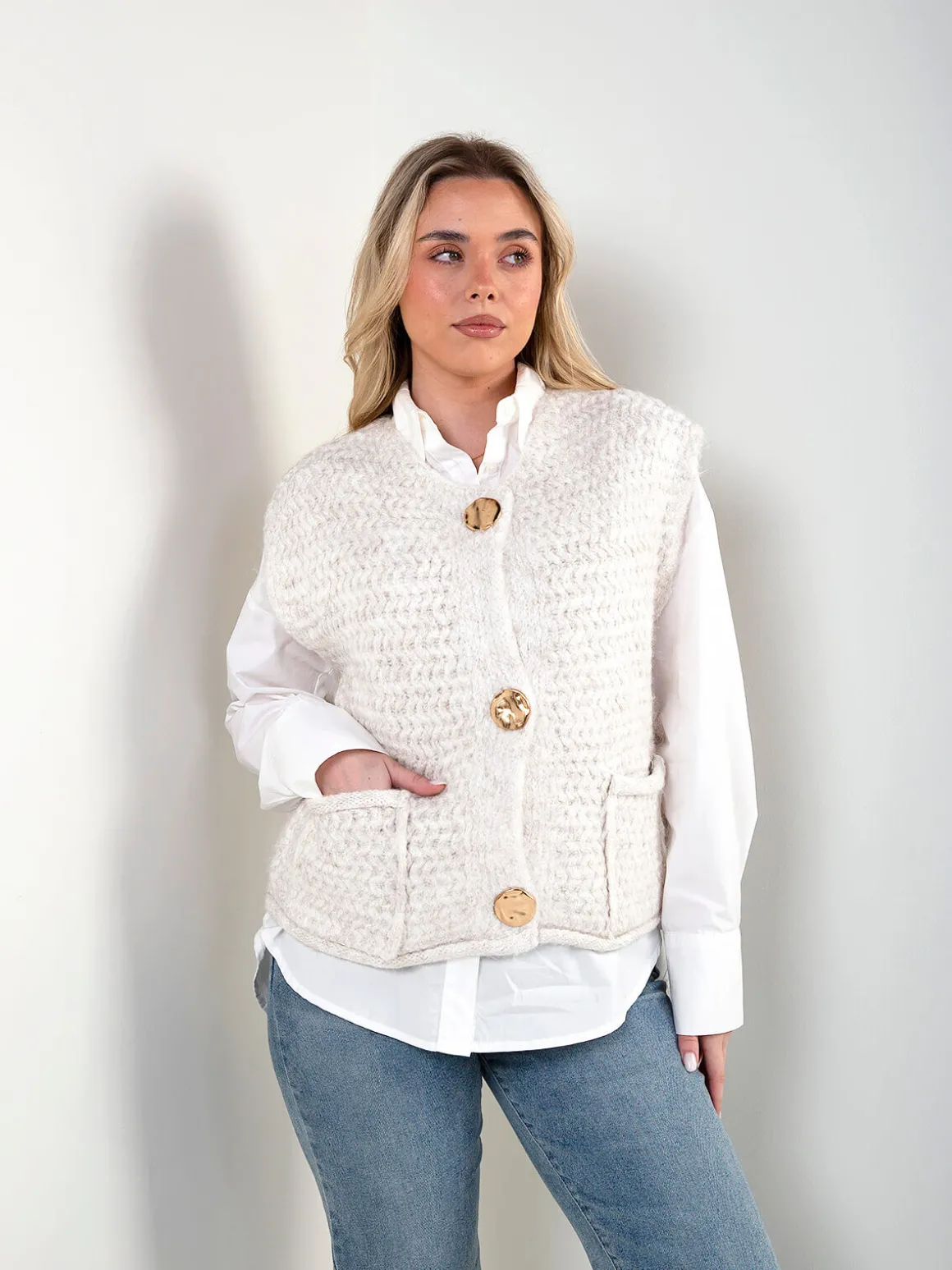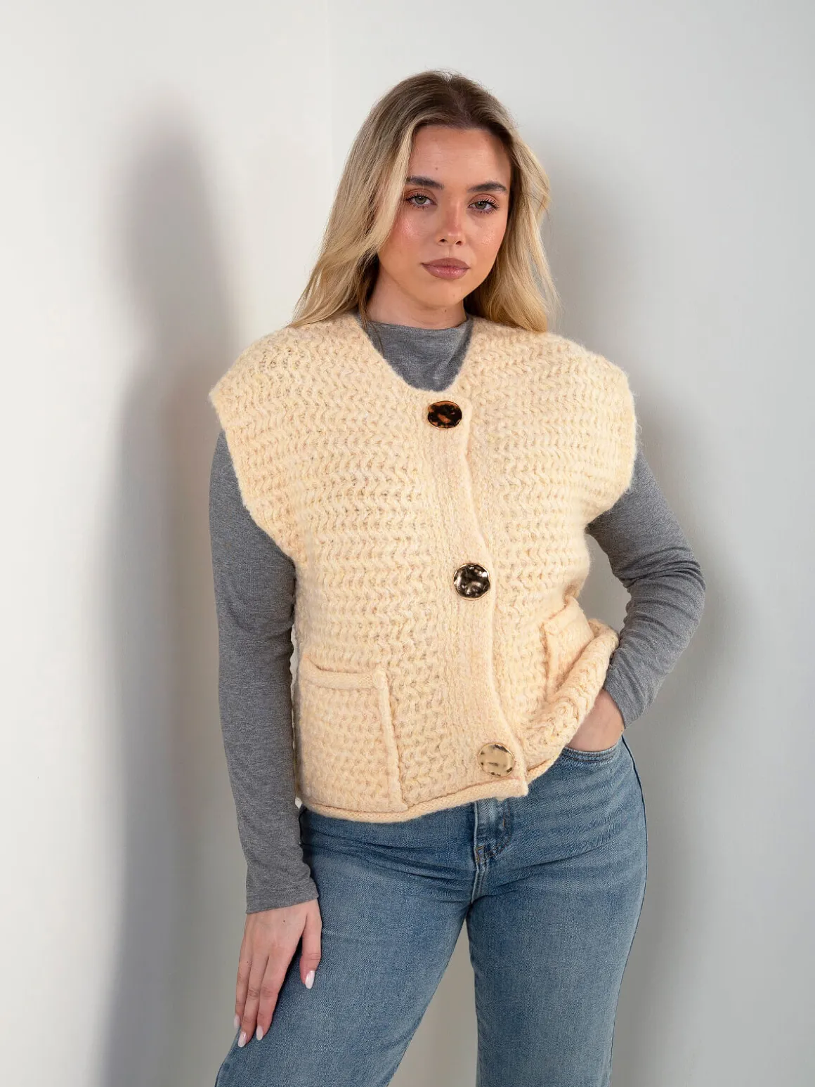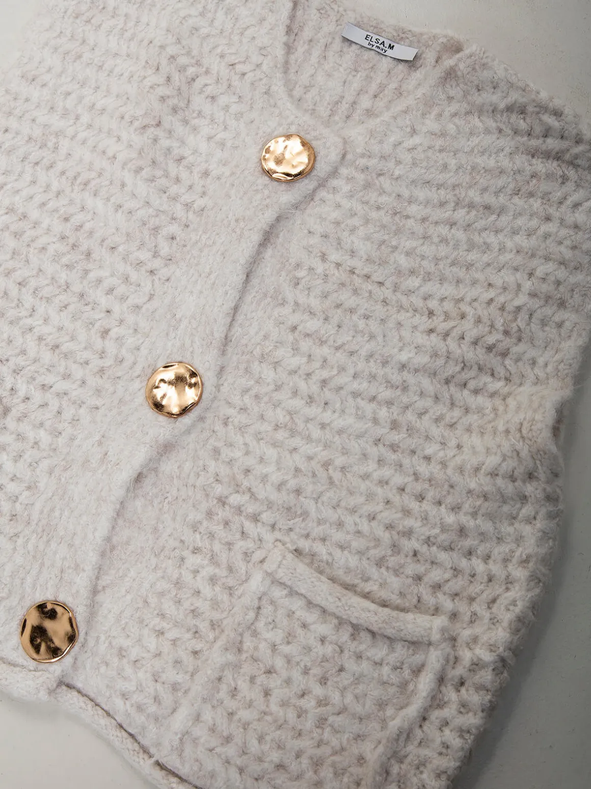 Colete em malha trabalhada, com decote redondo e aperto de botões dourados. Modelo sem mangas com bolsos frontais aplicados. Ideal para usar sobre camisolas de malha fina ou camisas, em looks de meia-estação ou camadas de inverno.Altura da Modelo: 166 cm | Tamanho: Tamanho Único
