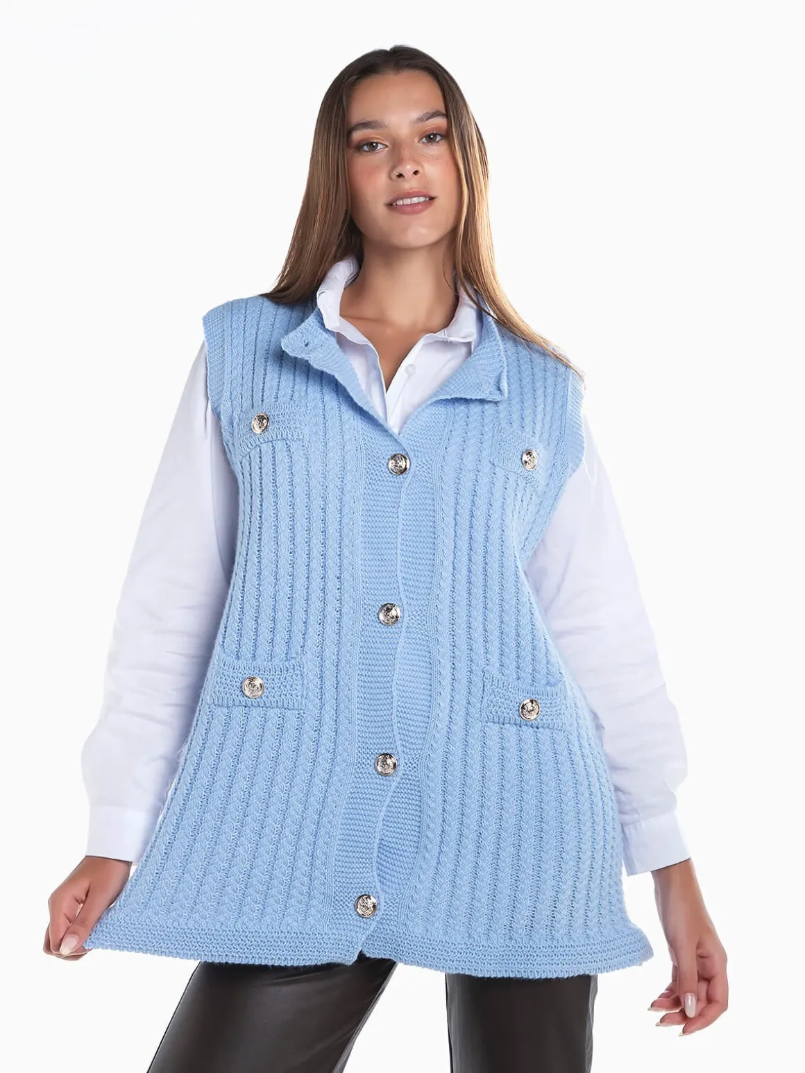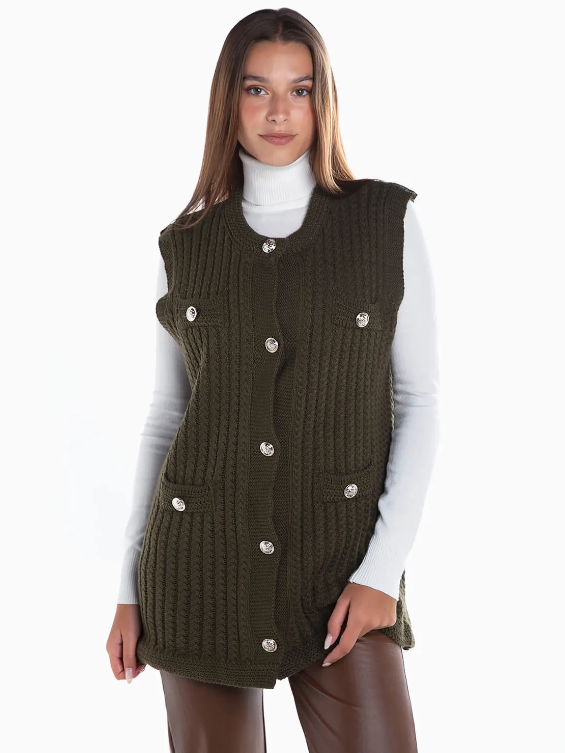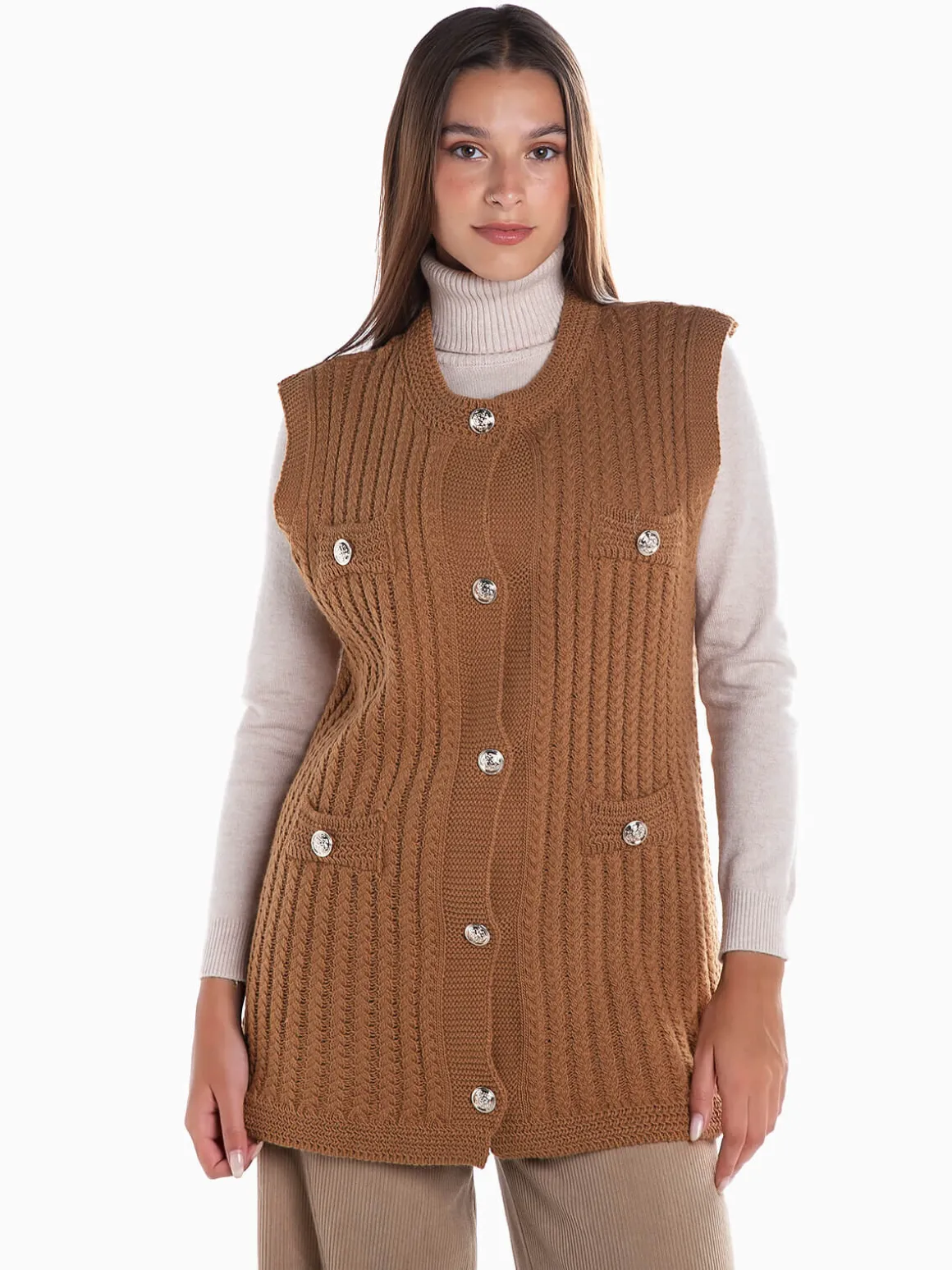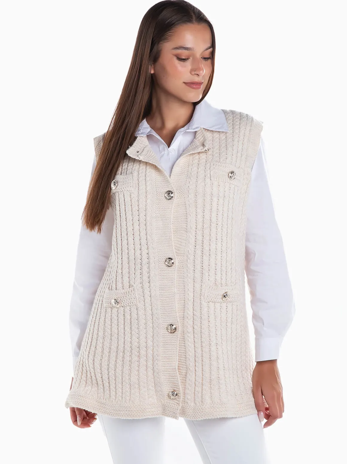 Colete em malha entrançada com aperto botões prateados em contraste. Colete manga cava com decote redondo. Corte comprido. Altura da Modelo: 170 cm | Tamanho: Tamanho Único