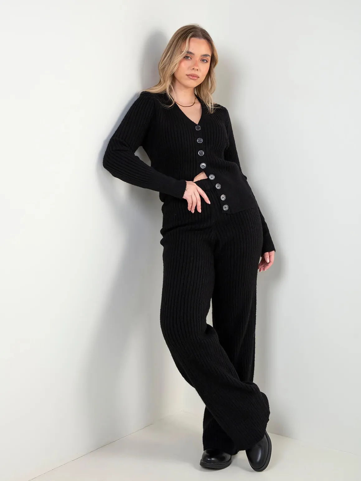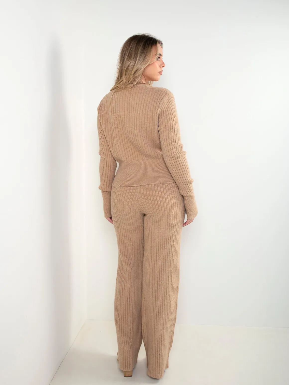 Conjunto de malha canelada composto por casaco com gola em V, fecho de botões e manga comprida, e calças de cintura elástica para maior conforto. Modelo ajustado, ideal para o dia a dia, fácil de usar em conjunto ou separado.Altura da Modelo: 166 cm | Tamanho: Tamanho Único