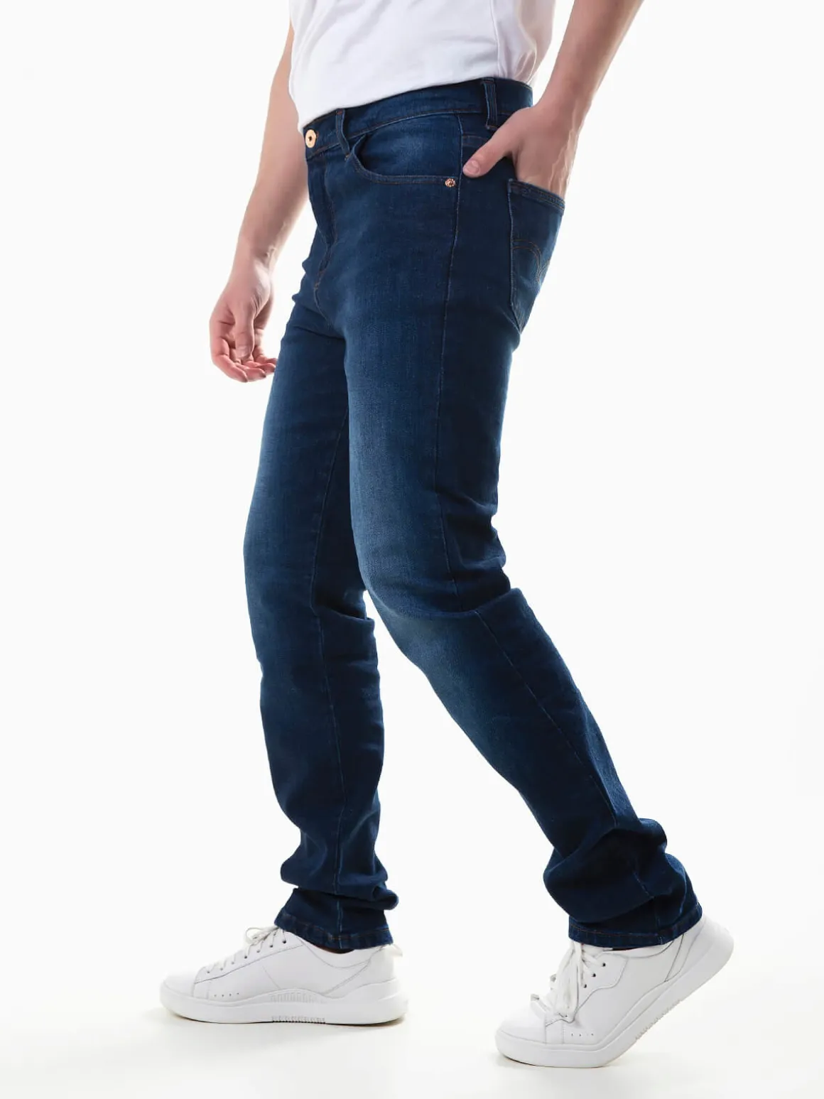 Jeans straight fit com lavagem azul escuro. Calças ganga com 5 bolsos. Aperto fecho zíper e botão. Altura do Modelo: 180 cm | Tamanho: 42