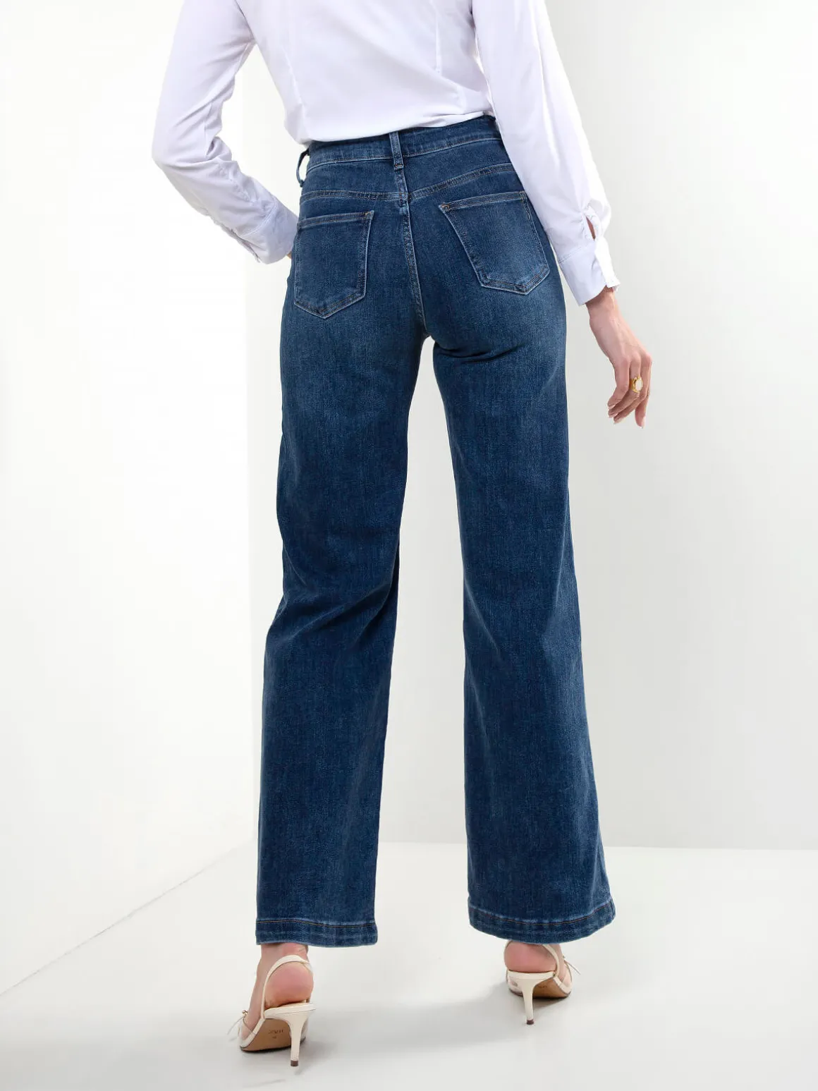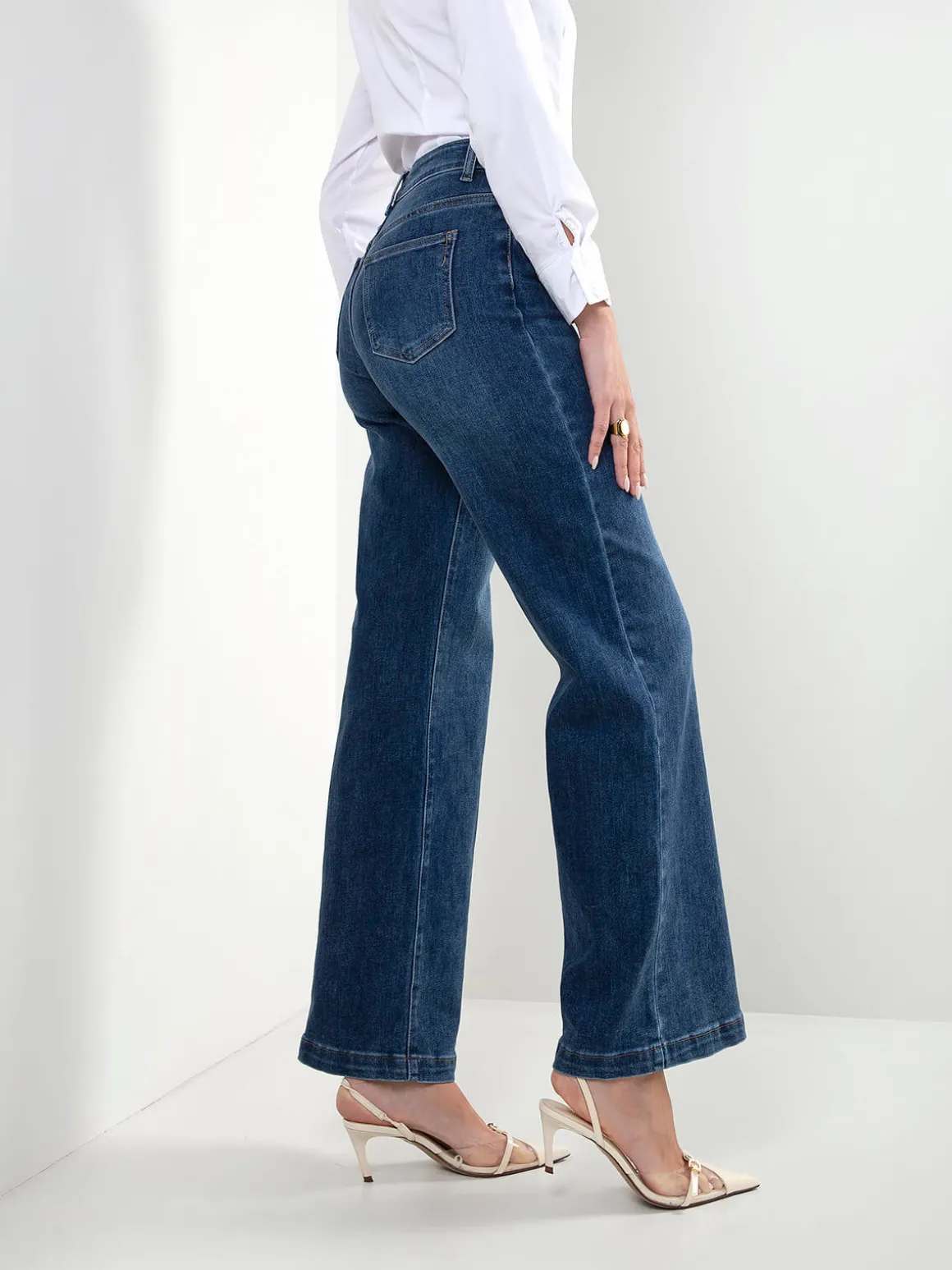 Calças de ganga wide leg com cintura alta. Modelo de 5 bolsos, com aperto por fecho de correr e botão. Lavagem azul escuro, ideal para looks atuais e versáteis.Altura da Modelo: 175 cm | Tamanho: S