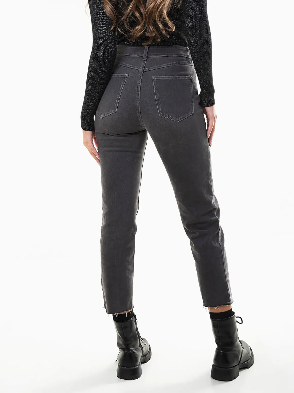 Mom jeans cinza de cintura alta com base desfiada, 5 bolsos e aperto com fecho éclair e botão. Confortáveis e versáteis, perfeitas para criar looks urbanos e descontraídos.Altura da Modelo: 175 cm | Tamanho: 36