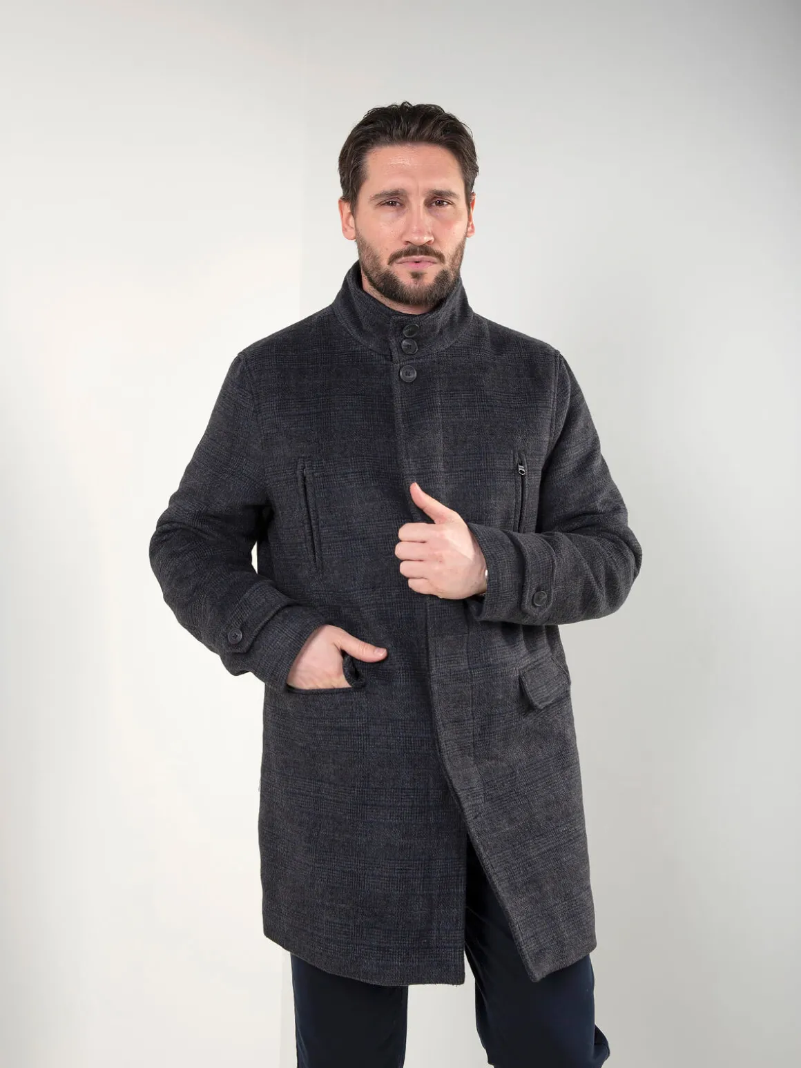 Sobretudo para homem em cinza escuro, com padrão discreto e corte clássico. Modelo com gola subida, fecho frontal e bolsos funcionais. Interior com forro acolchoado, ideal para proteger do frio mantendo um visual elegante e versátil para o dia a dia.Altura do Modelo: 180 cm | Tamanho: L