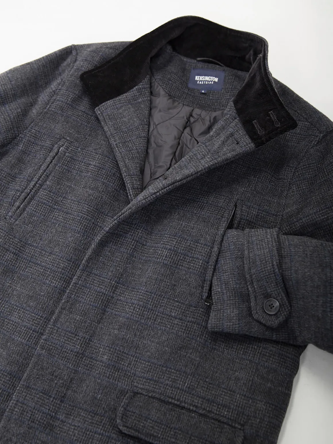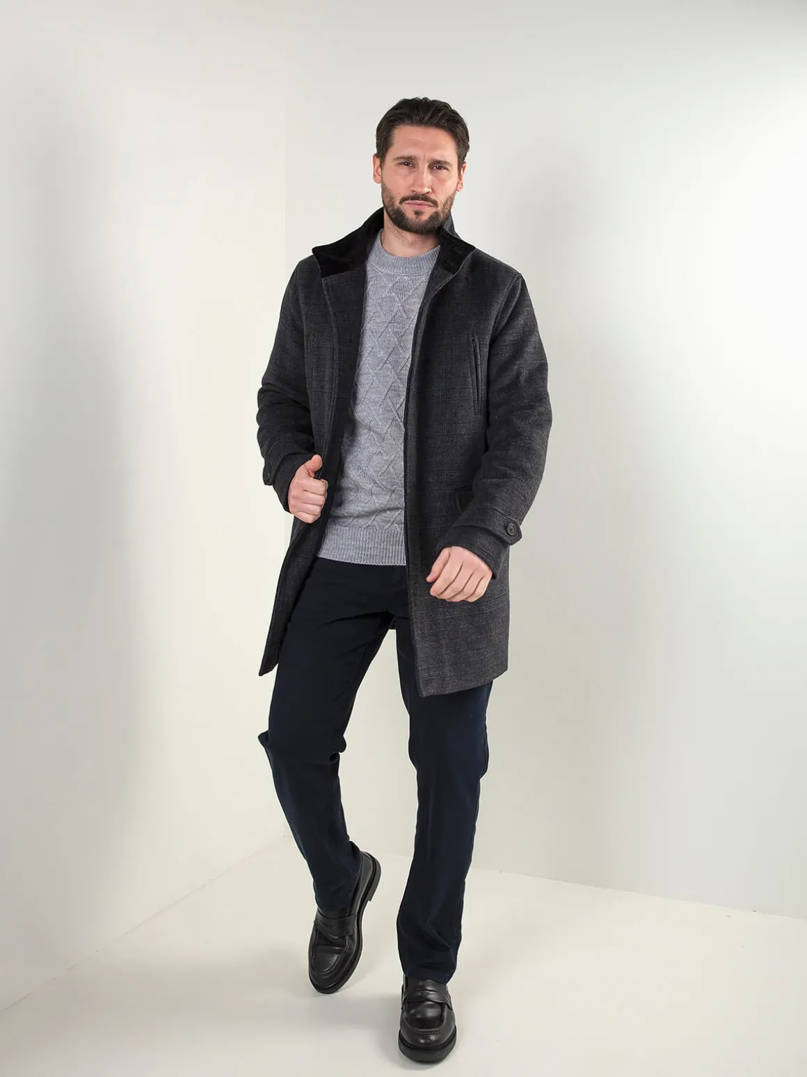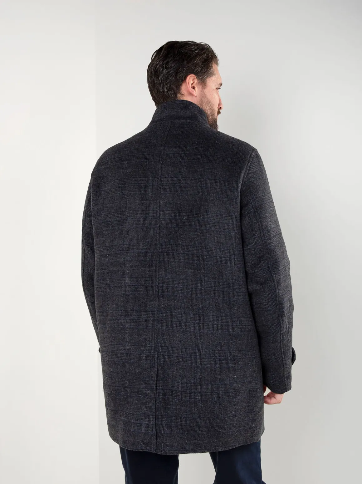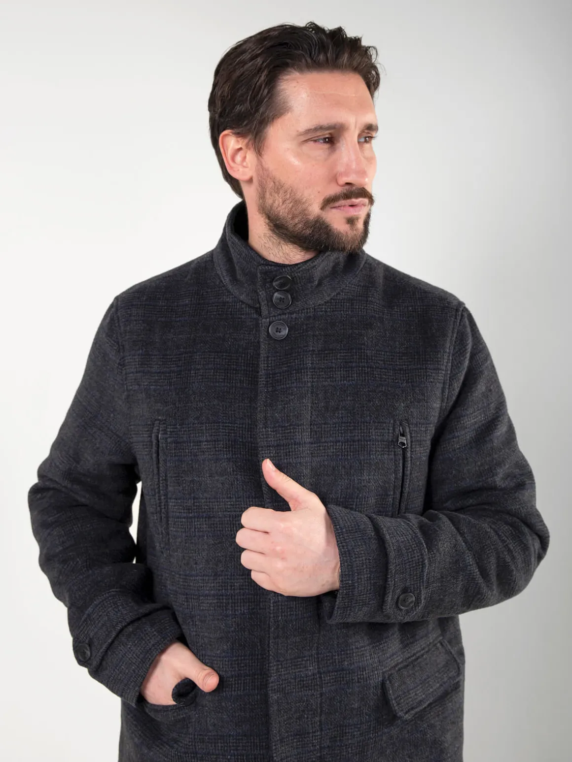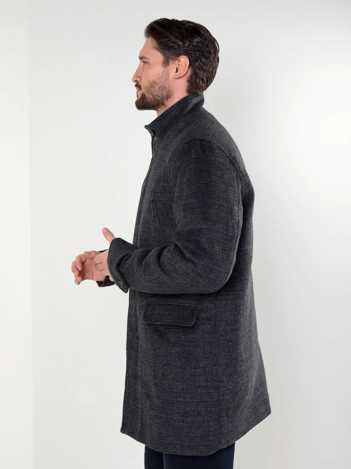 Sobretudo xadrez cinza escuro com gola subida