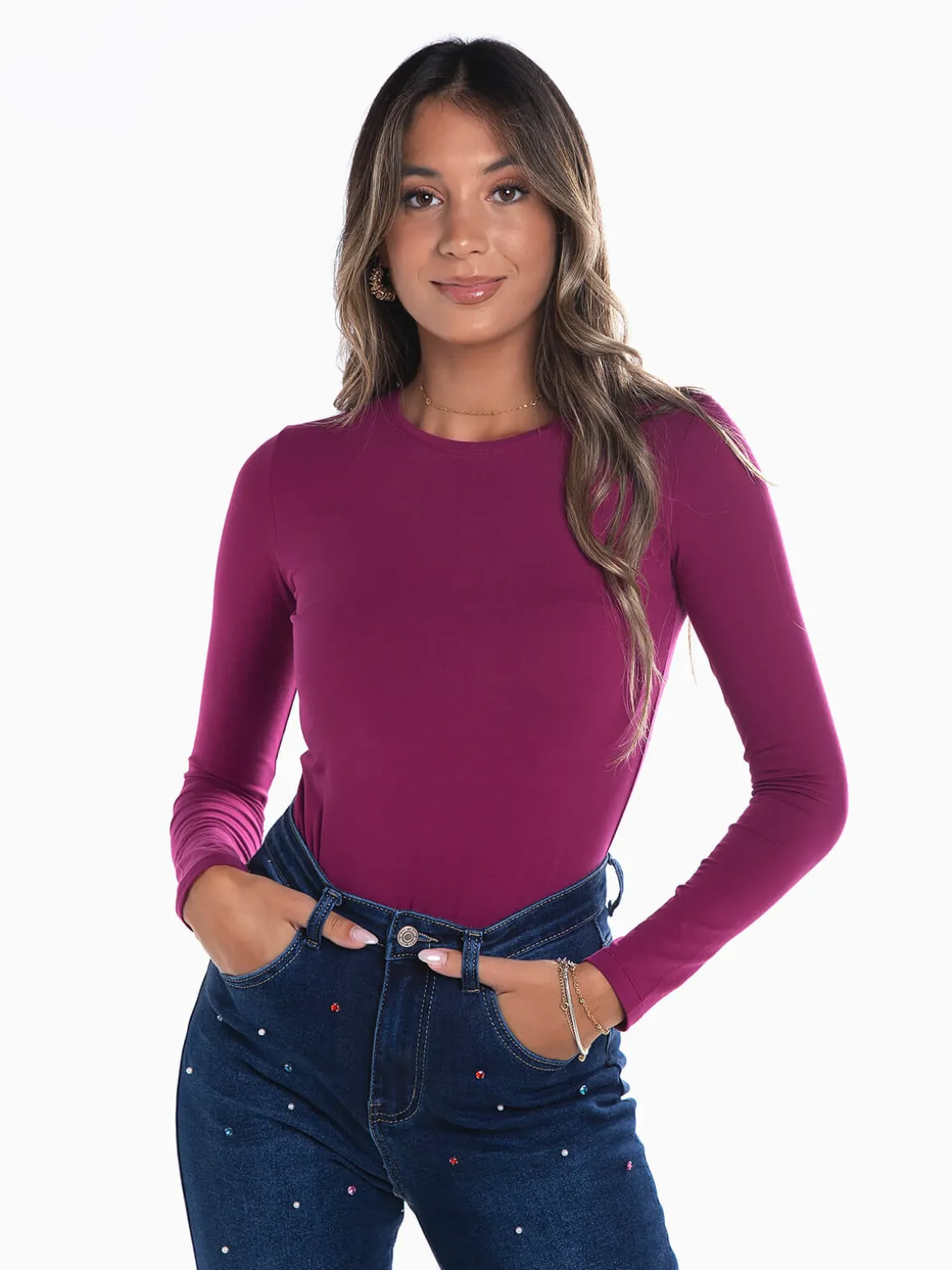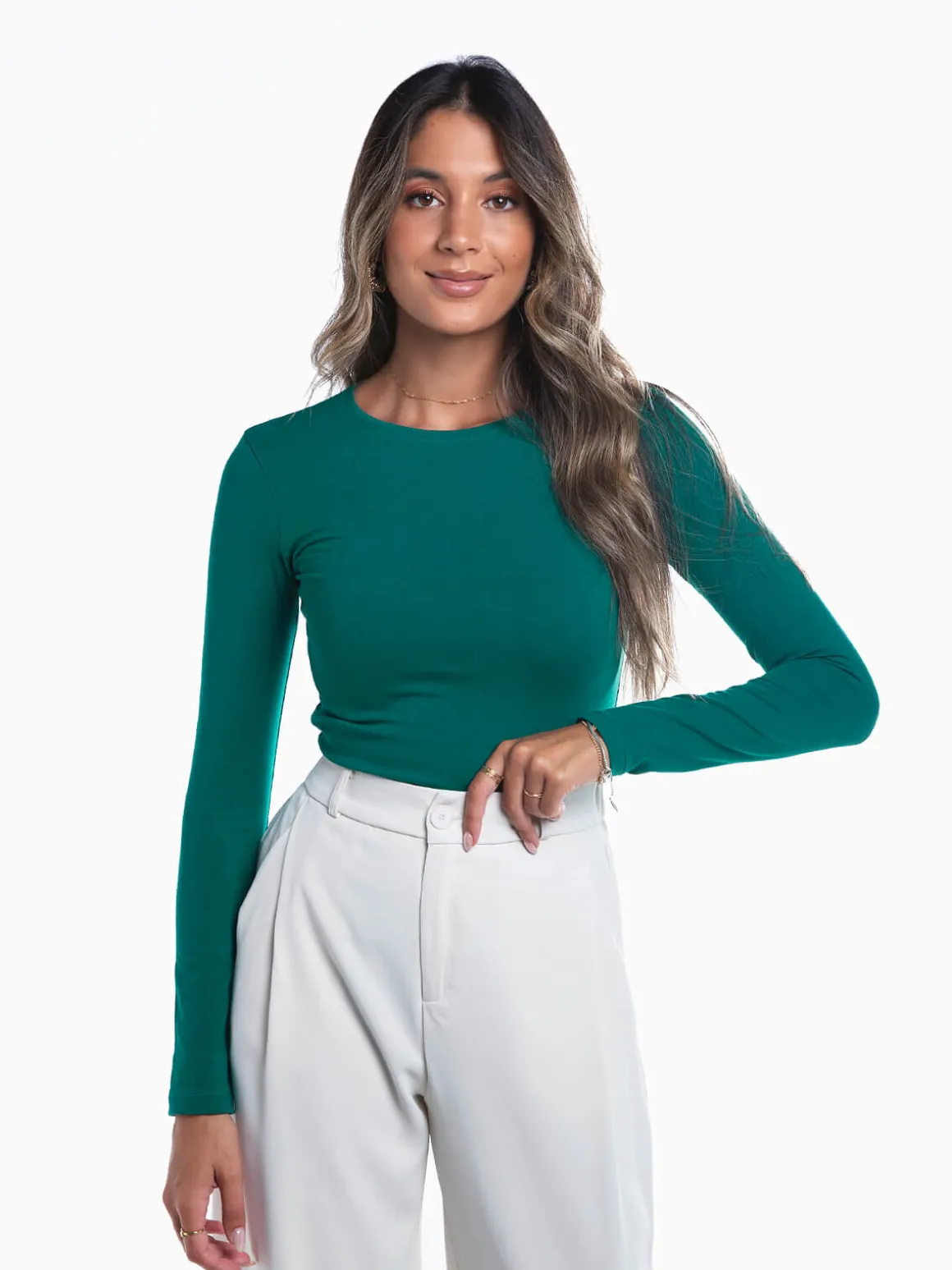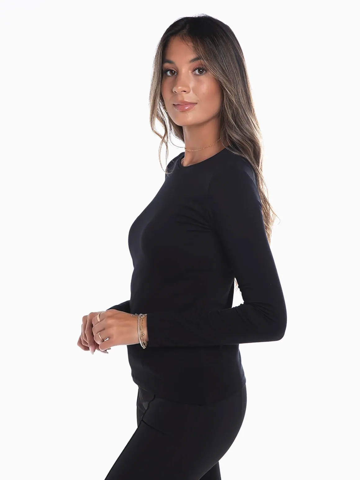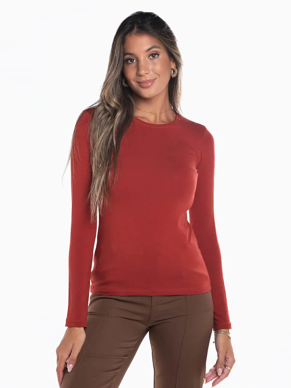 T-shirt cardada de manga comprida para senhora. T-shirt básica com decote redondo. Altura da Modelo: 175 cm | Tamanho: S