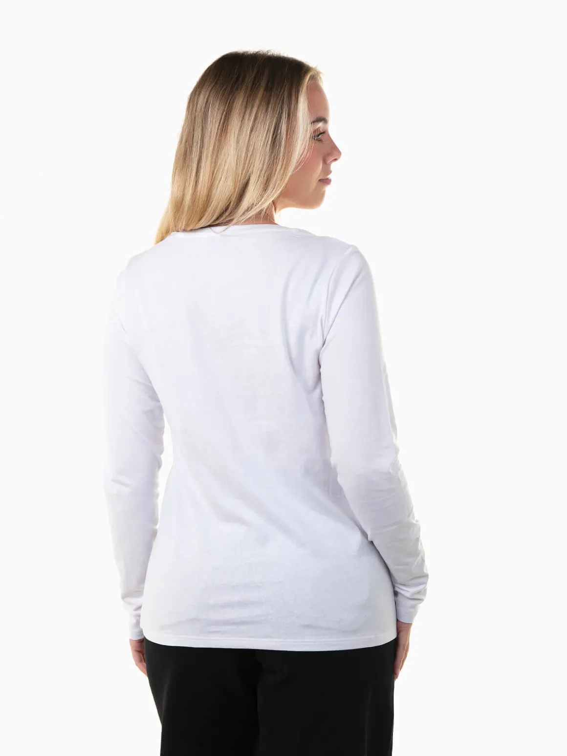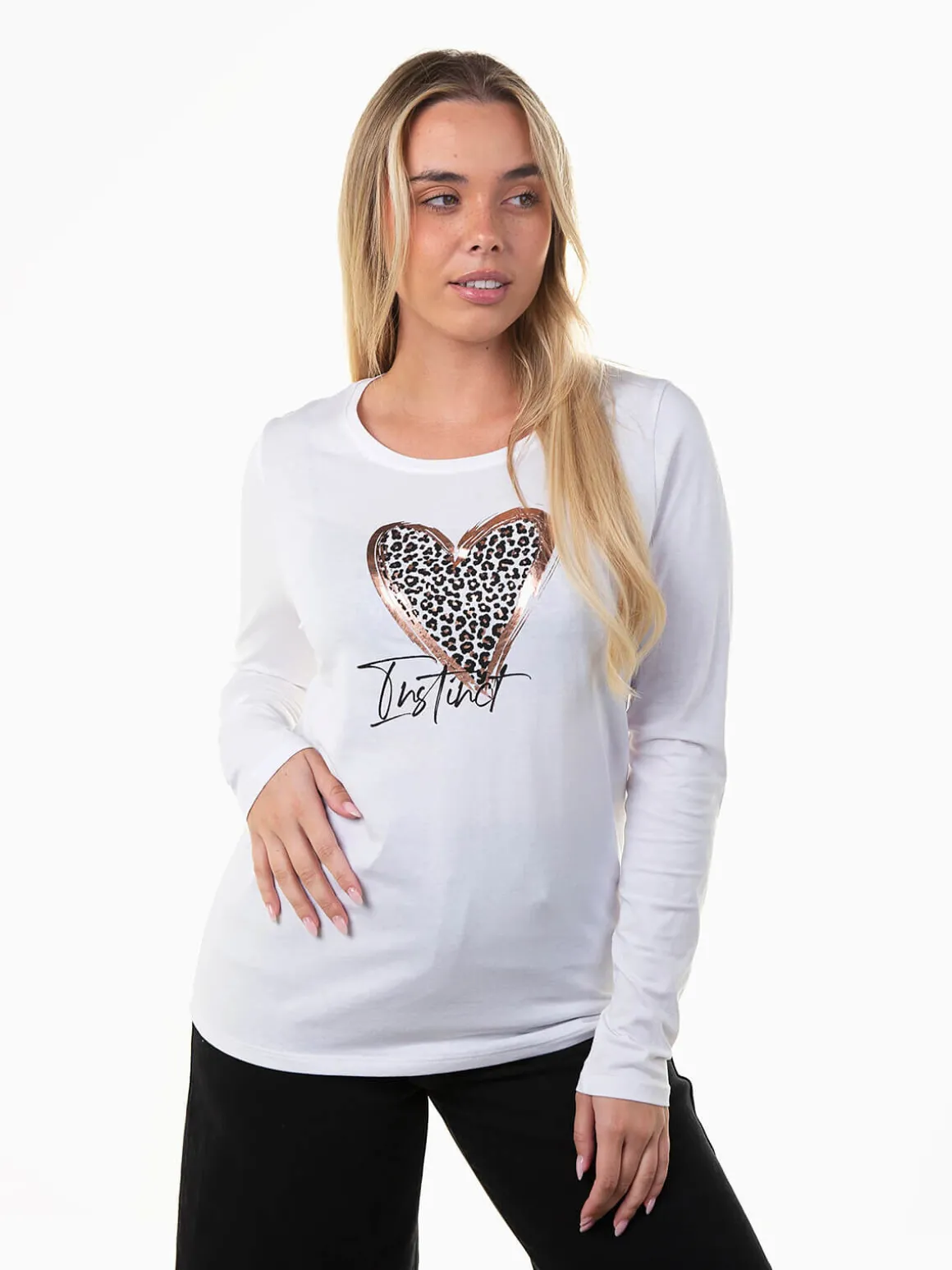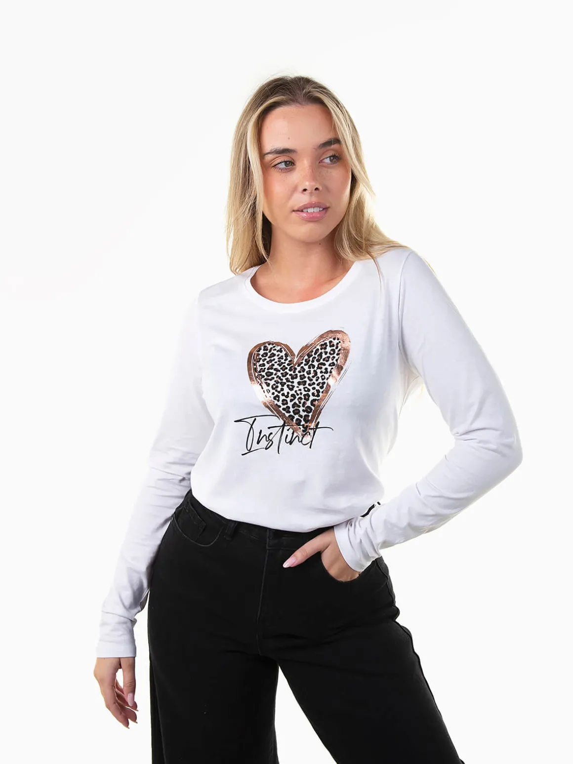 T-shirt de manga comprida com decote redondo e detalhe de coração em animal print no peito. Uma peça confortável e versátil, perfeita para dar um toque moderno a looks casuais. Altura da Modelo: 166 cm | Tamanho: S