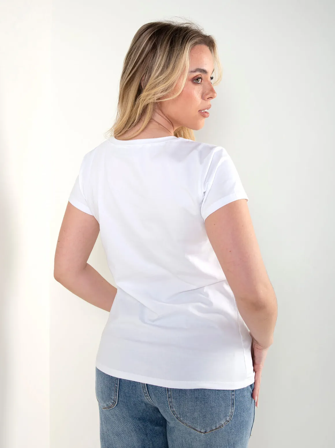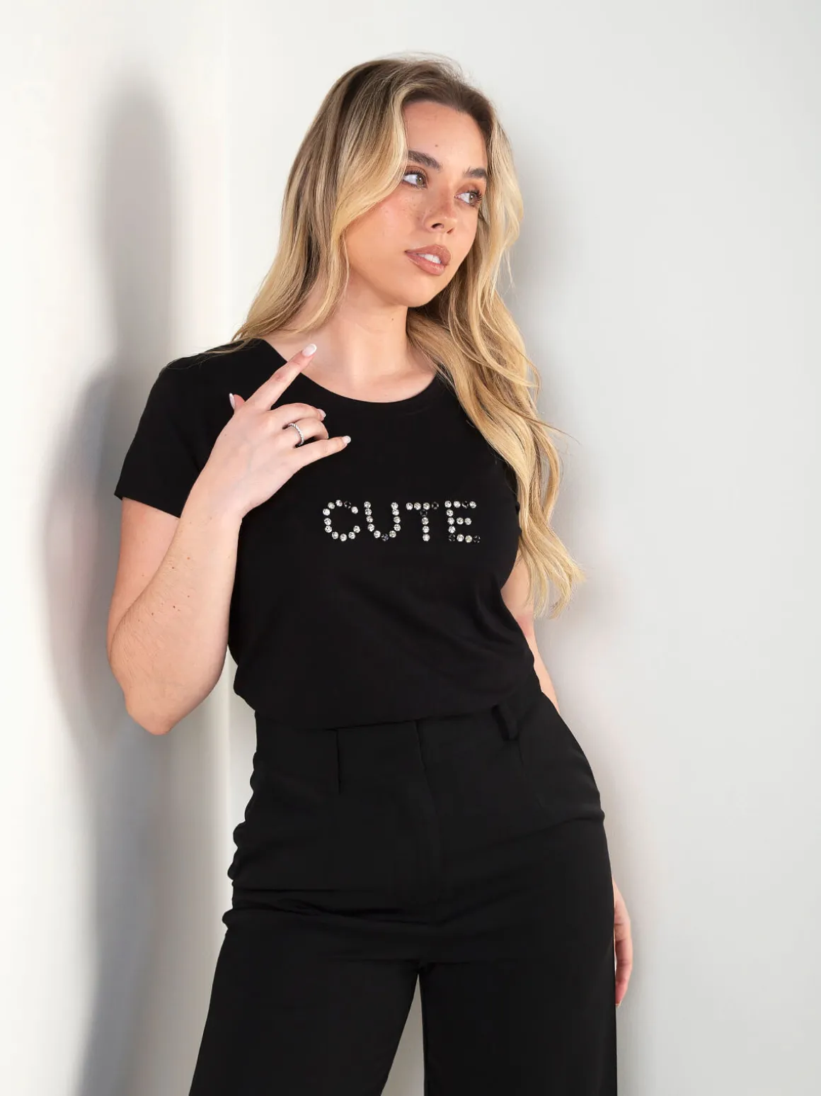 T-shirt de manga curta com aplicação de strass “CUTE” na parte frontal. Uma peça simples com um toque brilhante para looks casuais ou mais elegantes.Altura da Modelo: 166 cm | Tamanho: S/M
