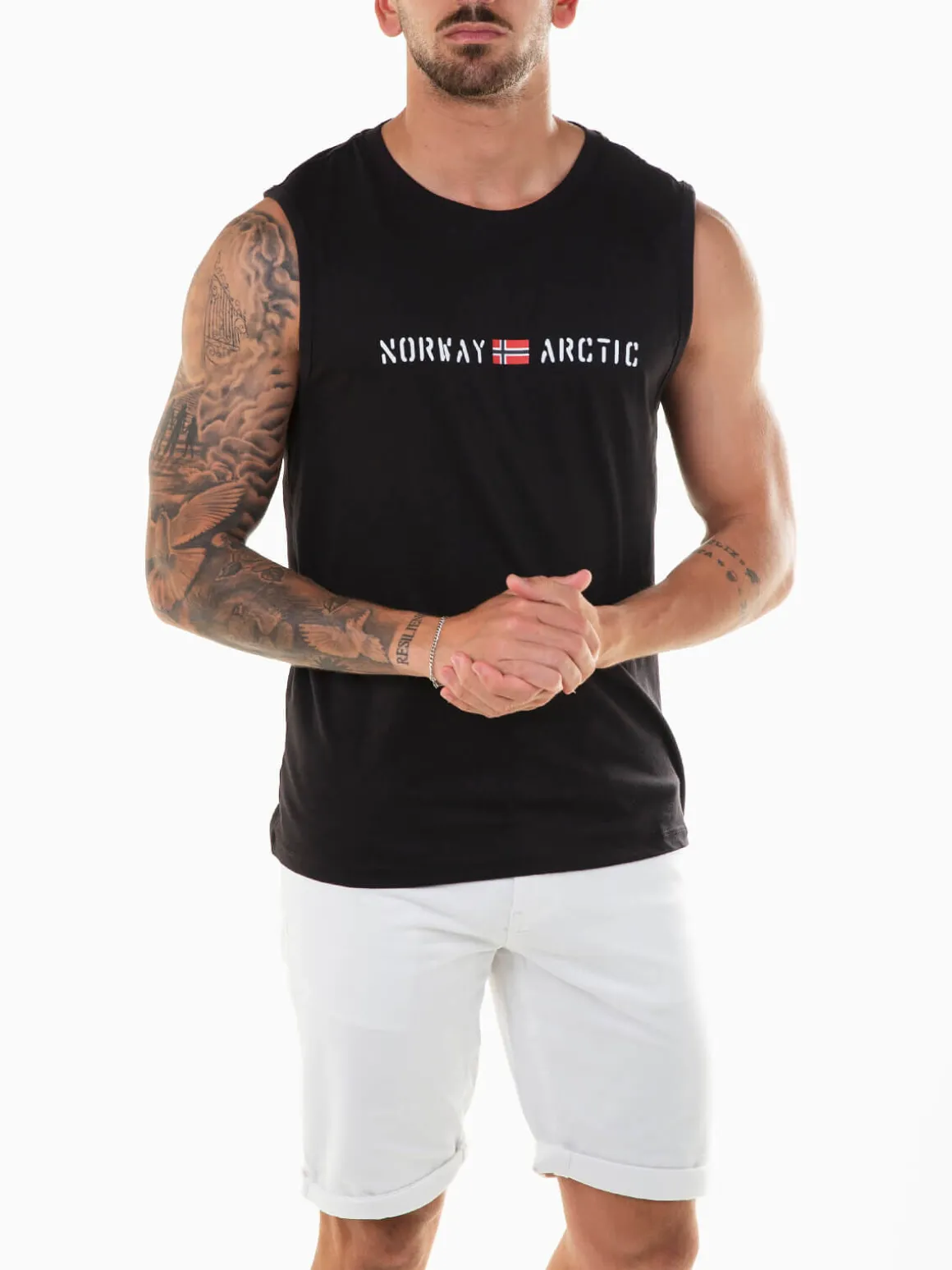 T-shirt preta sem mangas para homem. T-shirt 100% algodão com estampado e gola redonda. Altura do Modelo: 182 cm | Tamanho: M