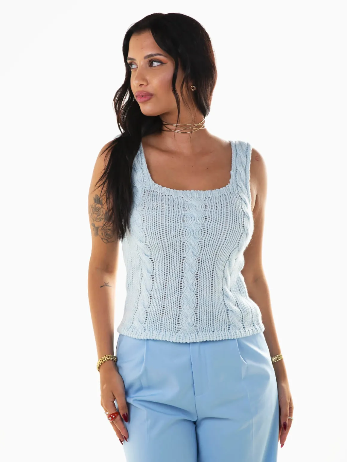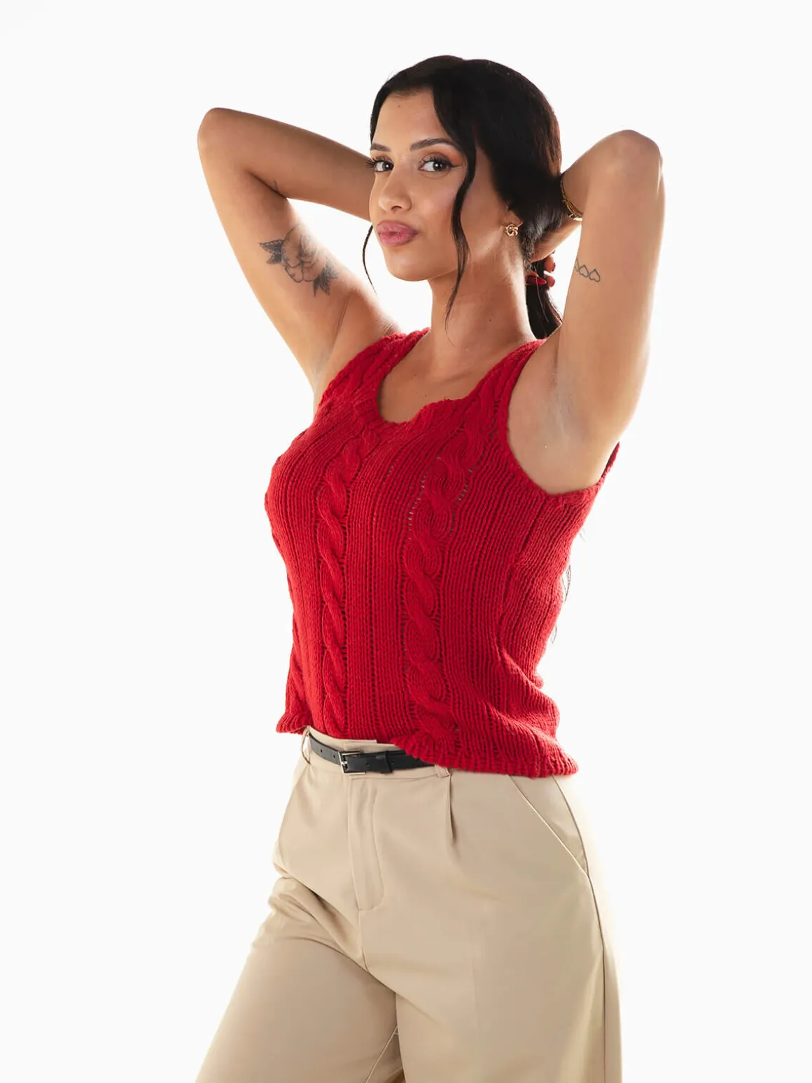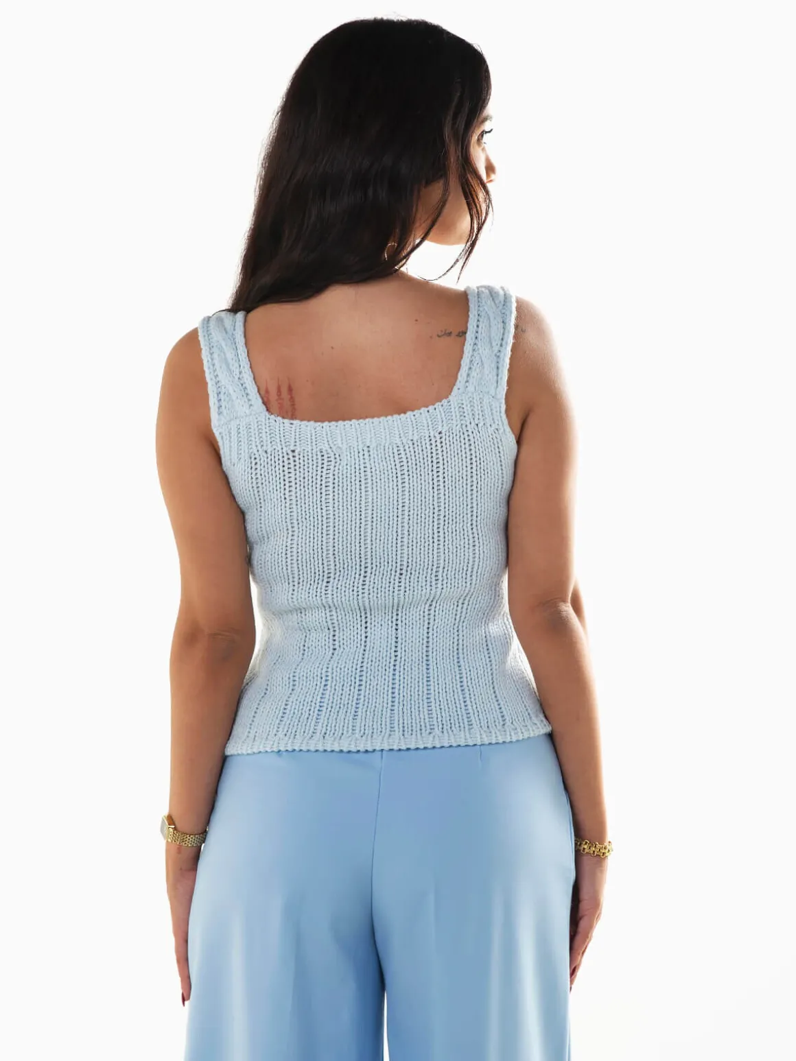Top em malha trançada para senhora. Top justo de alças com decote quadrado. Altura da Modelo: 162 cm | Tamanho: S